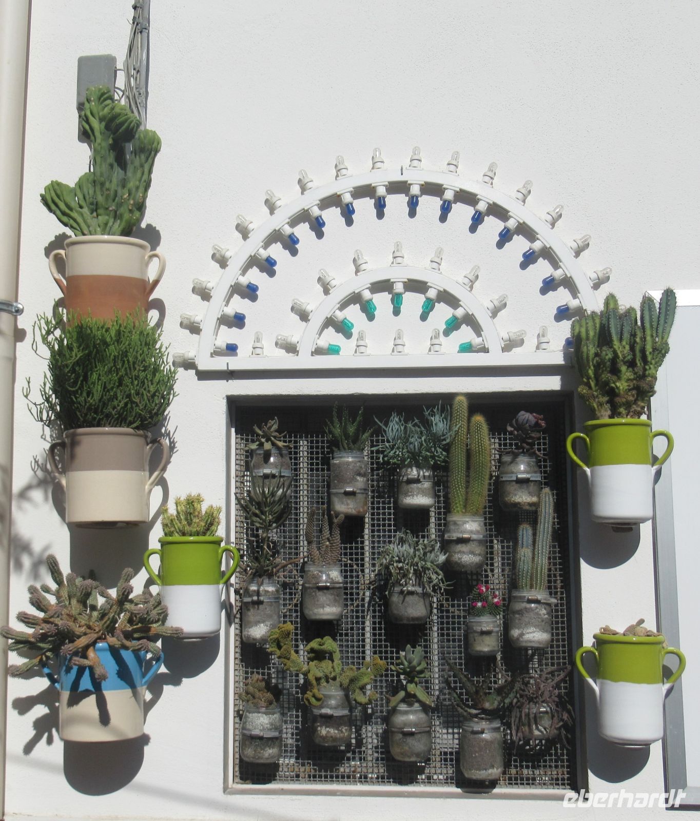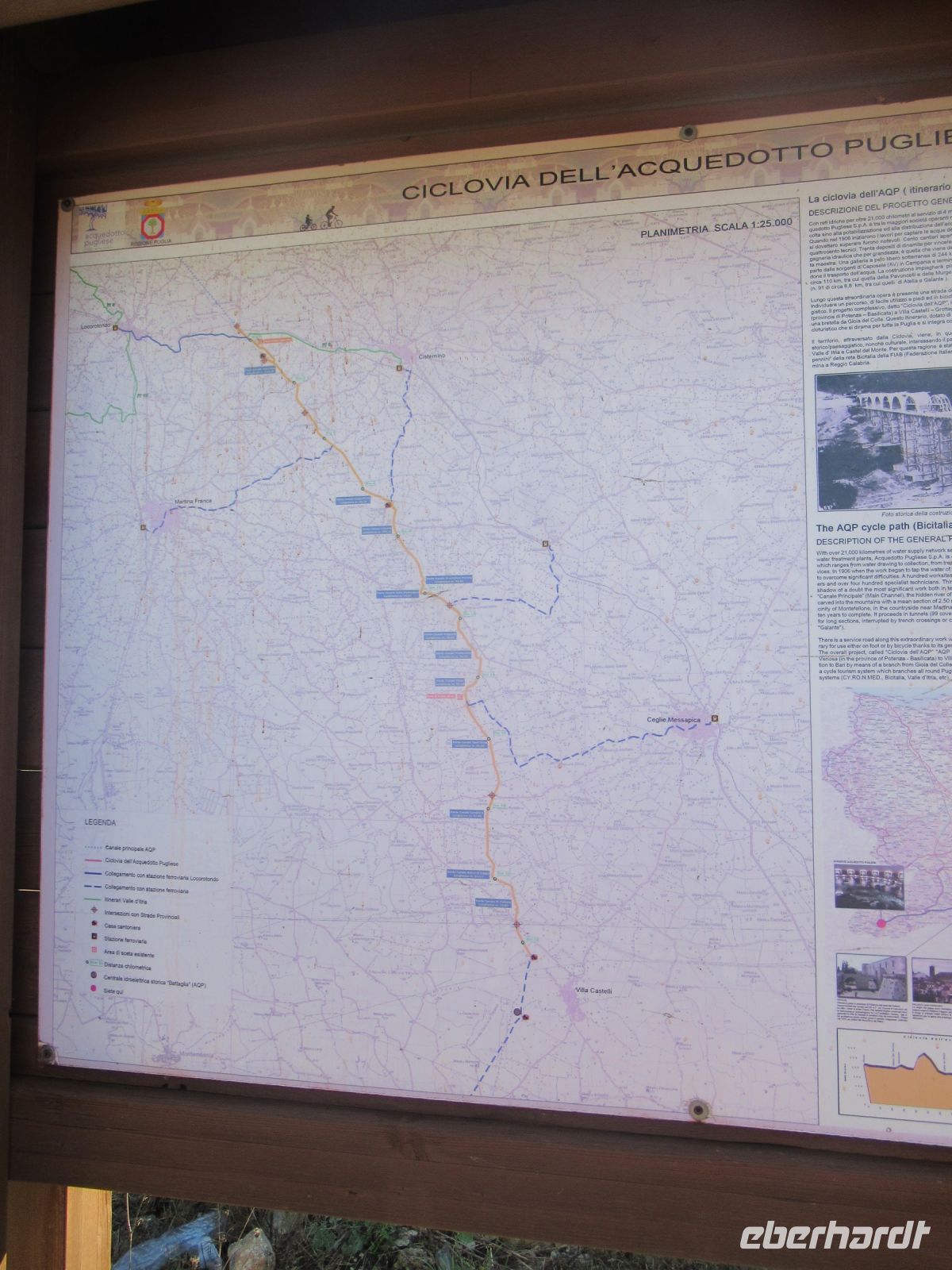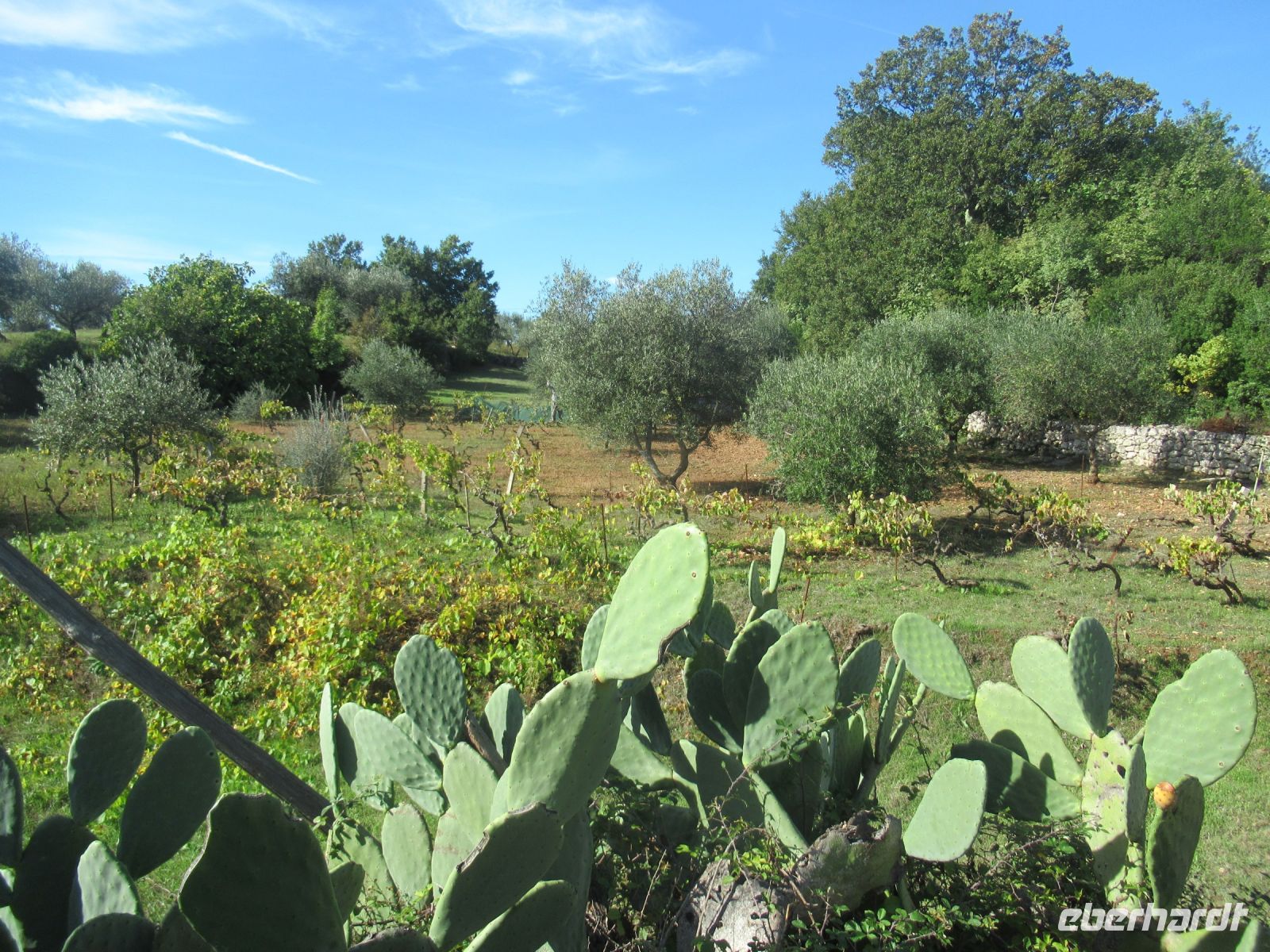 Heute können wir etwas entspannter starten. Frühstück mit einem sehr schönen Büffet und Kaffeeautomaten. Nach dem Frühstück können wir noch die großzügige Hotelanlage erkunden um dann die Region Apuliens zu entdecken. Wir fuhren durch ganz andere, sanfte Landschaften, mit vielen Olivenplantagen, Weinreben, Kirsch- und Pflaumen Wiesen und schönen Steinhäusern, die in die Landschaft gebaut sind. Steinabgrenzungen, trockene Steinbauweise ziehen sich durch die Landschaften und schützen die Felder vom Austrocknen, vor Erdrutschen und starken Regenfällen. Schon unterwegs sahen wir Häuser mit den „Trulli-Dächern“, Alte ursprüngliche aber auch Neue, die an die neugebauten Häuser als Dächer angebaut sind. Wir fuhren durch das Städtchen Loco Rotondo – eine „Runde Stadt“ und an der Stadt Martina Franca vorbei und machen einen kleinen Fotostopp, um die schöne Silhouette von Loco Rotondo einzufangen. Heute ist eine Wanderung an der Strecke des Aquädukts, der die Stadt Bari mit Wasser versorgt hat angesagt. Auch heute agiert „Acquedetto Pugliese“ mit Projekten, die das Ziel haben, jedes Haus mit Wasser zu versorgen. Diese Wege zur Pflege der Wasserversorgung werden heute touristisch für Wanderer und Fahrradfahren genutzt. Wir starten unsere ca. 7 km lange Wanderung und schauen uns die Karte und die Information an der Info-Tafel an. Auf der Strecke mit vielfältigen Pflanzen, Mandelbäumen, Feigenkakteen laufen wir gemütlich wieder bei strahlender Sonne und immer wieder sehen wir in der Landschaft die ursprünglichen aber auch neuen Trulli-Häuser. Wie Zipfelmützen tauchen die rechts und links entlang der Strecke auf. Es sieht, wie in einem Märchenland aus. Man denkt, es kommt gleich ein Zwerg aus dem Häuschen raus. Katrin erklärt uns die Bauweise der Trulli Häuser. Die Trullis wurden ursprünglich von Einheimischen für landwirtschaftliche Zwecke zur Aufbewahrung von Lebensmitteln geschaffen.