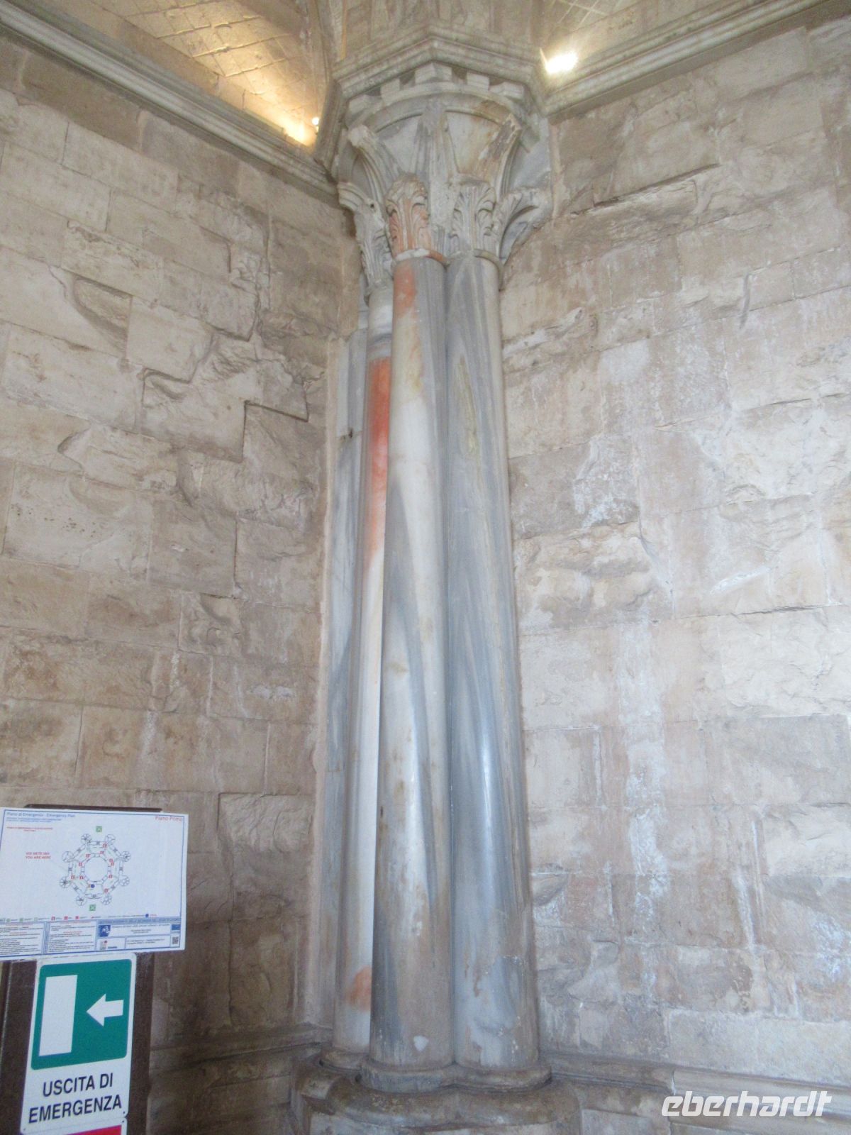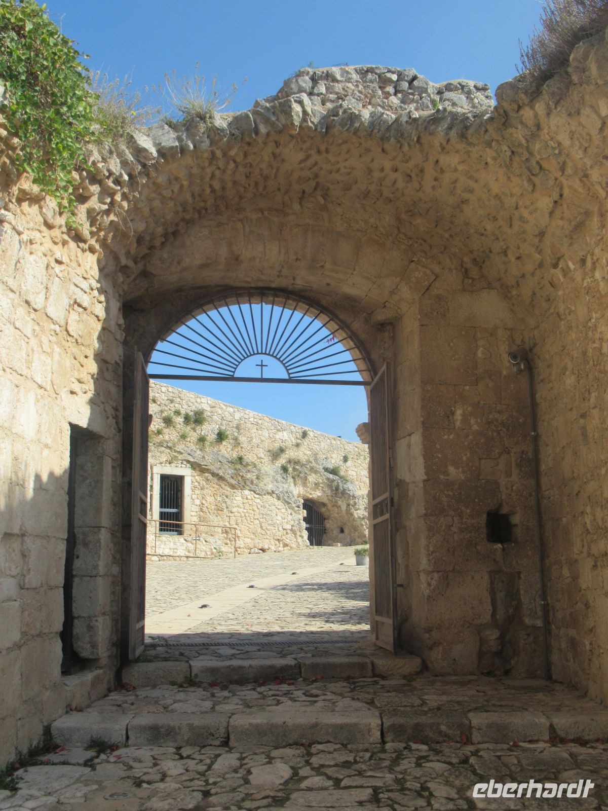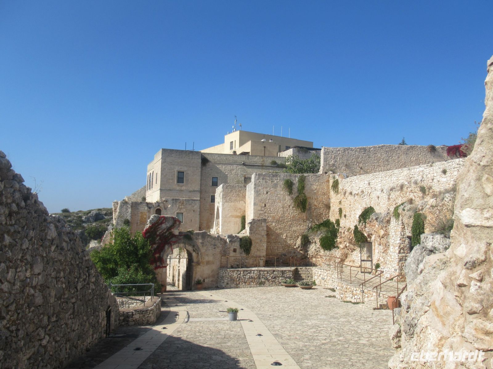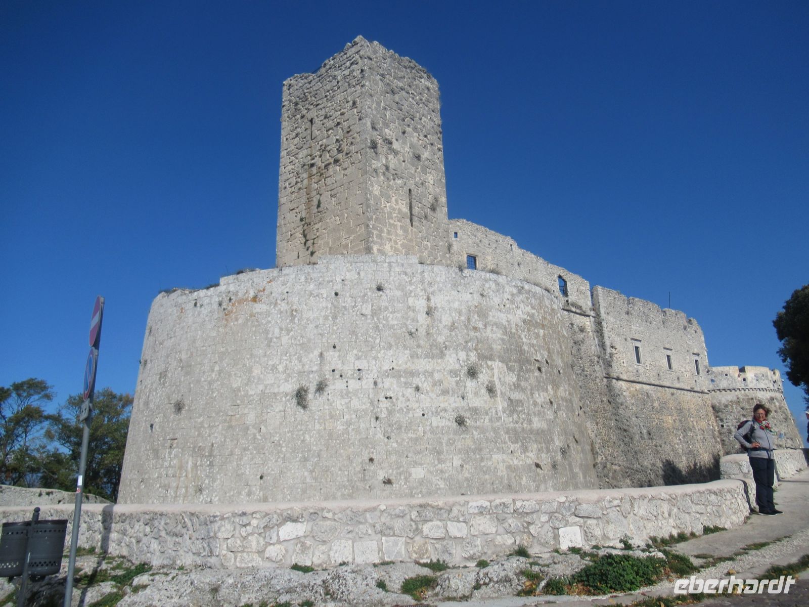 Gut gestärkt und ausgeruht geht es weiter zu unseren letzten Stopp des Tages : Monte San Angelo. Wenn wir noch vor 20 Minuten in Sonne und Windstille picknicken konnten, kam uns hier ein kalter Wind entgegen. Gleich am Eingang das Castello Normano erklärte uns Katrin die Geschichte zum Castello, das wir leider nicht von Innen besuchen konnten. Durch die engen Sträßchen und Souvenirgeschäften gelangen wir zu großem Marktplatz mit der Grottenkirche San Michele. Die Grottenkirche, die dem Erzengel Michael geweiht ist zählt zu den ältesten Pilgerorten und wurde im Jahre 2011 in die Liste der UNESCO Weltkulturerbe aufgenommen. Nach der Erklärung von Katrin vor der Kirche, erkunden wir die Kirche im Inneres des Berges. Danach spazierten wir durch das verwinkelte Städtchen nach unten, einige Gäste besuchten noch die