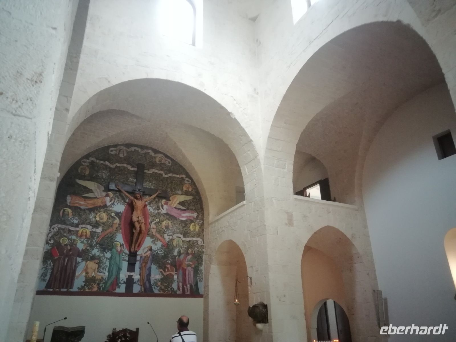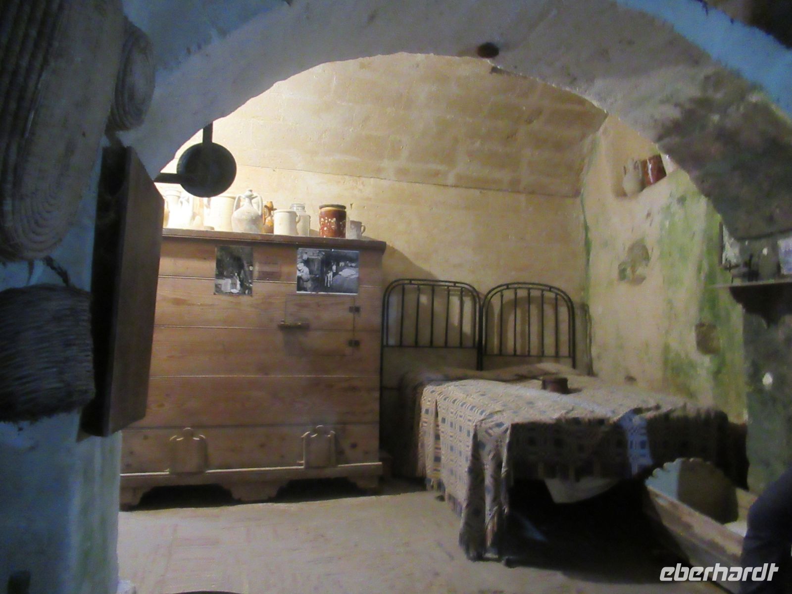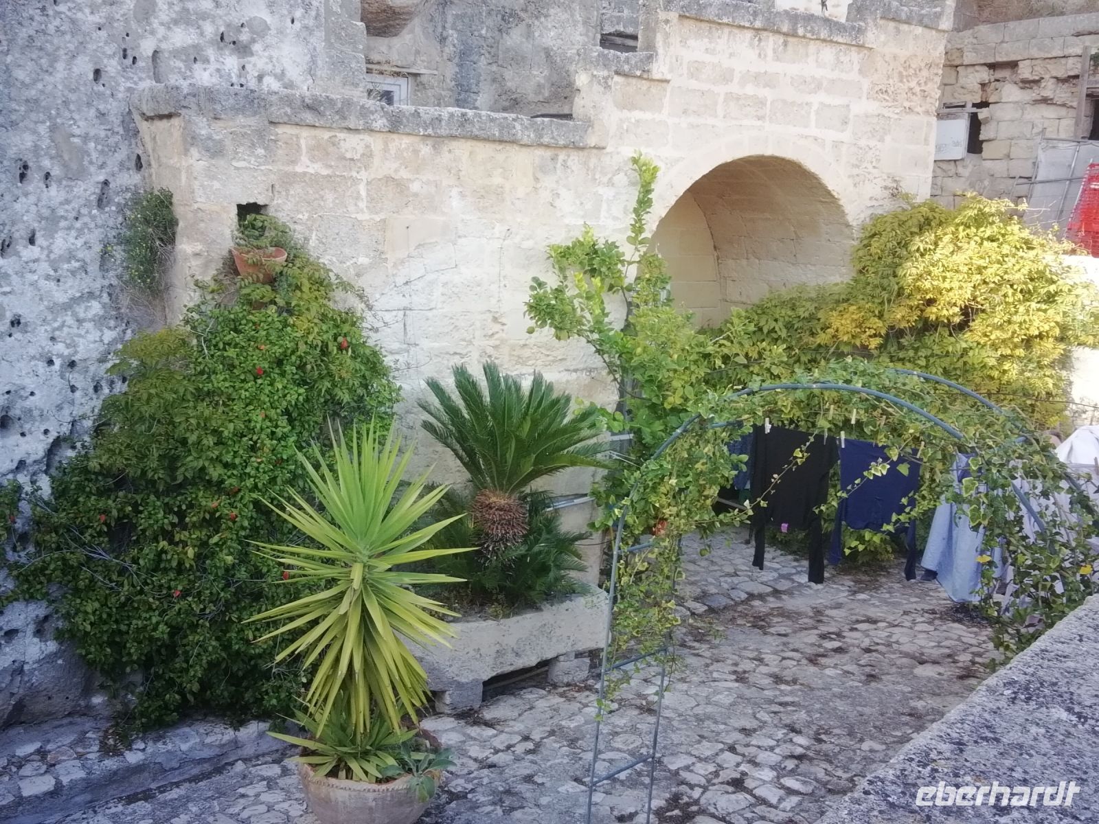 In den Felsen der Schlucht legten die Einwohner Wohnhöhlen an. Anfangs nutzten die Sassi die natürlichen Höhlen als Unterkunft, später wurden sie in den Sandstein gehauen. So entstand im Laufe der Jahrtausende eine Höhlenstadt in dem Felsen, die noch bis in die 1950er-Jahre benutzt wurden. Die Höhlenwohnungen galten als nationale Schande und wurden 1954 geräumt. Hier lebten zu jener Zeit ca. 20.000 Menschen. Sie wurden in die neu errichteten Stadtteile von Matera umgesiedelt. Erst Mitte der 1980er-Jahre erkannte man den kulturhistorischen Wert der Höhlen-Altstädte, einige der Höhlen-Häuser wurden saniert und als Museen, Hotels oder Lädchen umgestaltet. 1993 wurden sie zur Unesco Weltkulturerbe ernannt. Wir sehen uns eine Höhlenwohnung, die als Museum dient, an und gleich daneben die Höhlenkirche. Katrin erklärte uns auch das ausgeklügelte Bewässerungssystem und Sammeln des Wassers von den Dächern und Straßen in Zisternen und Becken, so dass die Sassi auch in trockenen Perioden ausreichend mit Wasser versorgt waren. In 2019 war Matera Europäische Kulturhauptstadt und sie hat für so einige berühmte Filme als Kulisse gedient. Mit vielen Eindrücken spazieren wir dann wieder Richtung Neustadt und haben noch anschließend etwas Zeit Matera selbst zu erkunden. Auf der Rückfahrt bedanke ich mich im Namen der Gäste beim unserer Reiseleiterin Katrin und Fahrer Luigi für die sehr interessante Reise und wir alle nehmen noch Abschied von der wunderschönen Region Apulien.