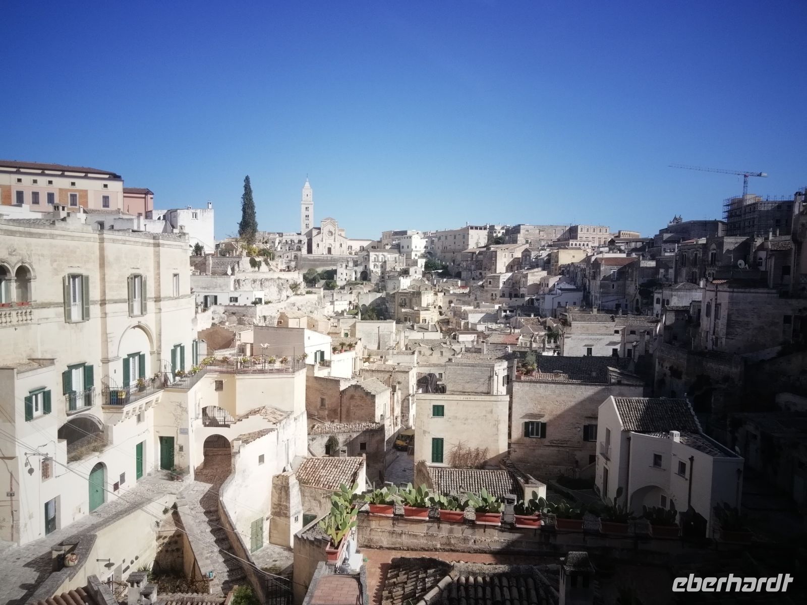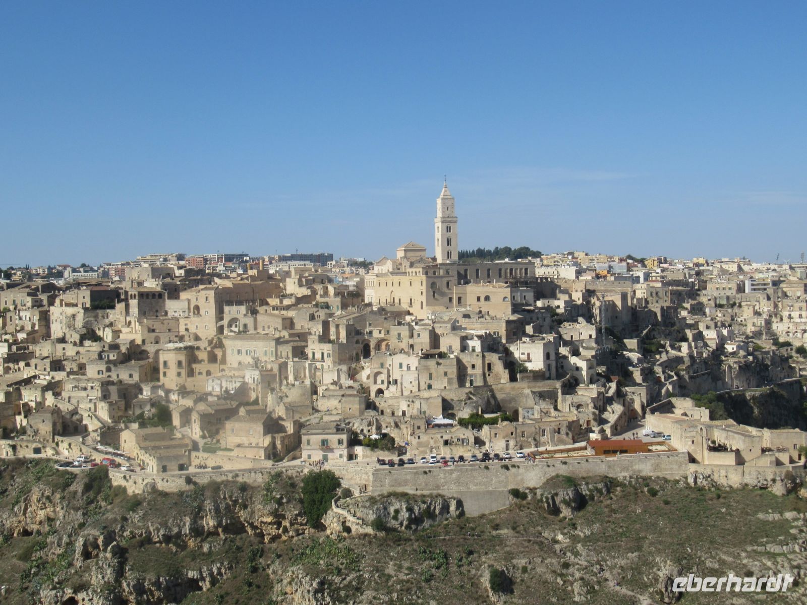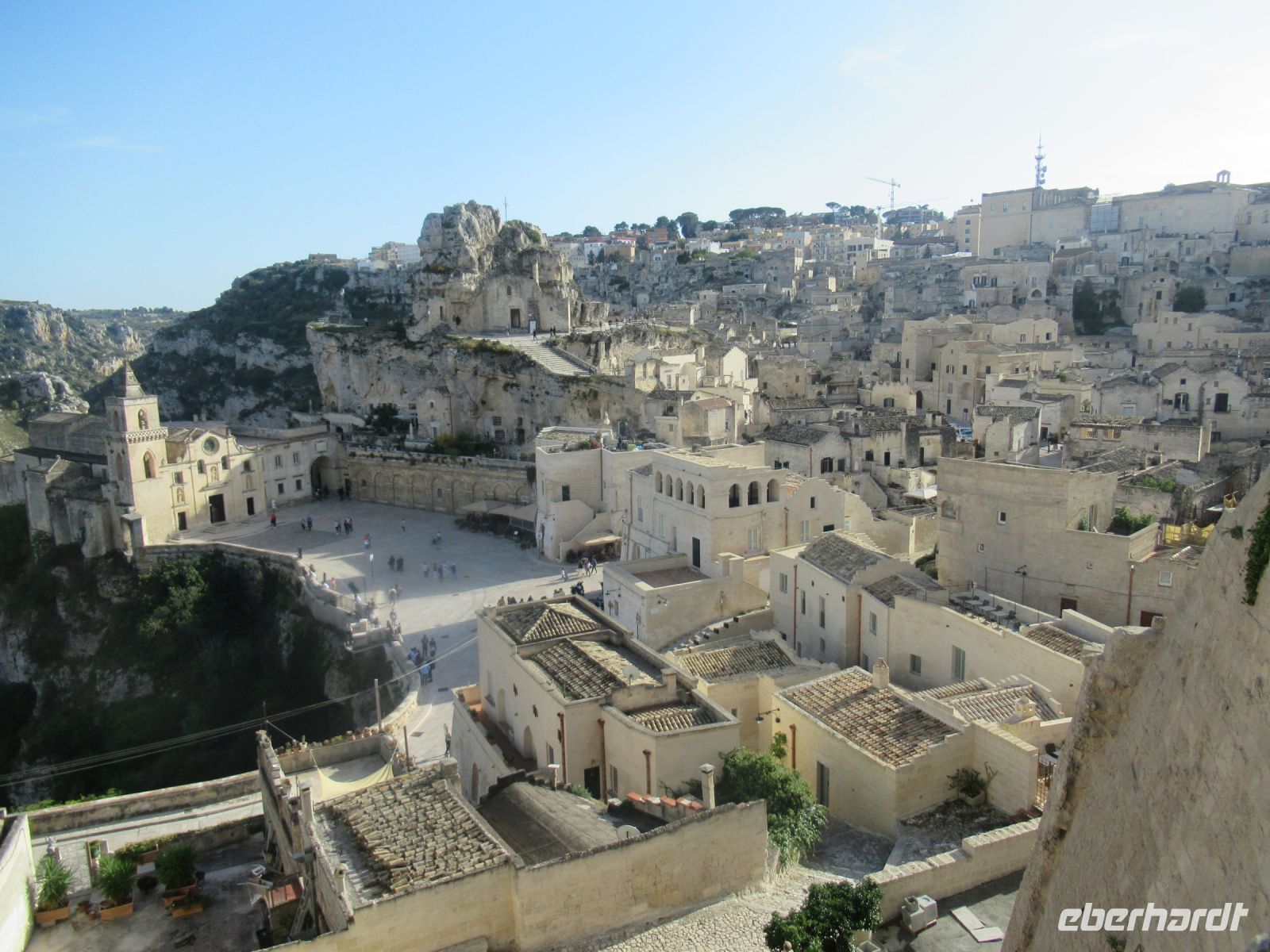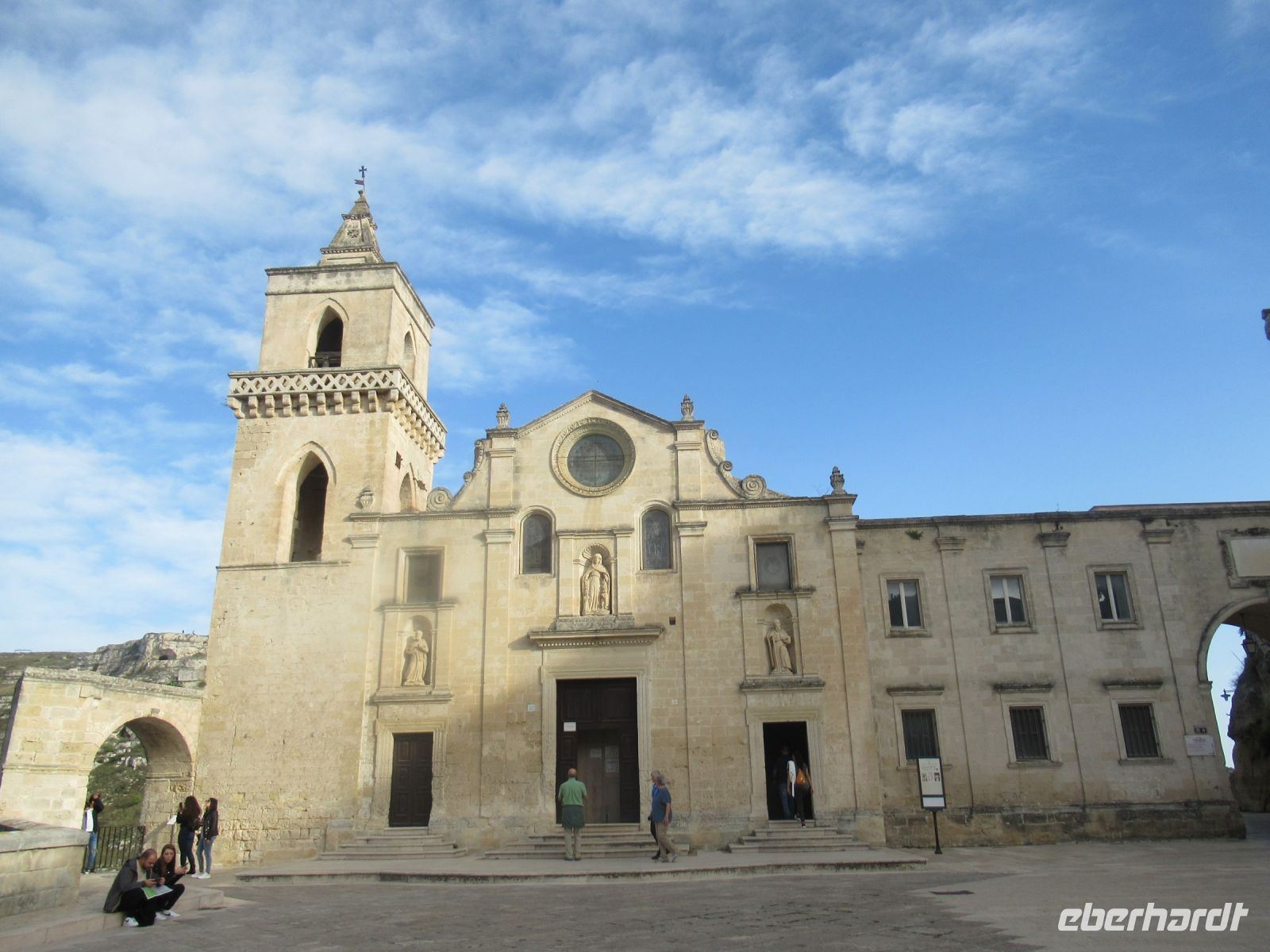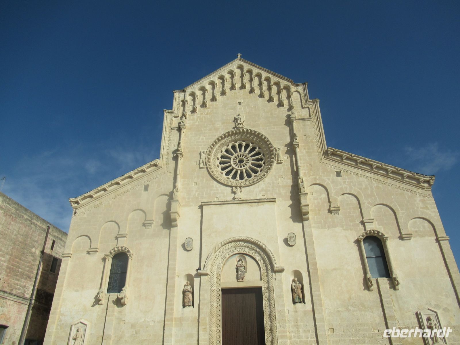 Jetzt geht es nach Matera, die Stadt liegt 400 Meter über dem Meeresspiegel, zählt heute über 60.000 Einwohner und liegt schon in der Provinz Basilikata. Am Busparkplatz steigen wir aus und haben zunächst über eine Stunde Freizeit zum Mittagssnack. Dann treffen wir uns mit Katrin und beginnen den Rundgang durch Matera. An manchen Stellen hat man den Ausblick von oben in die Schlucht. Wir starten an der Cattedrale di Matera - Duomo della Madonna della Bruna mit kurzer Einführung von Katrin. Leider wurde die Besichtigung von Innen nicht eigeplant, was sich einige Gäste gewünscht haben. Wir laufen durch die Stadt etwas Berg ab und auf zu den berühmten Sassi-Höhlensiedlungen.