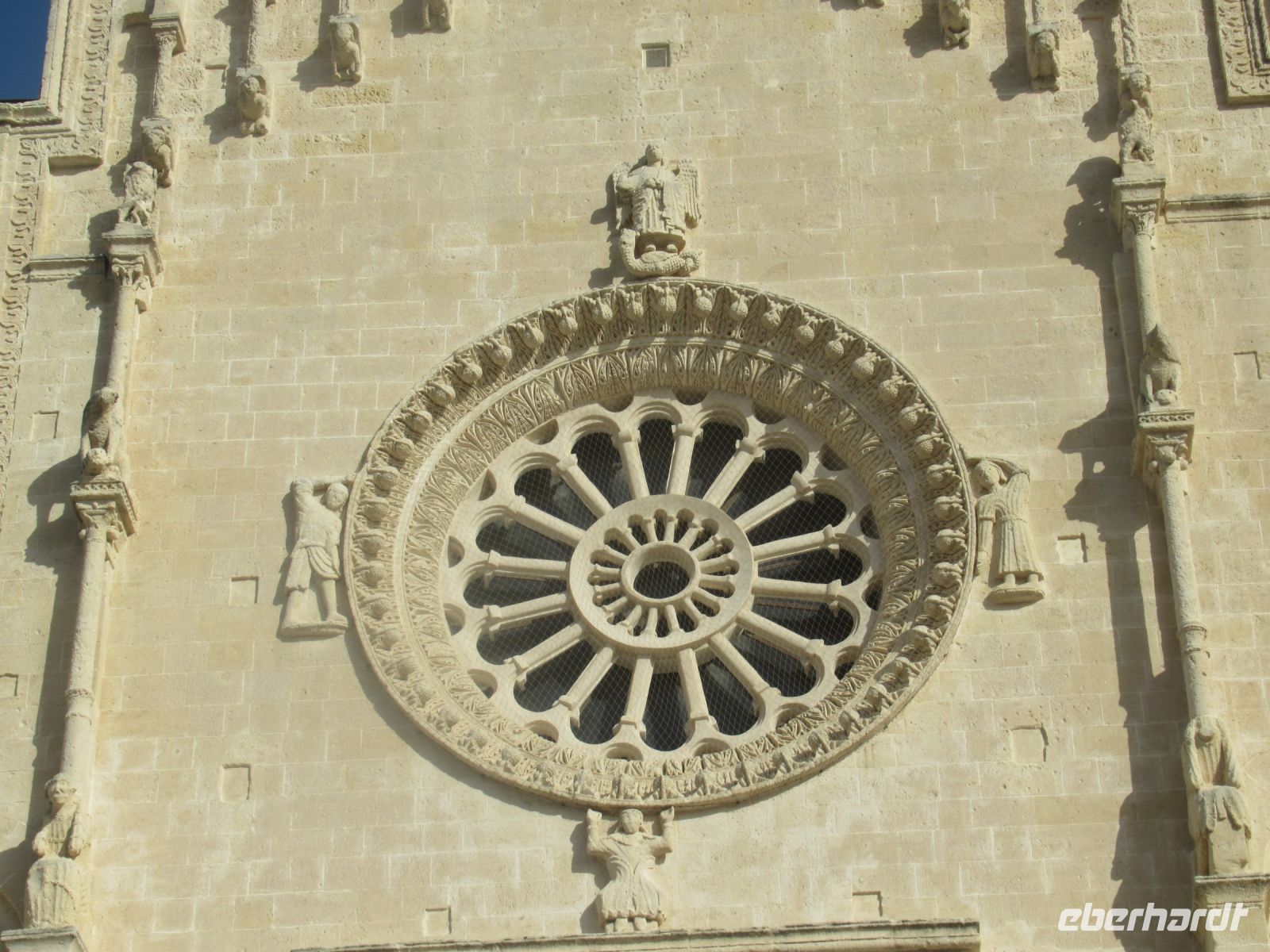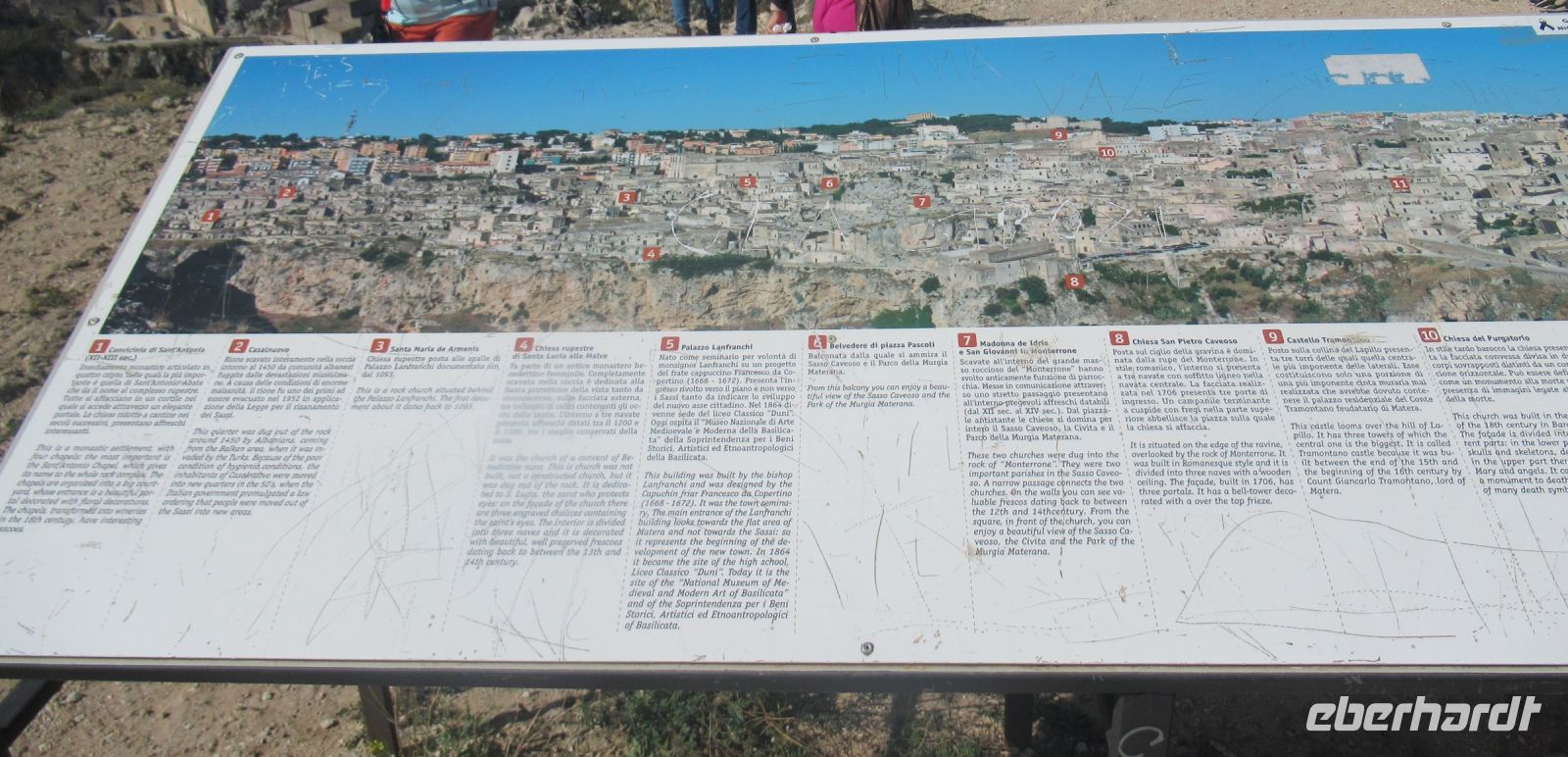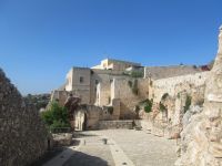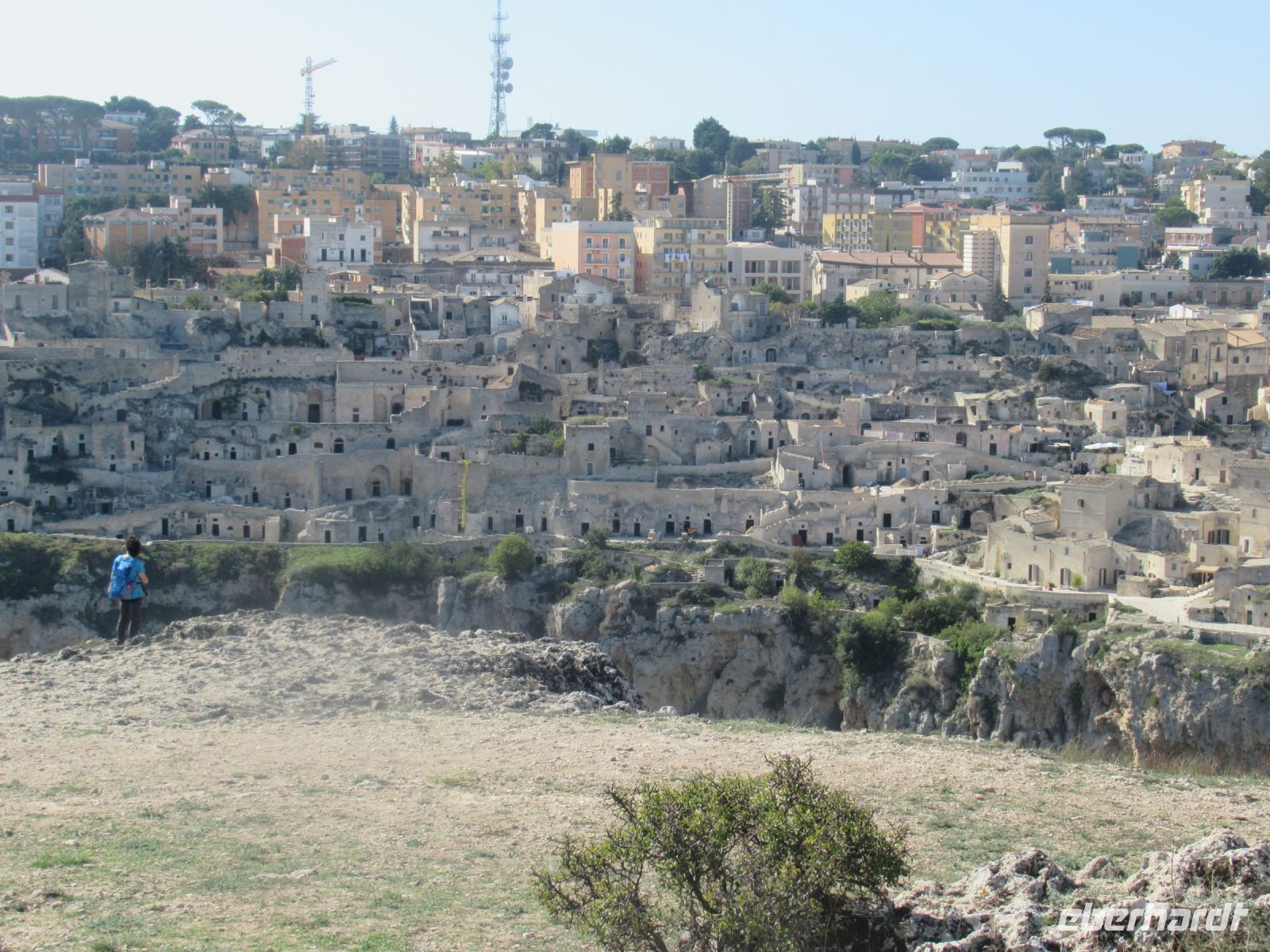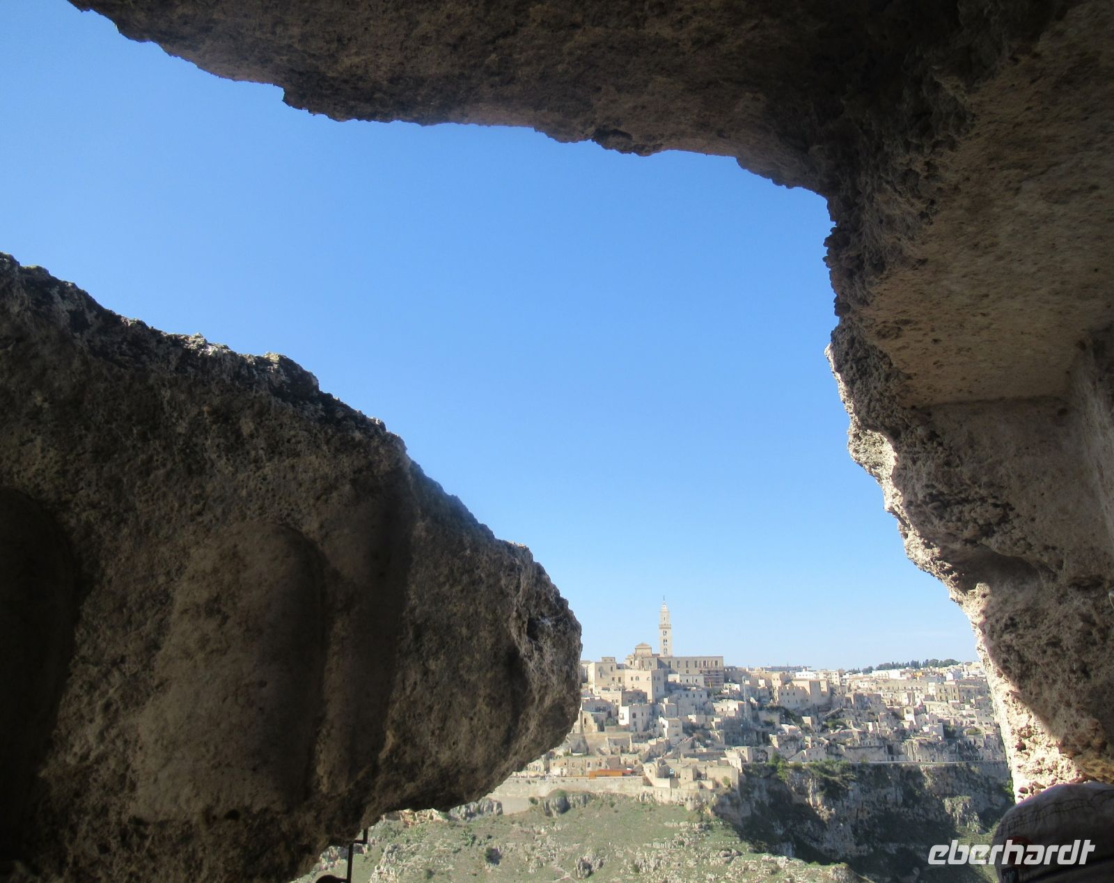Jetzt geht es nach Matera, die Stadt liegt 400 Meter über dem Meeresspiegel, zählt heute über 60.000 Einwohner und liegt schon in der Provinz Basilikata. Am Busparkplatz steigen wir aus und haben zunächst über eine Stunde Freizeit zum Mittagssnack. Dann treffen wir uns mit Katrin und beginnen den Rundgang durch Matera. An manchen Stellen hat man den Ausblick von oben in die Schlucht. Wir starten an der Cattedrale di Matera - Duomo della Madonna della Bruna mit kurzer Einführung von Katrin. Leider wurde die Besichtigung von Innen nicht eigeplant, was sich einige Gäste gewünscht haben. Wir laufen durch die Stadt etwas Berg ab und auf zu den berühmten Sassi-Höhlensiedlungen.