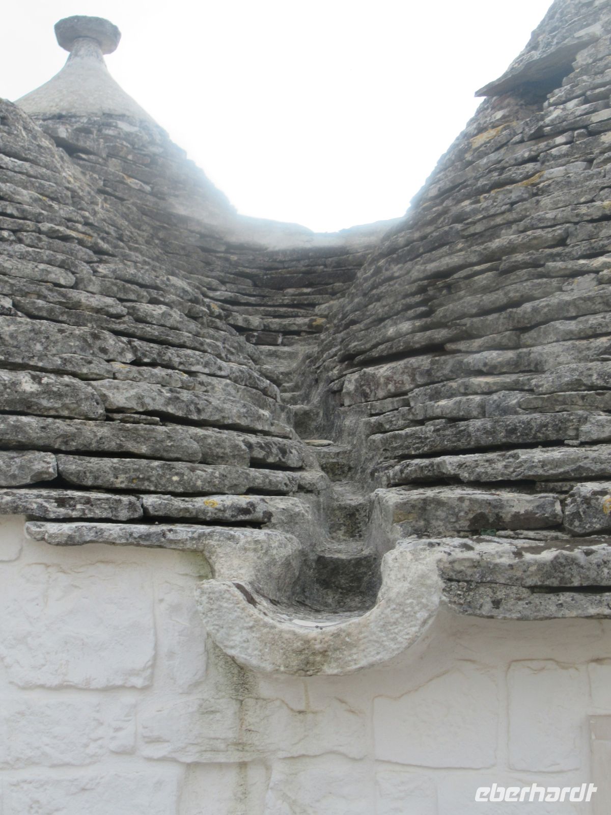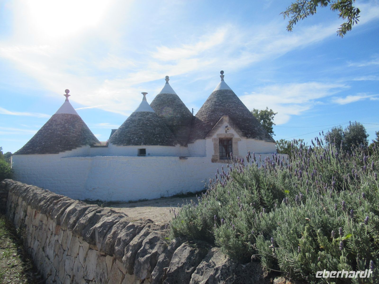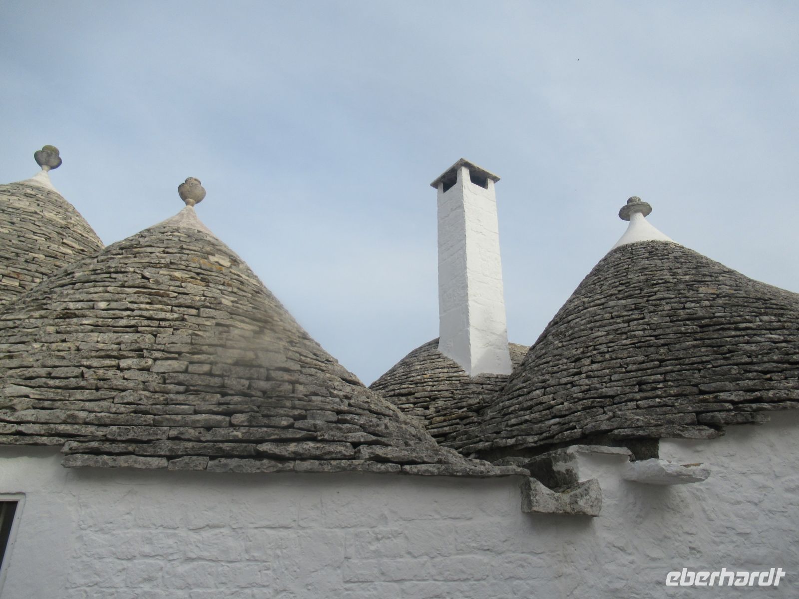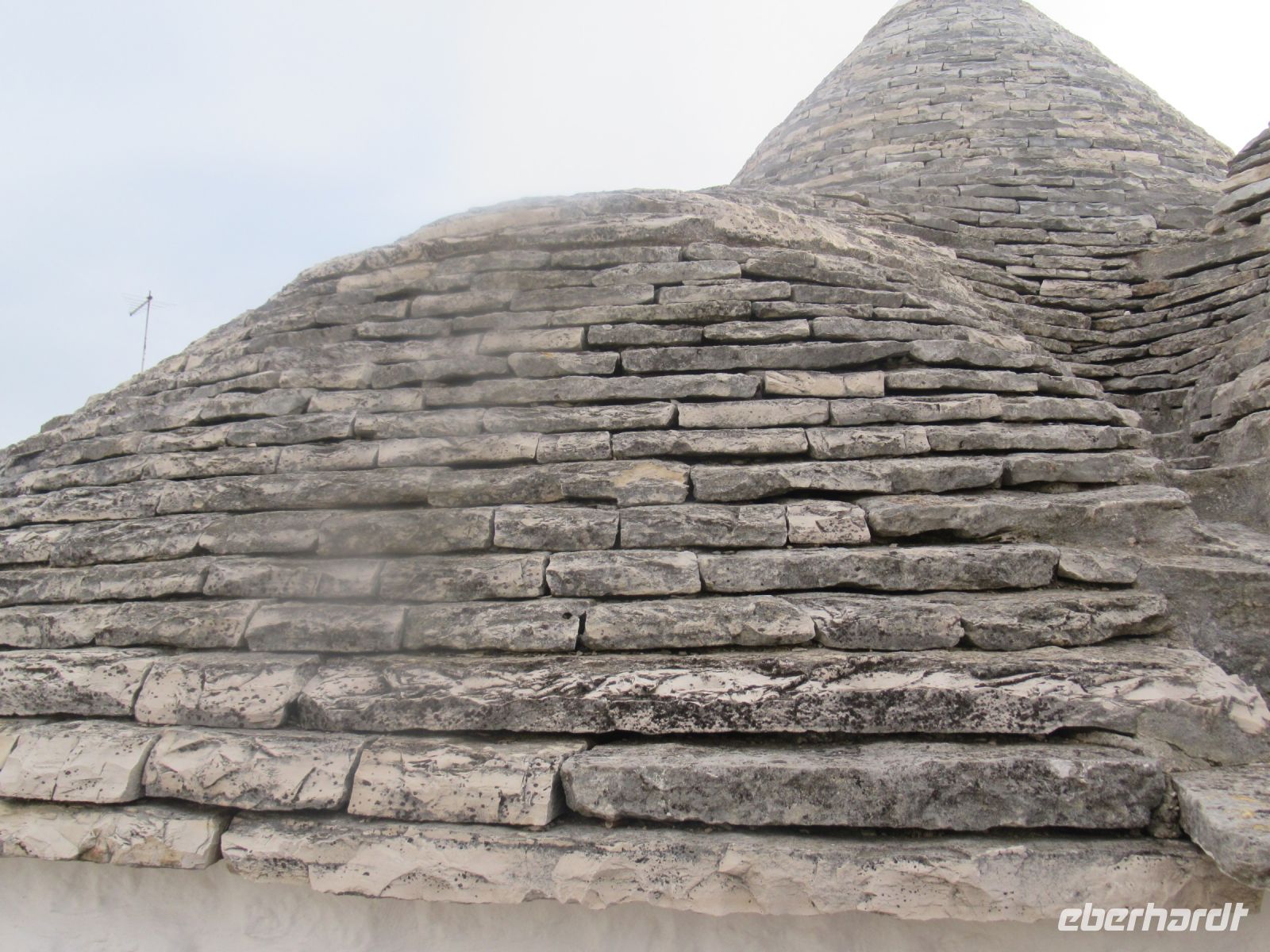 Warum Trulli ? Der Name Trulli bedeutet Kuppel und stammt aus dem altgriechischen. Man setzt auf die quadratische Grundfläche des Hauses die rohen Feldsteine in Trockenbauweise übereinander. Die Kegelform der Dächer ergibt sich durch die schräg aufeinander geschichteten Steinplatten. Die Dachspitze „Pinnacolo“ ist meistens Kugel oder ein Stern. Das Baumaterial liefert die Natur der Region gratis: Steine, Steine, Steine …