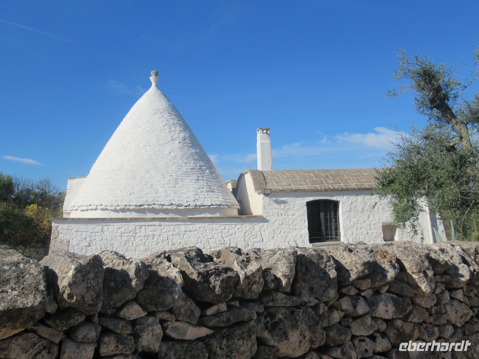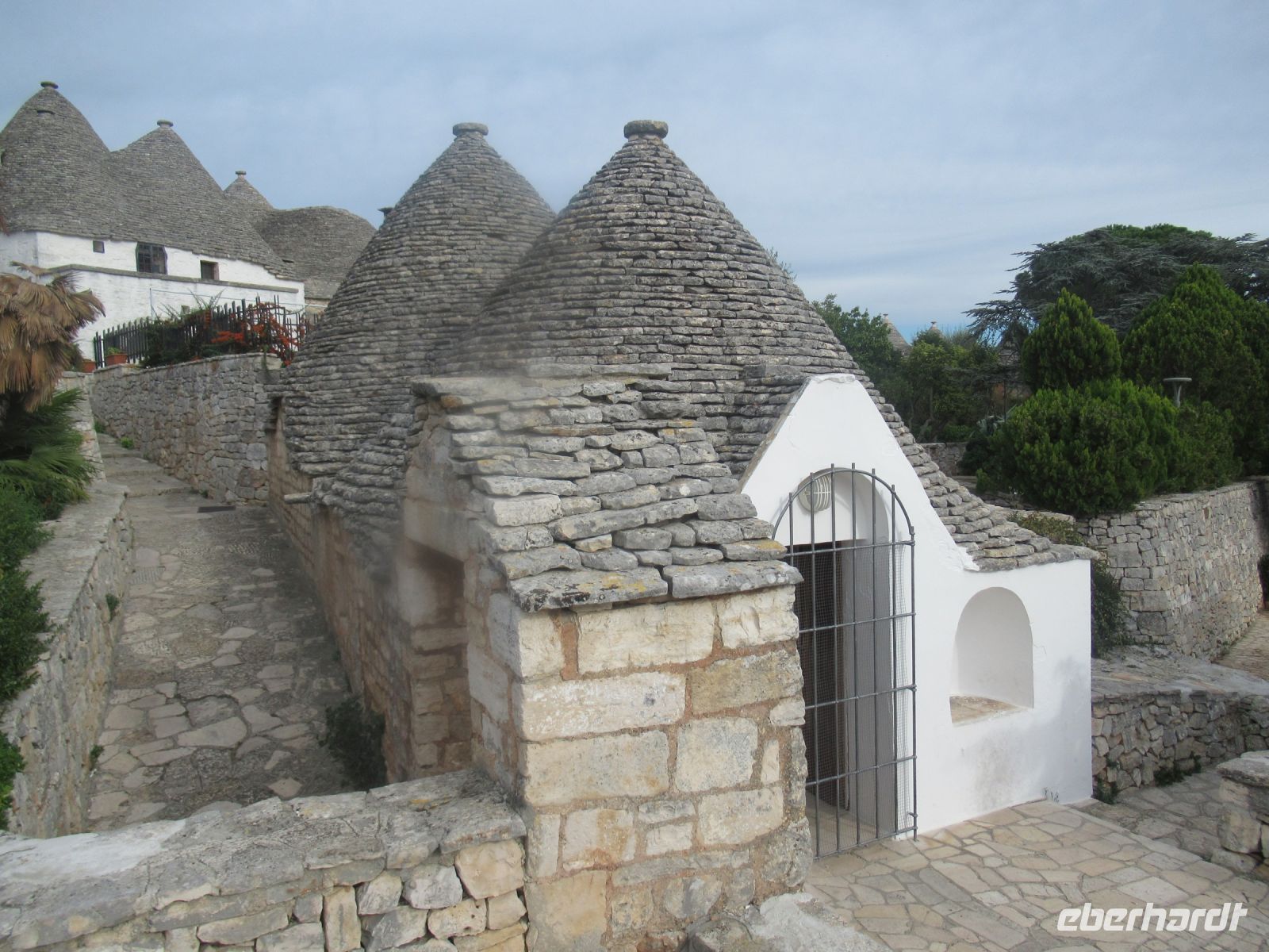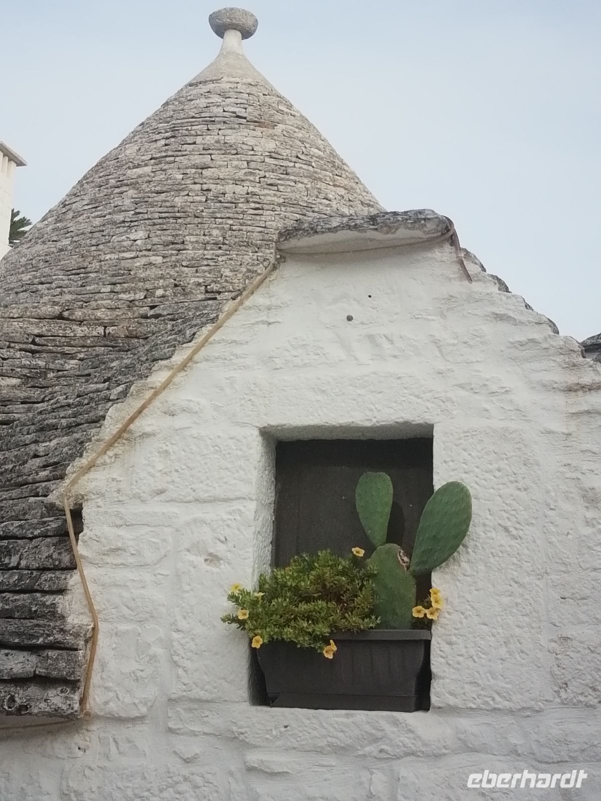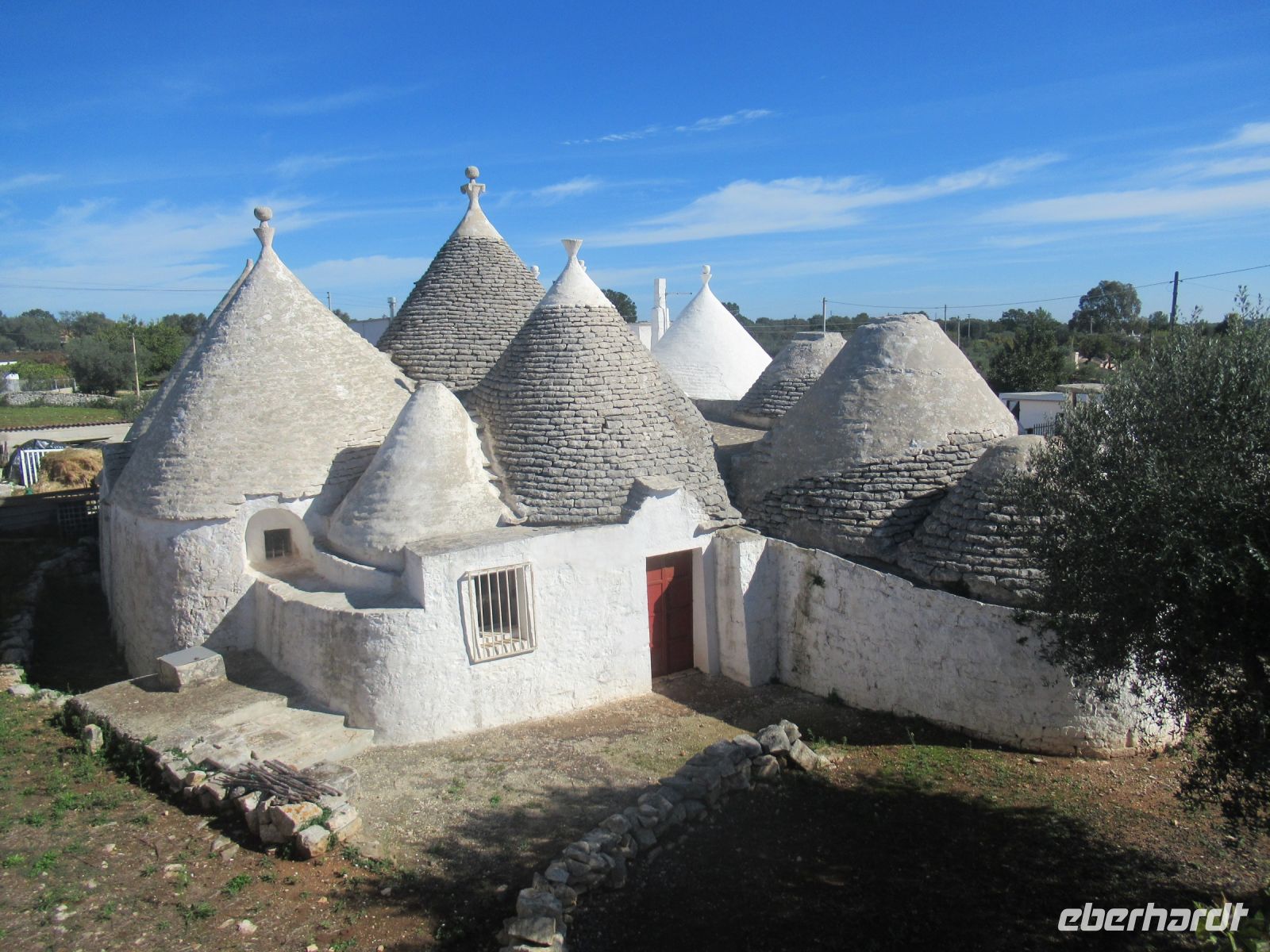Warum Trulli ? Der Name Trulli bedeutet Kuppel und stammt aus dem altgriechischen. Man setzt auf die quadratische Grundfläche des Hauses die rohen Feldsteine in Trockenbauweise übereinander. Die Kegelform der Dächer ergibt sich durch die schräg aufeinander geschichteten Steinplatten. Die Dachspitze „Pinnacolo“ ist meistens Kugel oder ein Stern. Das Baumaterial liefert die Natur der Region gratis: Steine, Steine, Steine …
