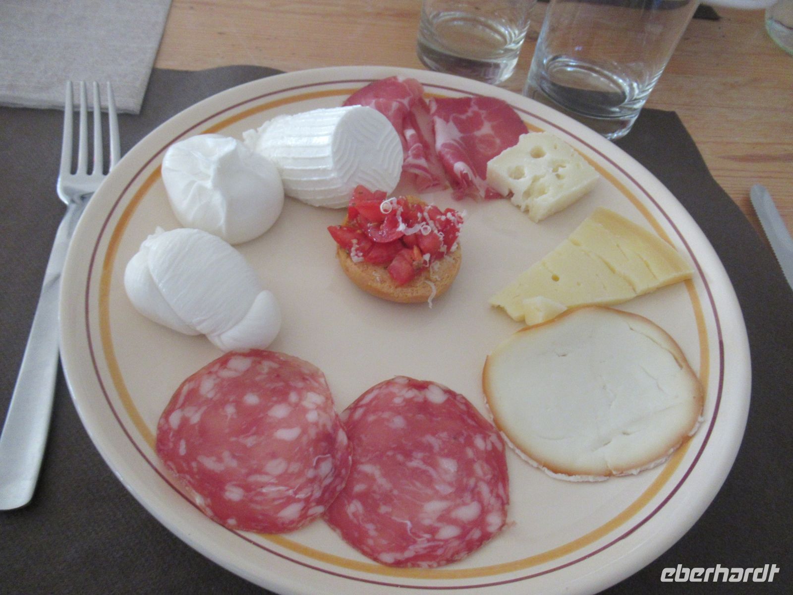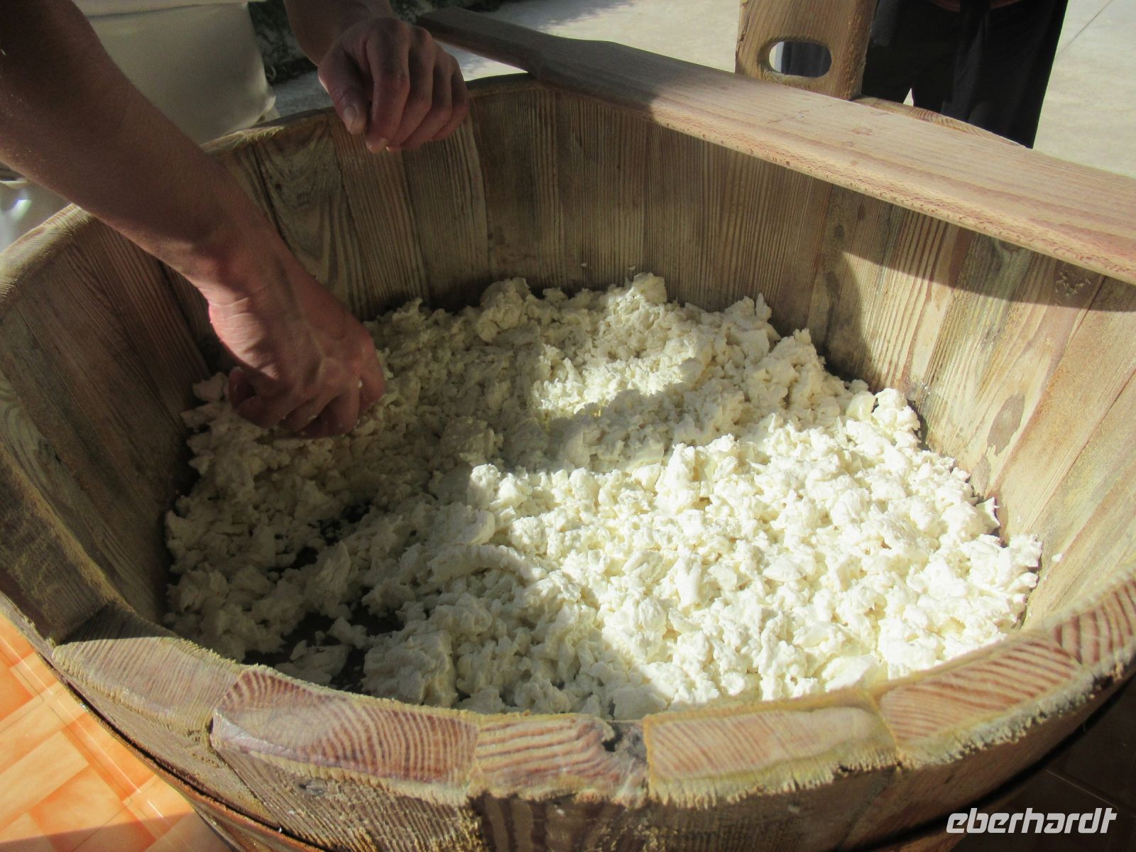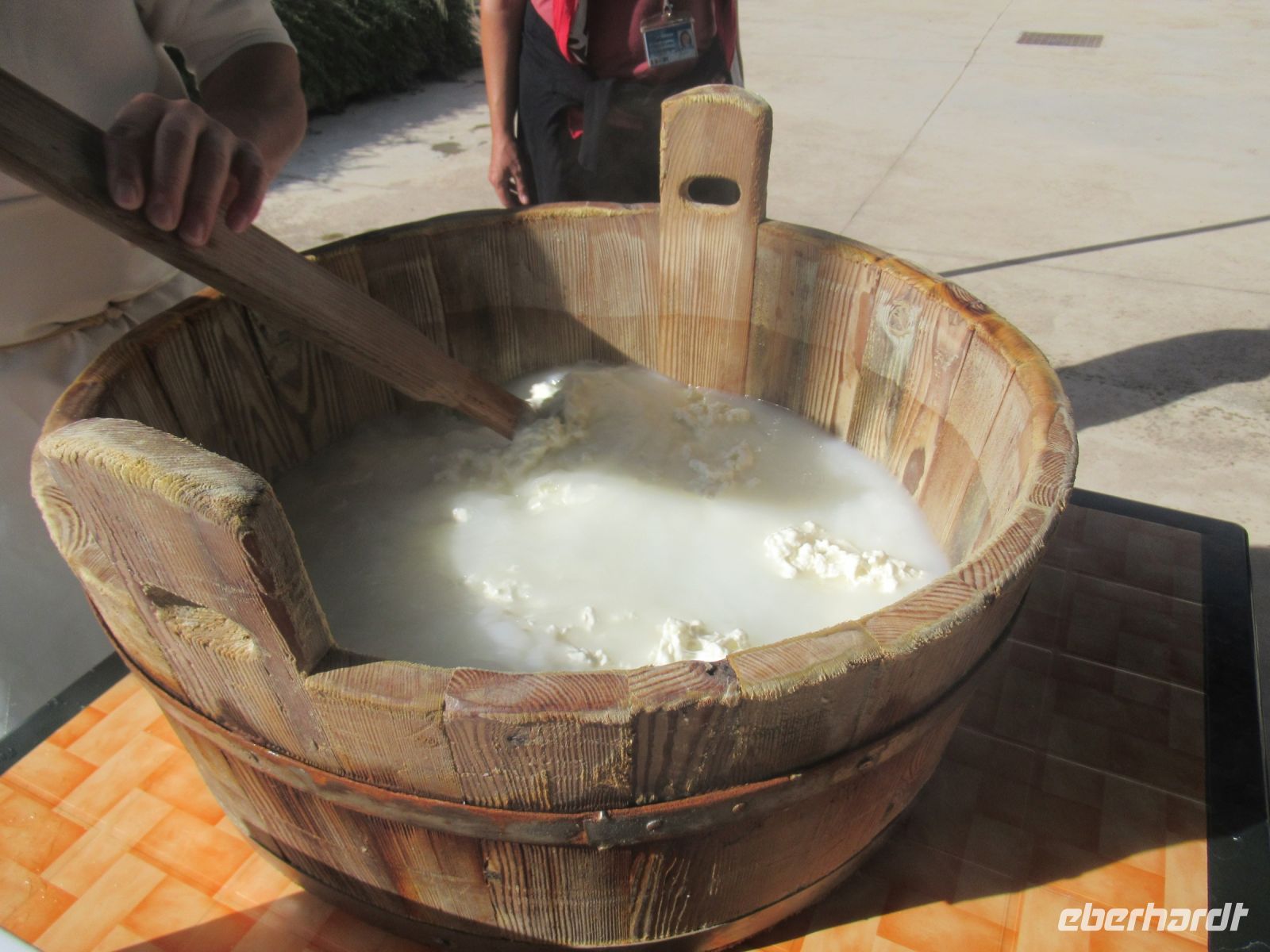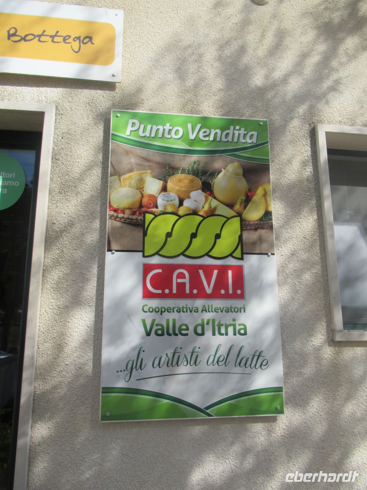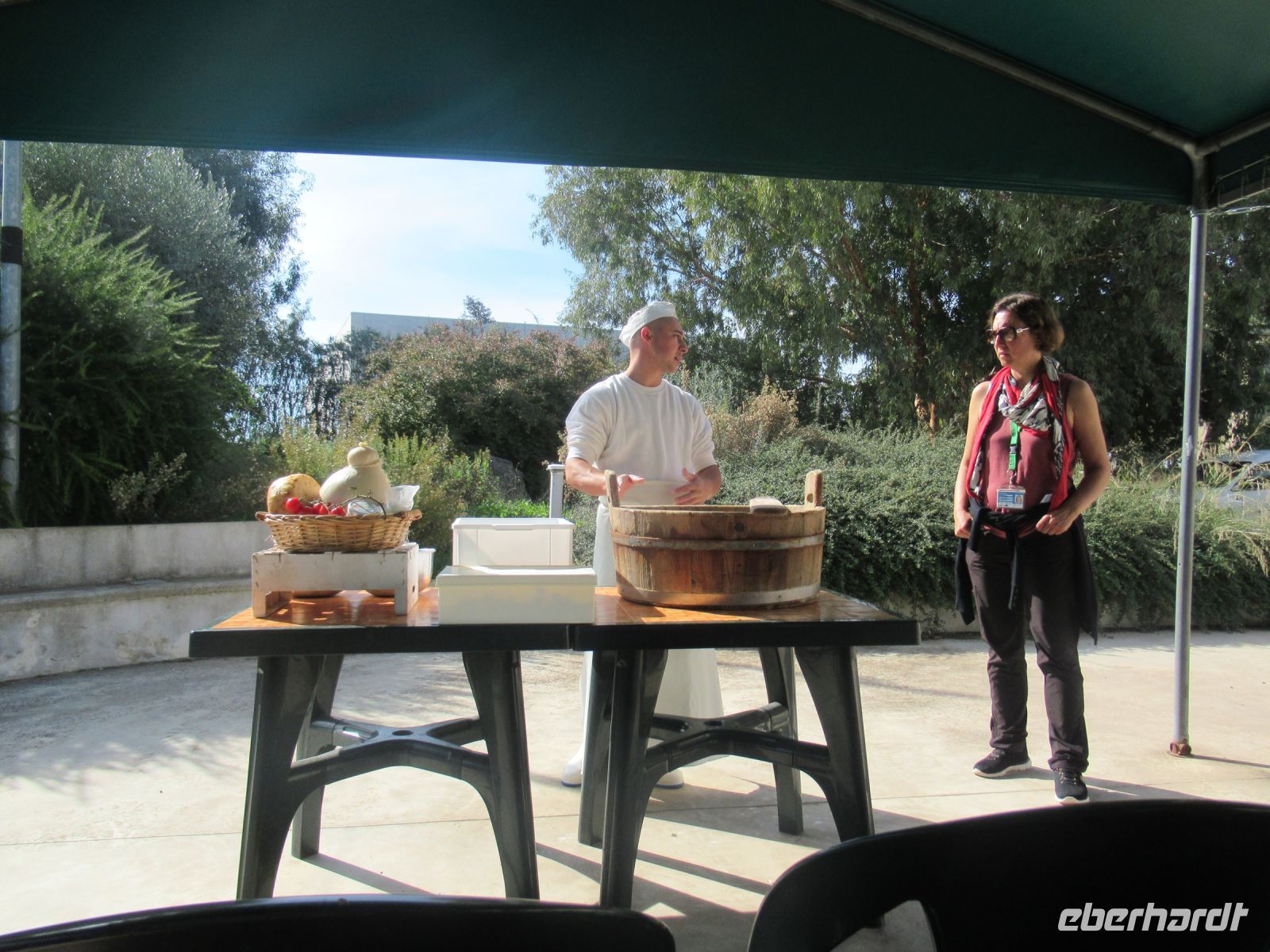 Nach ca. 7 km endete unsere Wanderung und wir fuhren zu einer Masseria – Gutshof C.A.V.I. Cooperativa Allevatori, wo uns die noch manuelle Herstellung von Mozarella, Ricotta, Burrata, und des bekannten Caciocavallo vorgestellt wird. Ein junger Mann präsentiert uns live, wie in Handarbeit die einzelne Käsesorten herstellt werden. Und es wird hier auch heute noch so von Hand so gemacht. Nach der Präsentation bekommen wir in der Räumen der Cooperativa wunderbare Köstlichkeiten von Käse, Schinken, gerösteten Gemüse und Focaccia mit Wasser und Wein serviert. Köstliche italienische (Bio) Spezialitäten. Ein wahrerer Gaumenschmaus. So gestärkt freuen wir uns auf die Trulli-Stadt