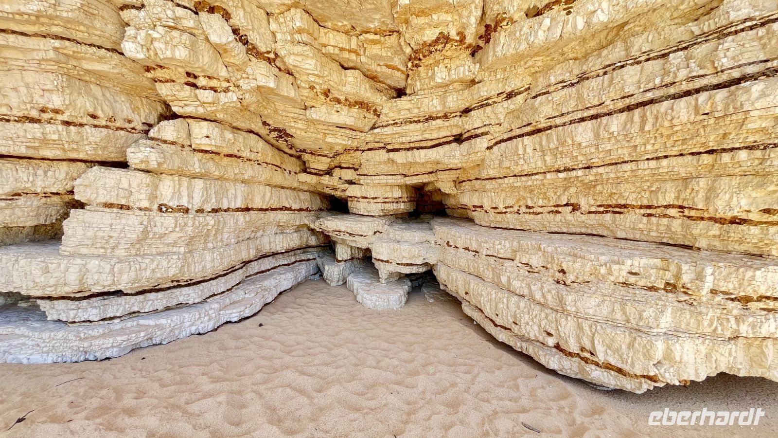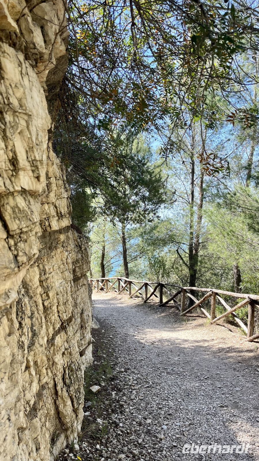 Wir waren in den Bergen auf einem gewundenen Pfad gewandert, manchmal im Schatten der Aleppo-Kiefern, aber immer mit dem Meer unter uns und in der Ferne. Auf der anderen Seite die Kalksteinfelsen mit ihren feurigen Adern, die die Steilküste säumten, und den vielen Schätzen, die sich in den Winkeln und Ritzen dieser imposanten Felsformationen verbergen!