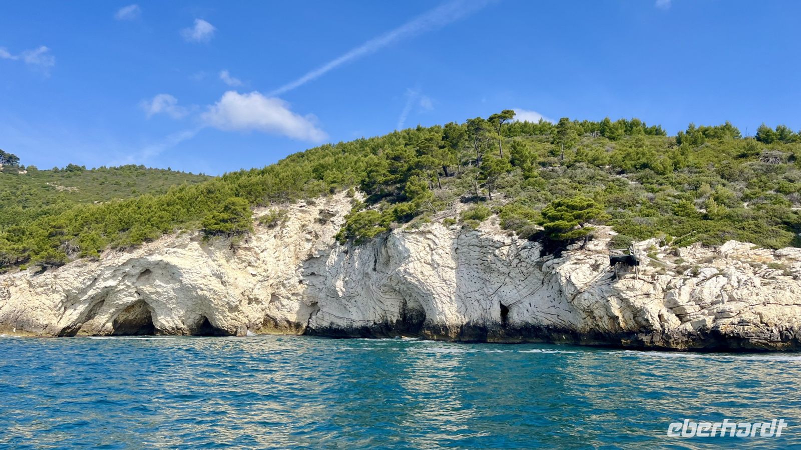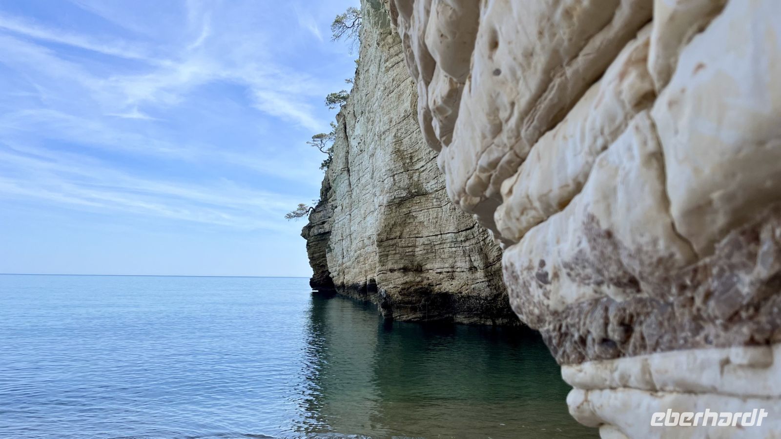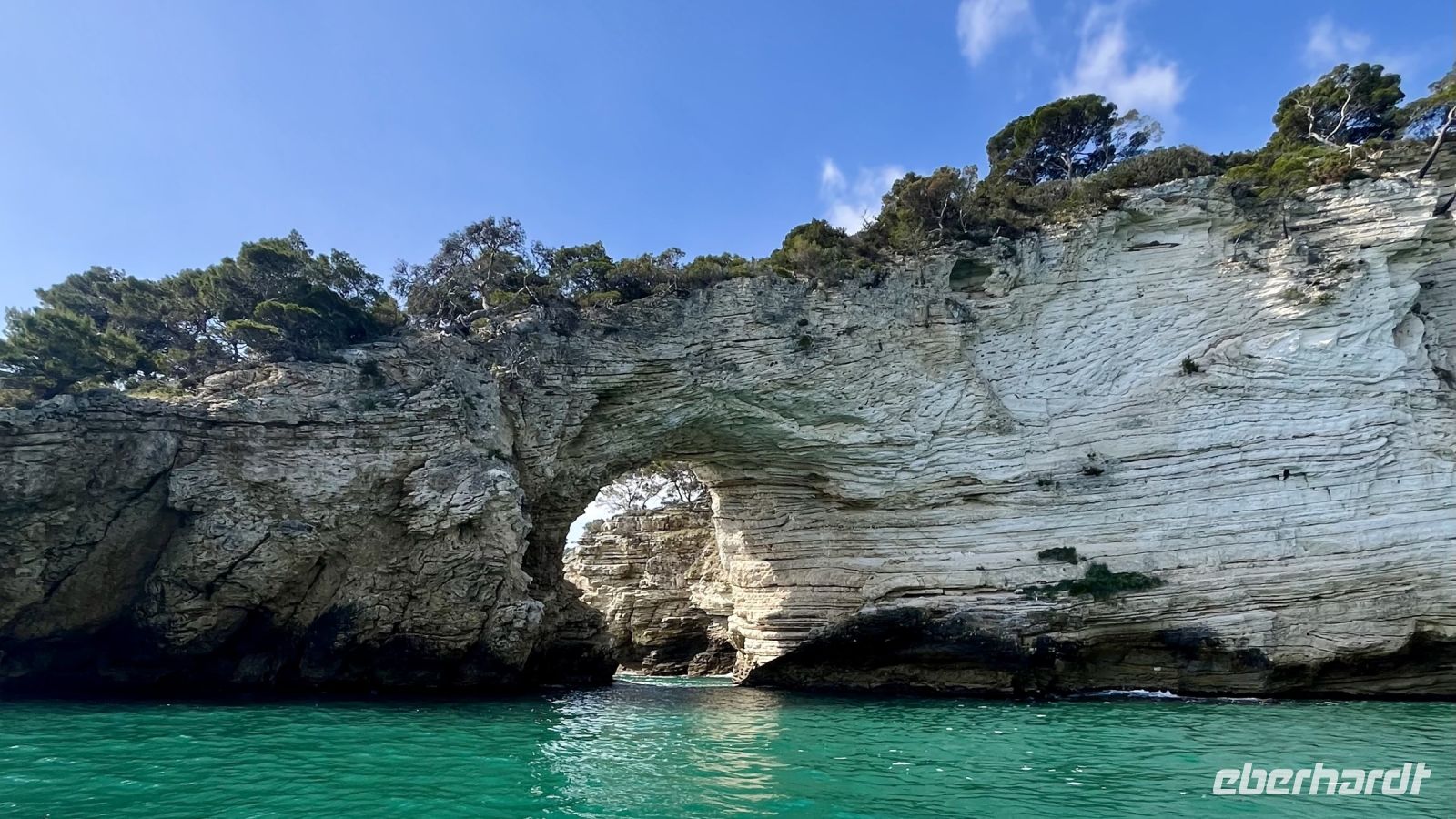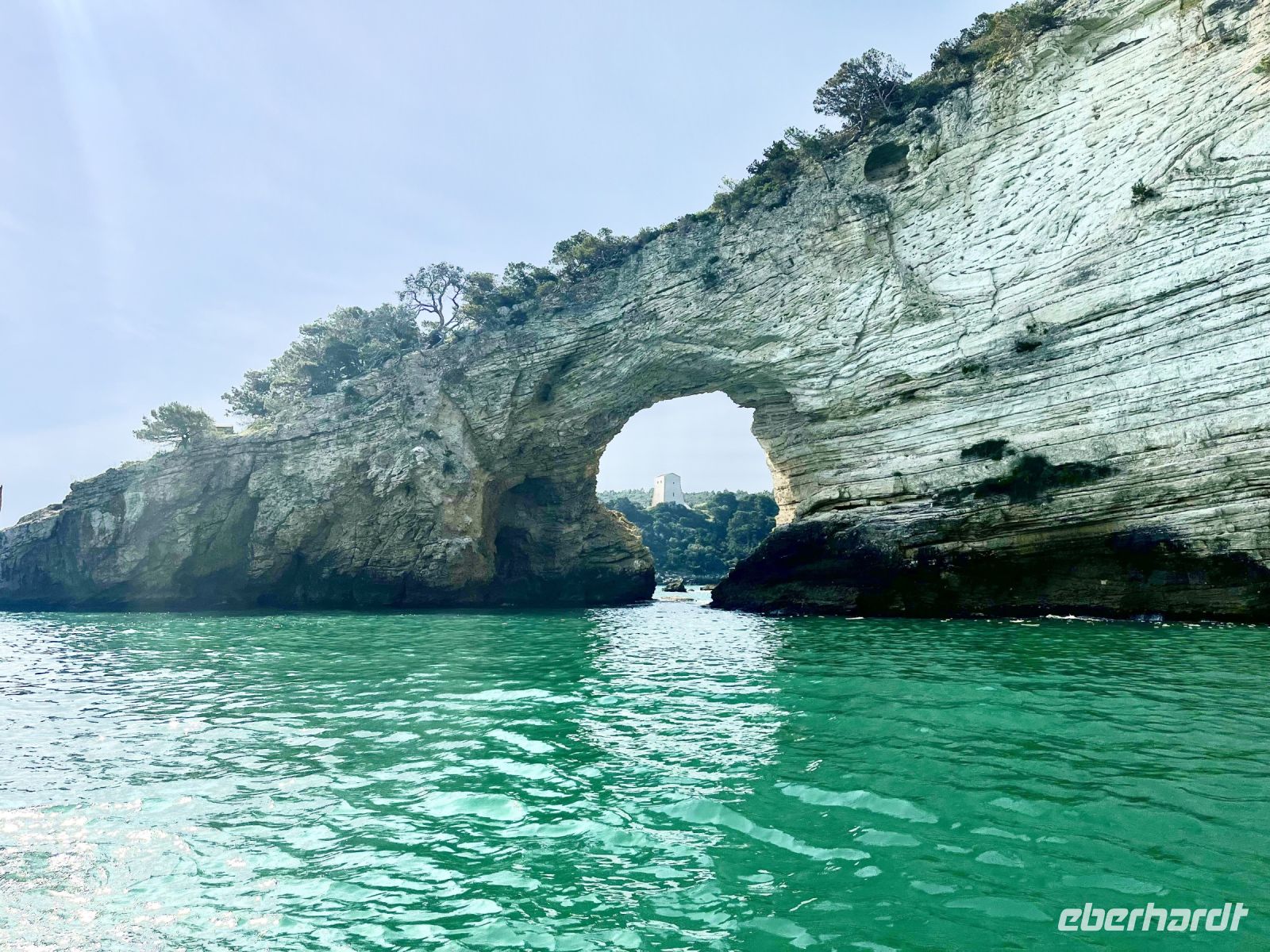 Diesmal begannen wir unseren Tag mit einem Bootsausflug an der Küste vor der Stadt Vieste. Das Schaukeln der Wellen und eine angenehme Meeresbrise begleitete die Morgensonne. Die meisterhaft gezeichnete Küstenlinie erstreckte sich vor unseren Augen und bildete eine spektakuläre Landschaft. Was für eine Freude und was für ein Glück war es, mit unserer Wandergruppe hier zu sein. Die Aussicht auf Felsbögen wie den „Arco di San Felipe“, Grotten und versteckte Strände wie die ‚Spiaggia di Sfinale‘ gehörte uns allein. Es war eine Freude, sie zu sehen, eine Euphorie der simplen Schönheit.