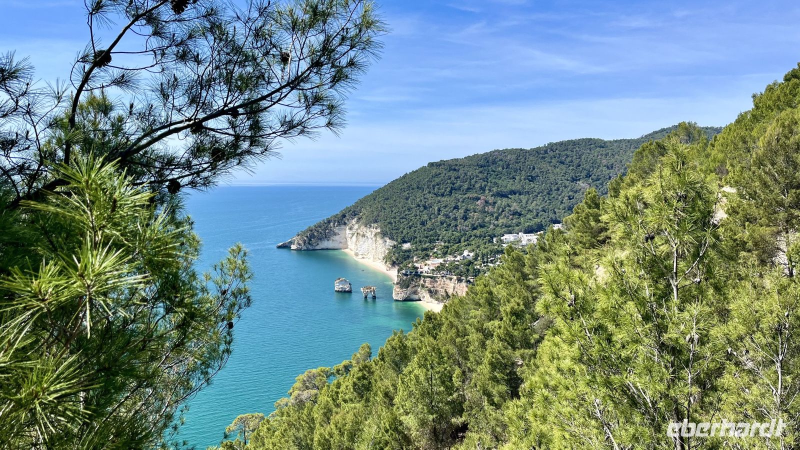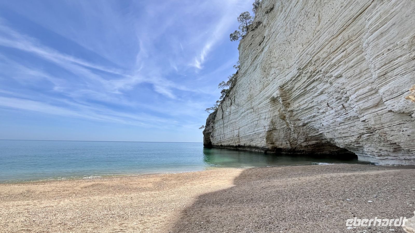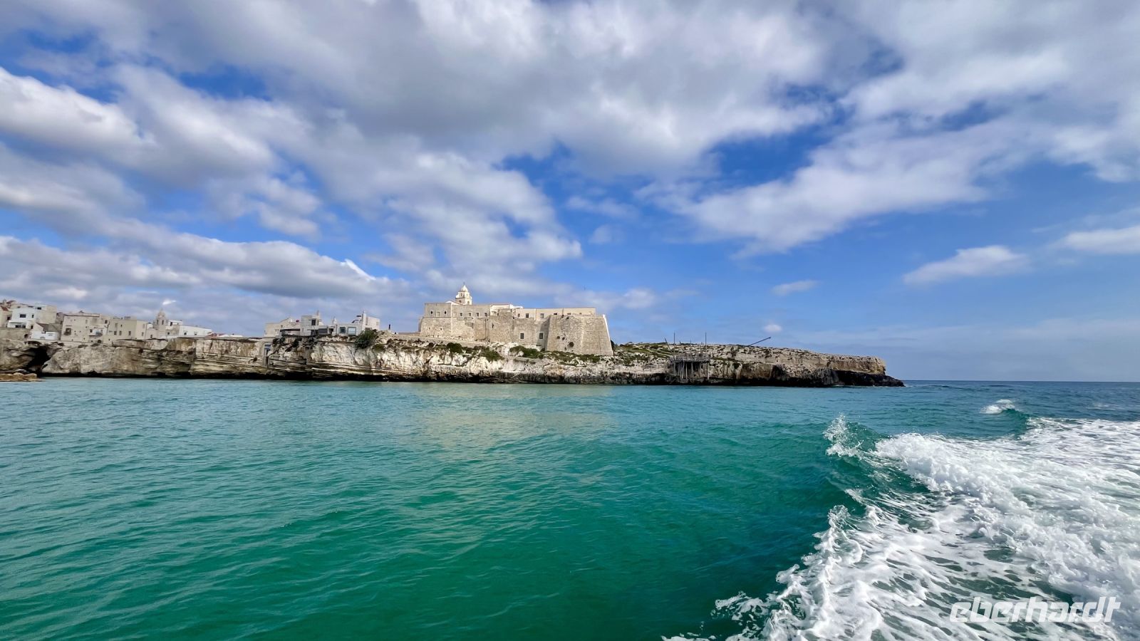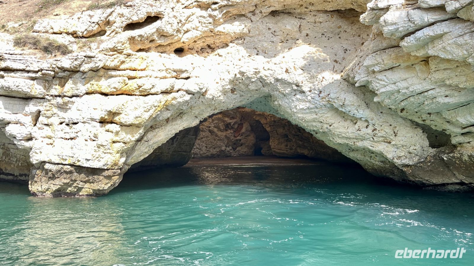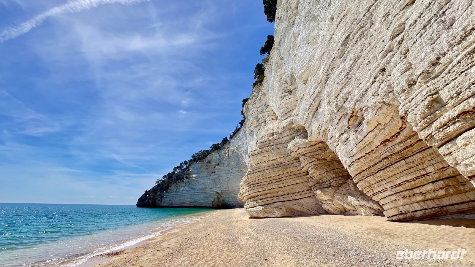 Diesmal begannen wir unseren Tag mit einem Bootsausflug an der Küste vor der Stadt Vieste. Das Schaukeln der Wellen und eine angenehme Meeresbrise begleitete die Morgensonne. Die meisterhaft gezeichnete Küstenlinie erstreckte sich vor unseren Augen und bildete eine spektakuläre Landschaft. Was für eine Freude und was für ein Glück war es, mit unserer Wandergruppe hier zu sein. Die Aussicht auf Felsbögen wie den „Arco di San Felipe“, Grotten und versteckte Strände wie die ‚Spiaggia di Sfinale‘ gehörte uns allein. Es war eine Freude, sie zu sehen, eine Euphorie der simplen Schönheit.
