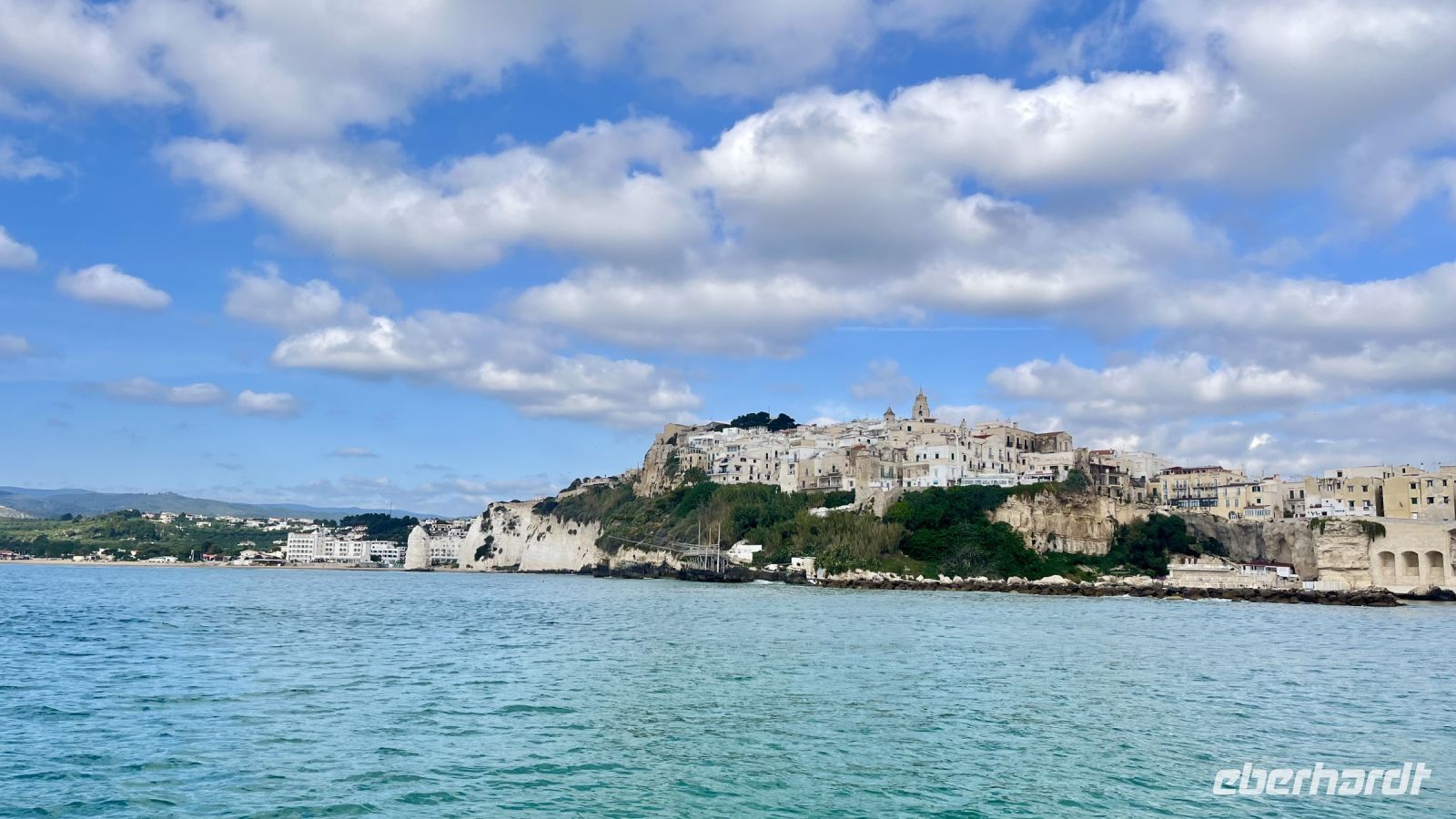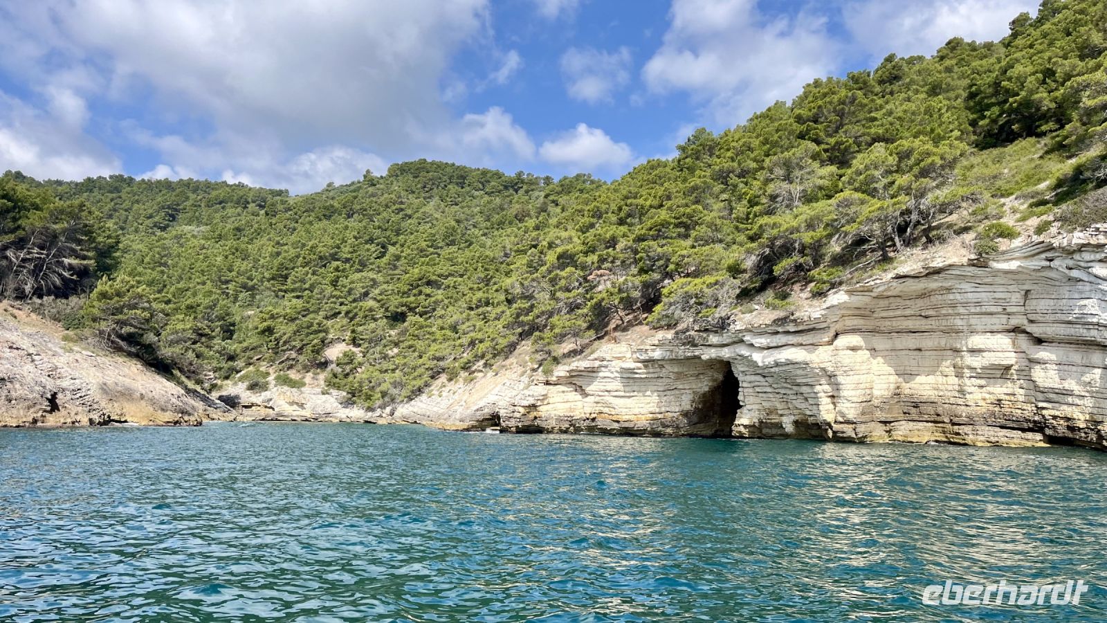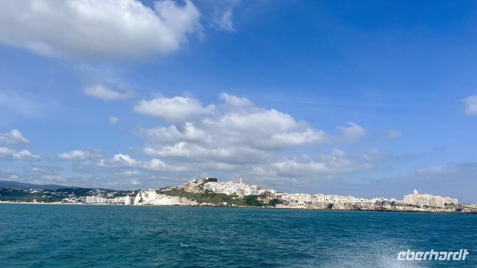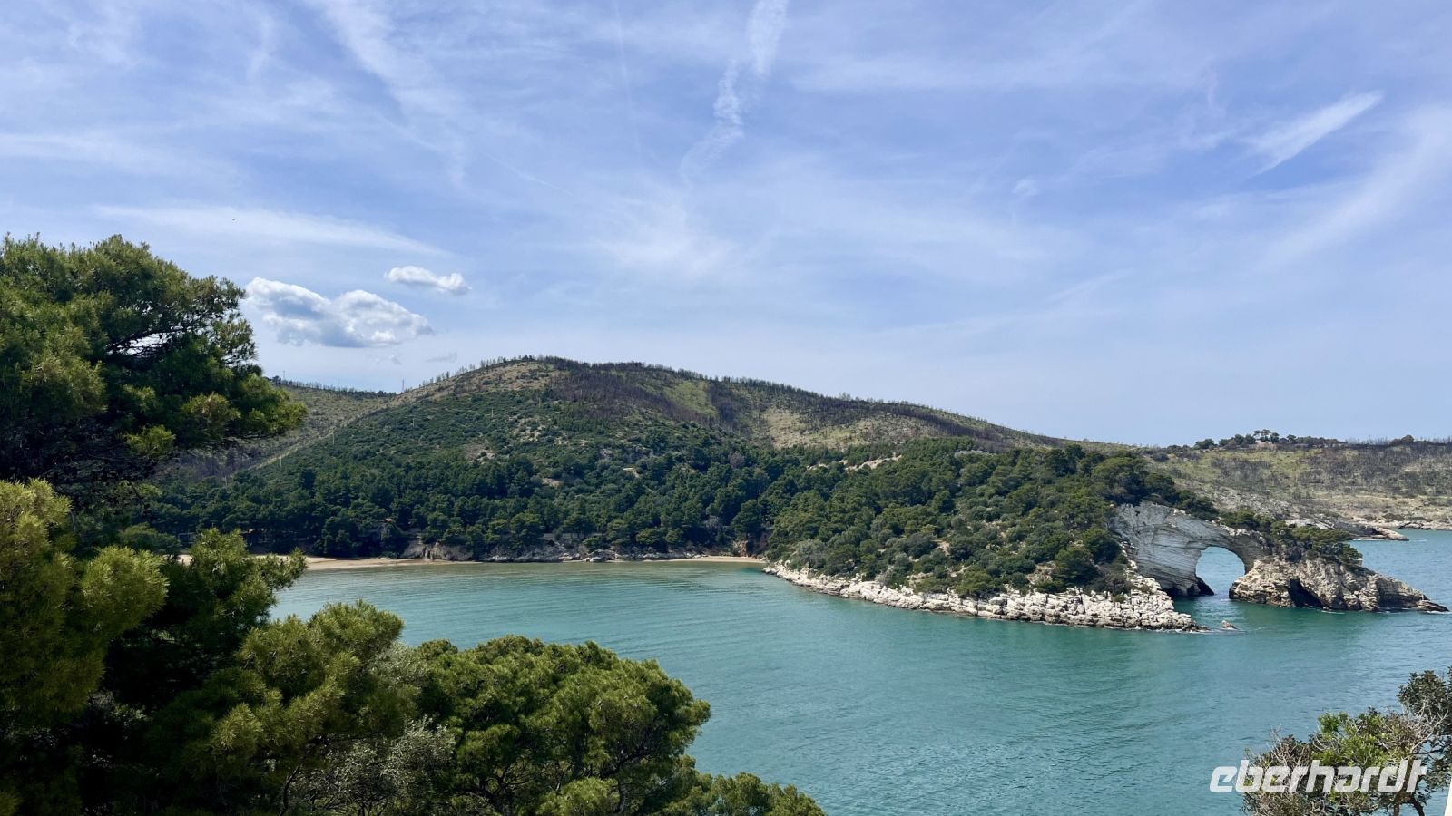 Diesmal begannen wir unseren Tag mit einem Bootsausflug an der Küste vor der Stadt Vieste. Das Schaukeln der Wellen und eine angenehme Meeresbrise begleitete die Morgensonne. Die meisterhaft gezeichnete Küstenlinie erstreckte sich vor unseren Augen und bildete eine spektakuläre Landschaft. Was für eine Freude und was für ein Glück war es, mit unserer Wandergruppe hier zu sein. Die Aussicht auf Felsbögen wie den „Arco di San Felipe“, Grotten und versteckte Strände wie die ‚Spiaggia di Sfinale‘ gehörte uns allein. Es war eine Freude, sie zu sehen, eine Euphorie der simplen Schönheit.