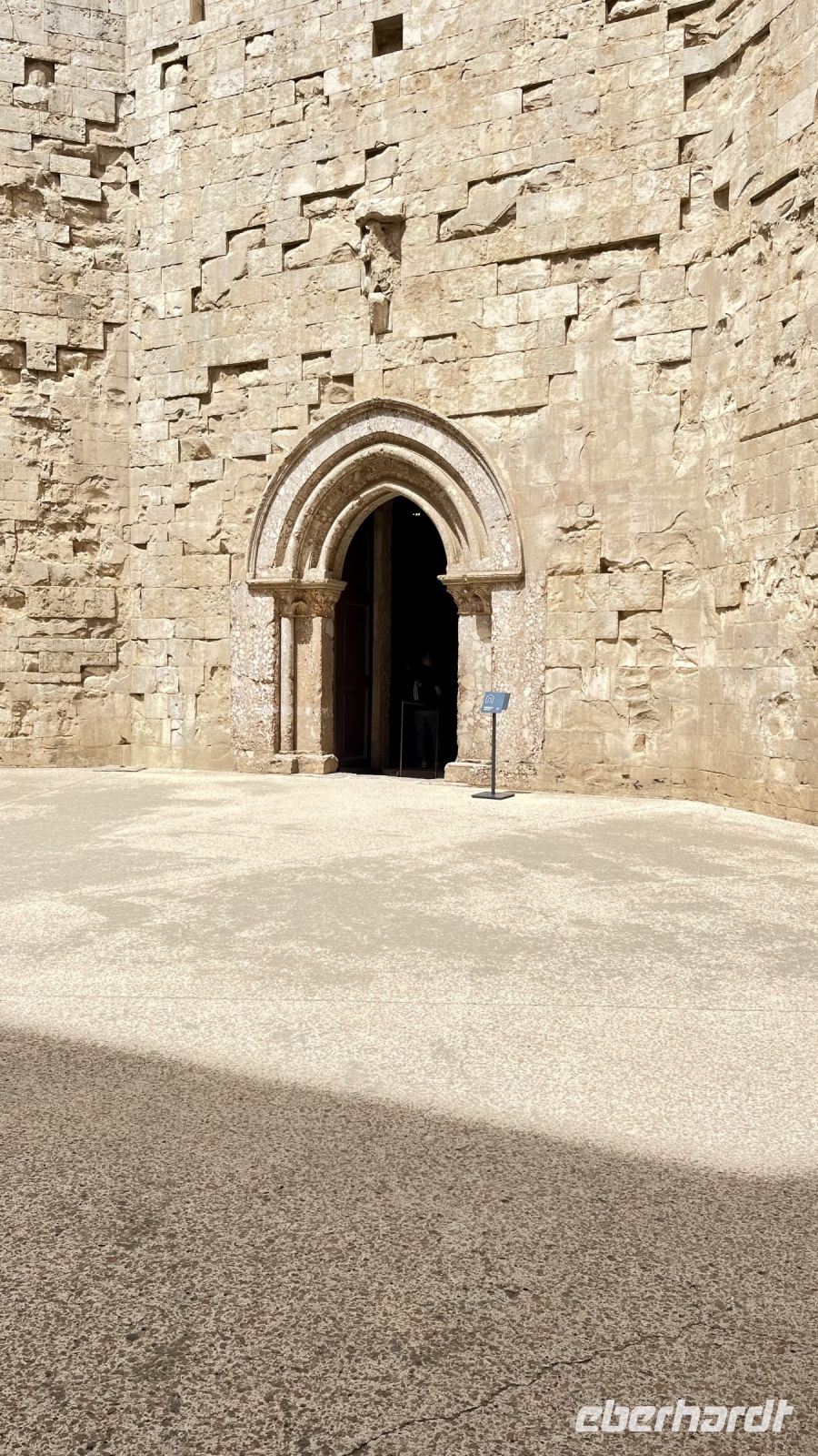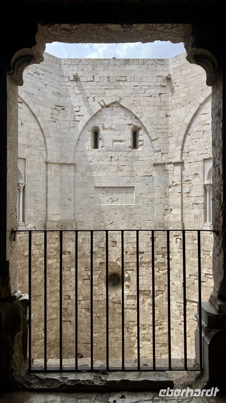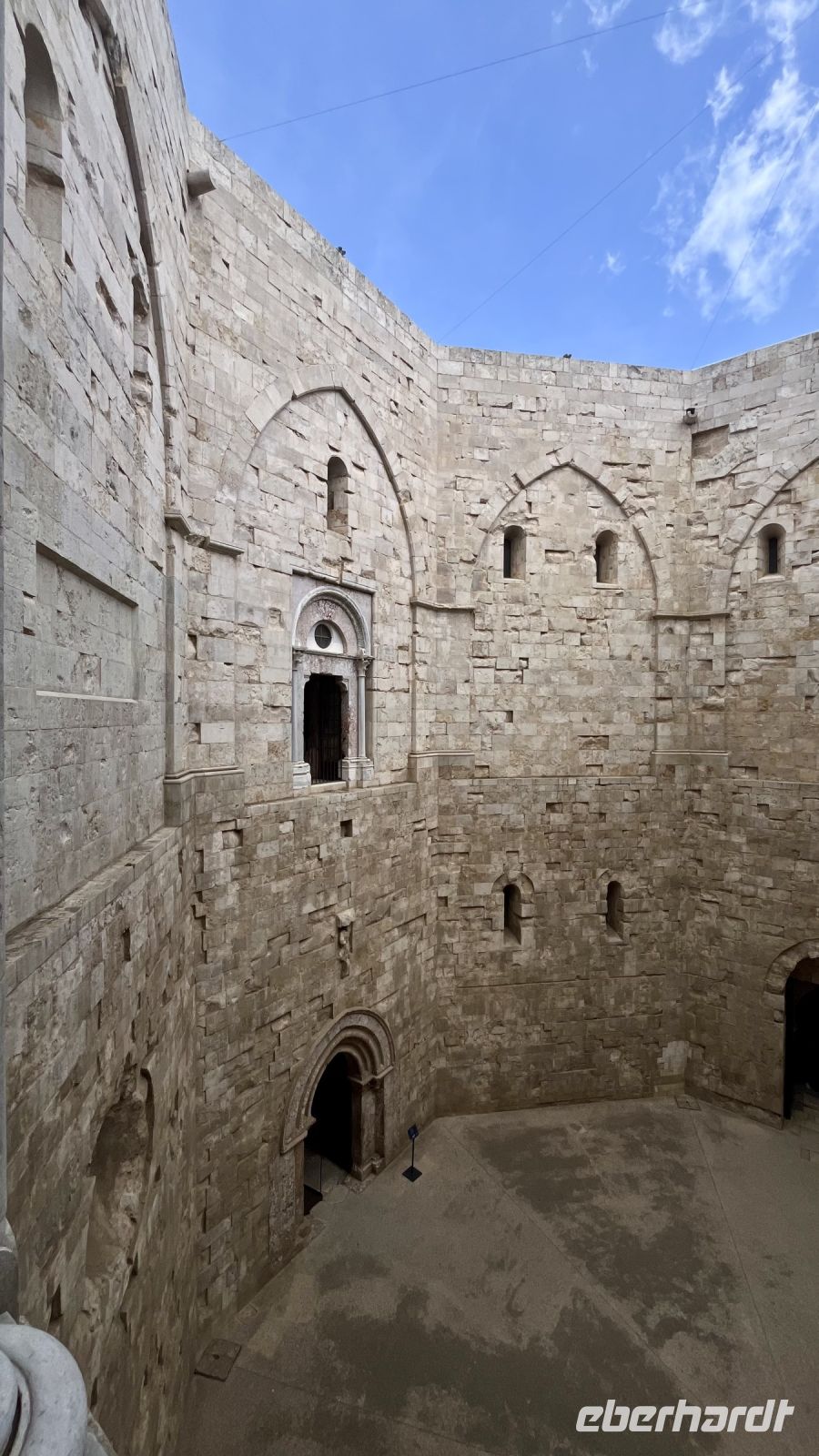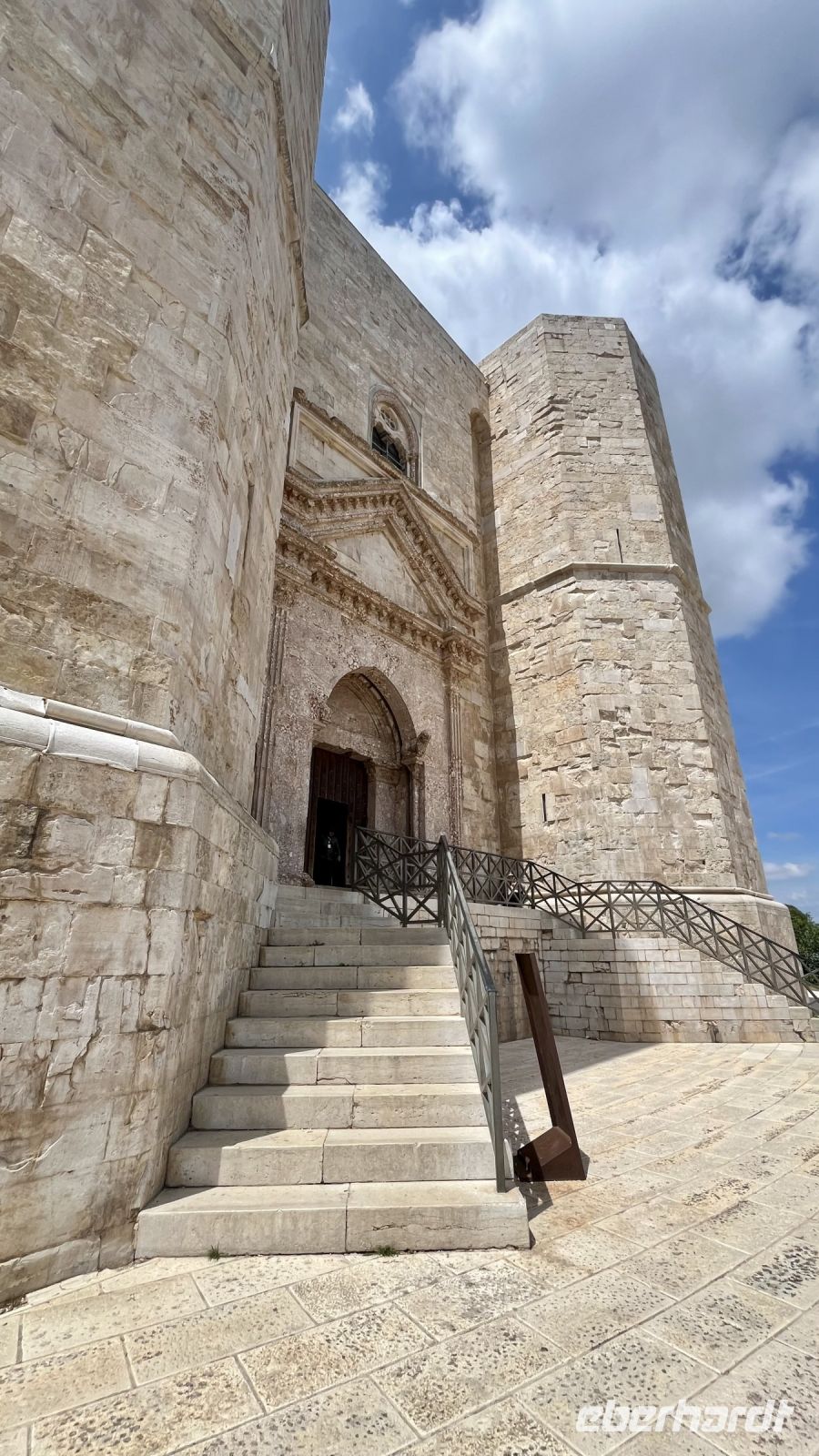 Und dann, ganz unerwartet, tauchte in der Ferne auf einem Hügel die Krone Apuliens auf, das „Castelo del Monte“. Eine imposante, achteckige Architektur, die noch Geheimnisse birgt und die Menschen immer wieder zu fantastischen Gedanken beflügelte. Die historisch sachlichen Deutungen reichen von einem Jagdschloss bis hin zu einem Gebäude zur Aufbewahrung des Staatsschatzes. Als Erinnerung könnte man sich eine italienischen 1-Cent-Münze, auf der das Castelo del Monte auf der Rückseite der abgebildet ist.