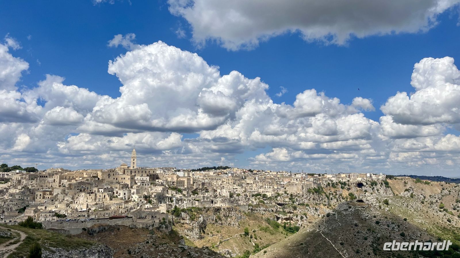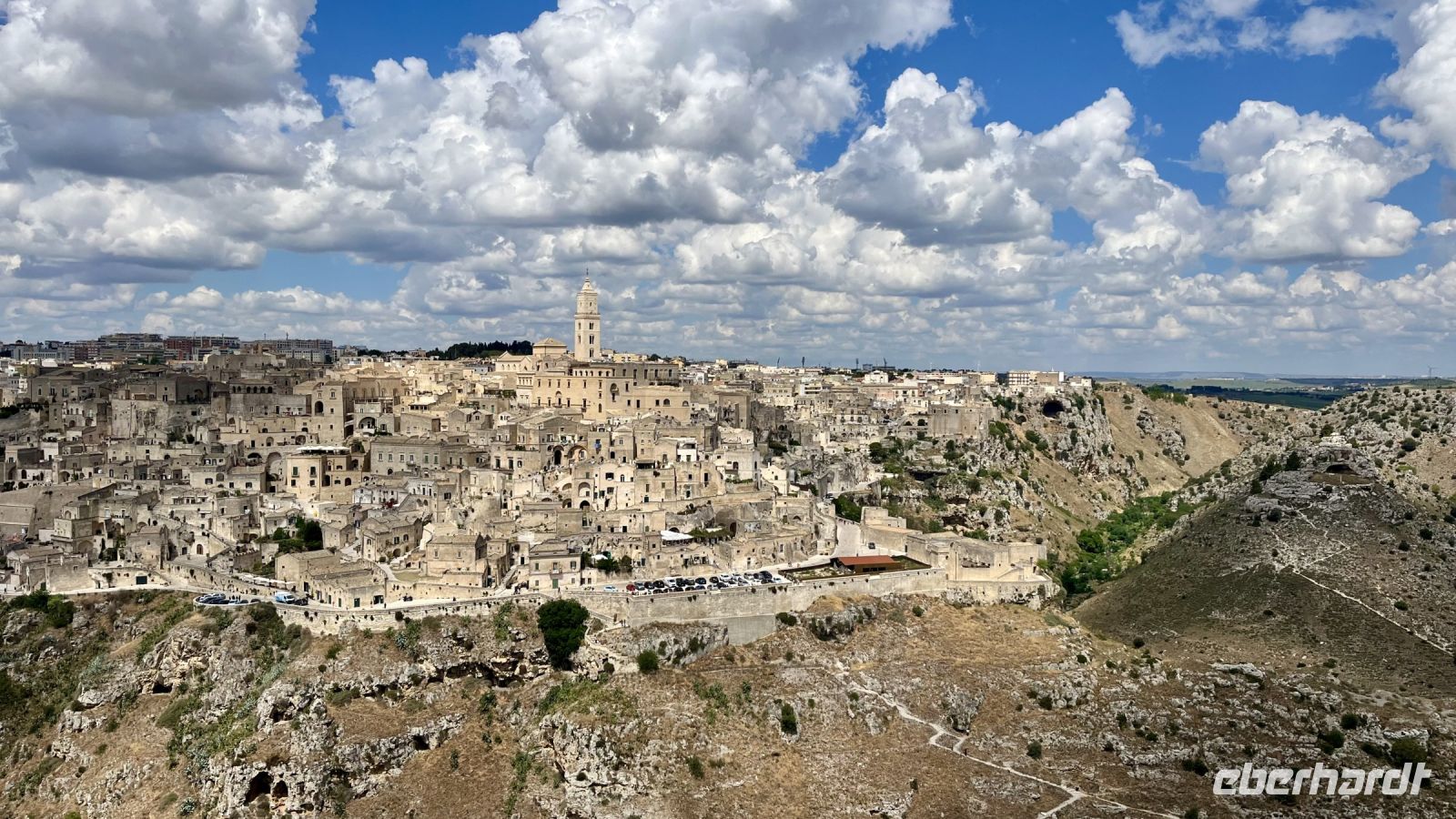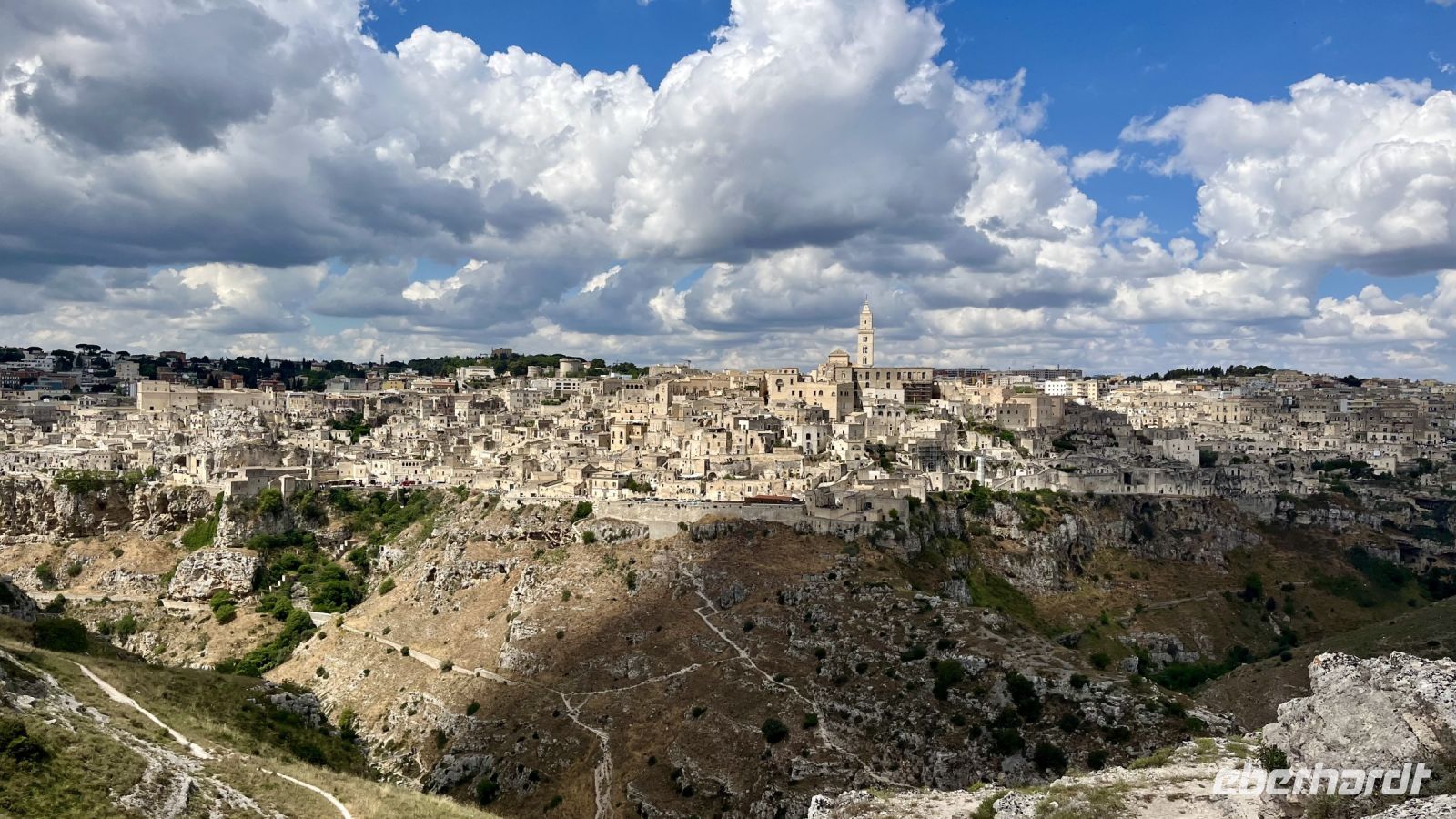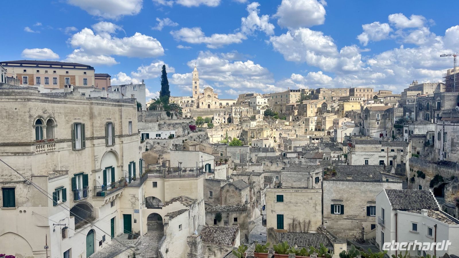 Faszinierend und rätselhaft mit Schluchten und Höhlen umgeben, befinden sich hier in den Kalkstein gehauene Häuser der altehrwürdigen Stadt Matera. Ein filmwürdiger Ort, der nicht aufgehört hat, es zu sein. Betrachtete man die Höhlenwohnungen noch 1954 als nationale Schande, so dass sie alle geräumt wurden, erkannte man in den 80er Jahren glücklicherweise ihren kulturhistorischen Wert wieder. Durch die beeindruckende Altstadt bummelnd, verbrachten wir hier unseren letzten Tag dieser großartigen Reise, bei der uns das Wetter immer hold war.