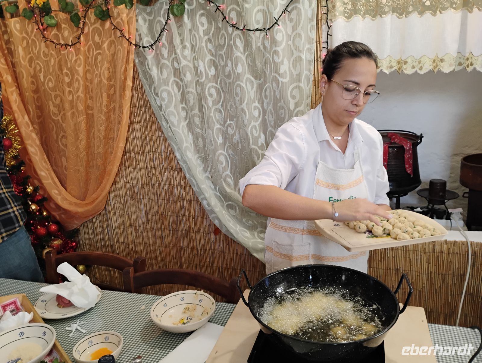 Im Anschluss stand der kulinarische Teil des Vormittags im Mittelpunkt. In entspannter Atmosphäre erhielten wir Einblicke in die traditionelle apulische Küche. Es wurde gezeigt, wie die typischen Orecchiette von Hand geformt werden und unter Anleitung konnten wir selbst ausprobieren, wie viel Übung es braucht, diese Pasta herzustellen. Auch die Herstellung von Mozzarella und Burrata wurde vorgeführt und machte deutlich, wie viel Erfahrung und Fingerspitzengefühl hinter diesen frischen Produkten steckt. Ergänzend dazu gab es Erklärungen und praktische Einblicke in die Zubereitung klassischer Gerichte wie Braciola und Polpette.