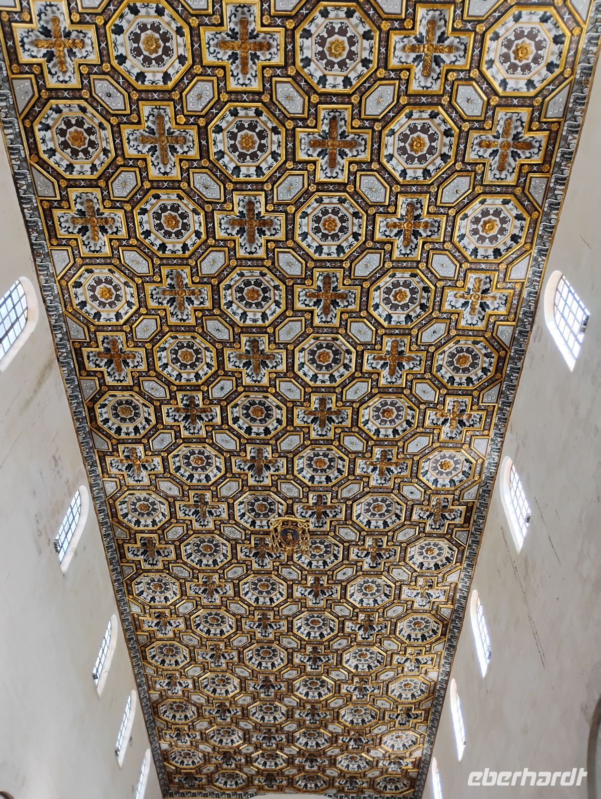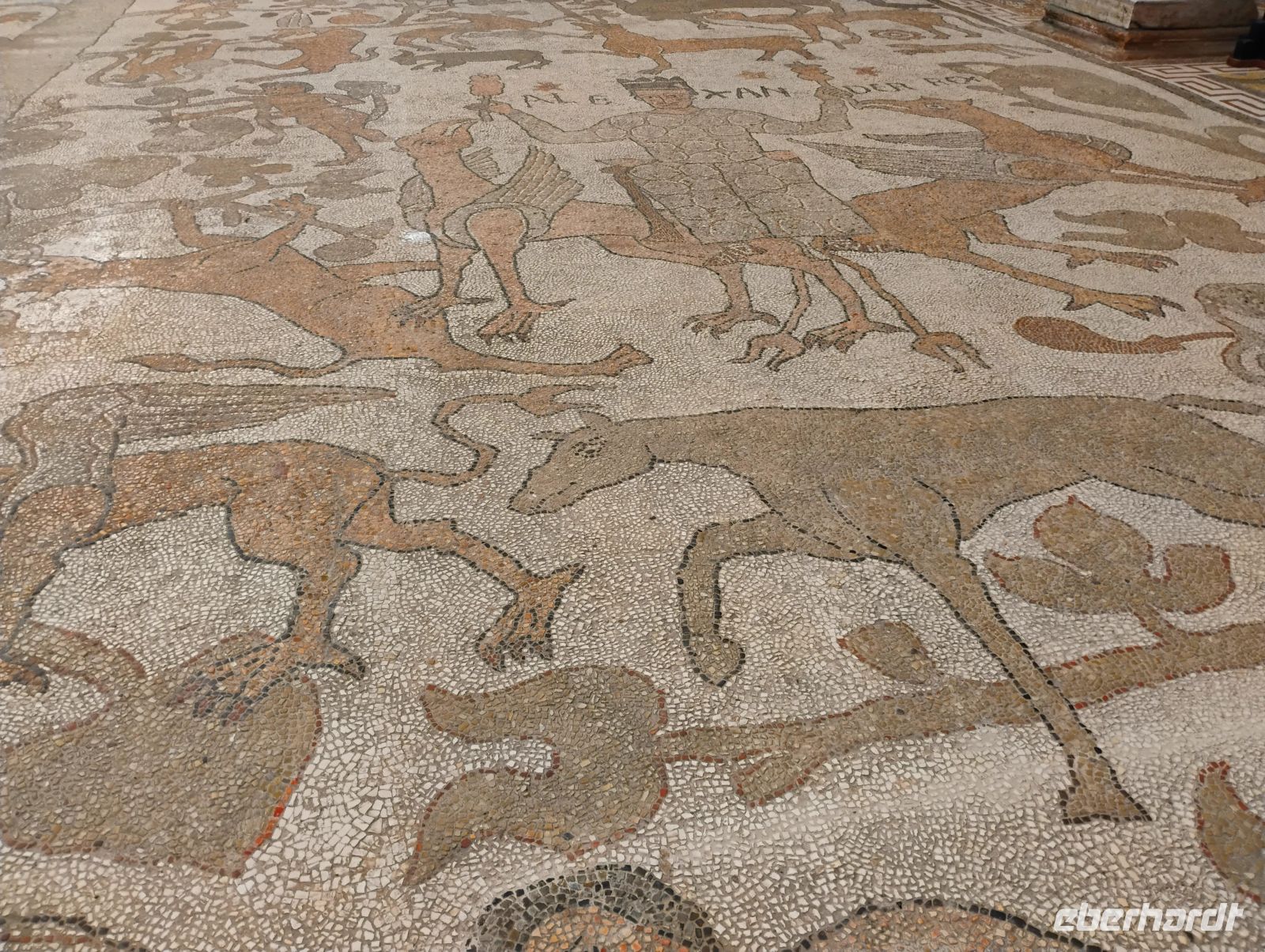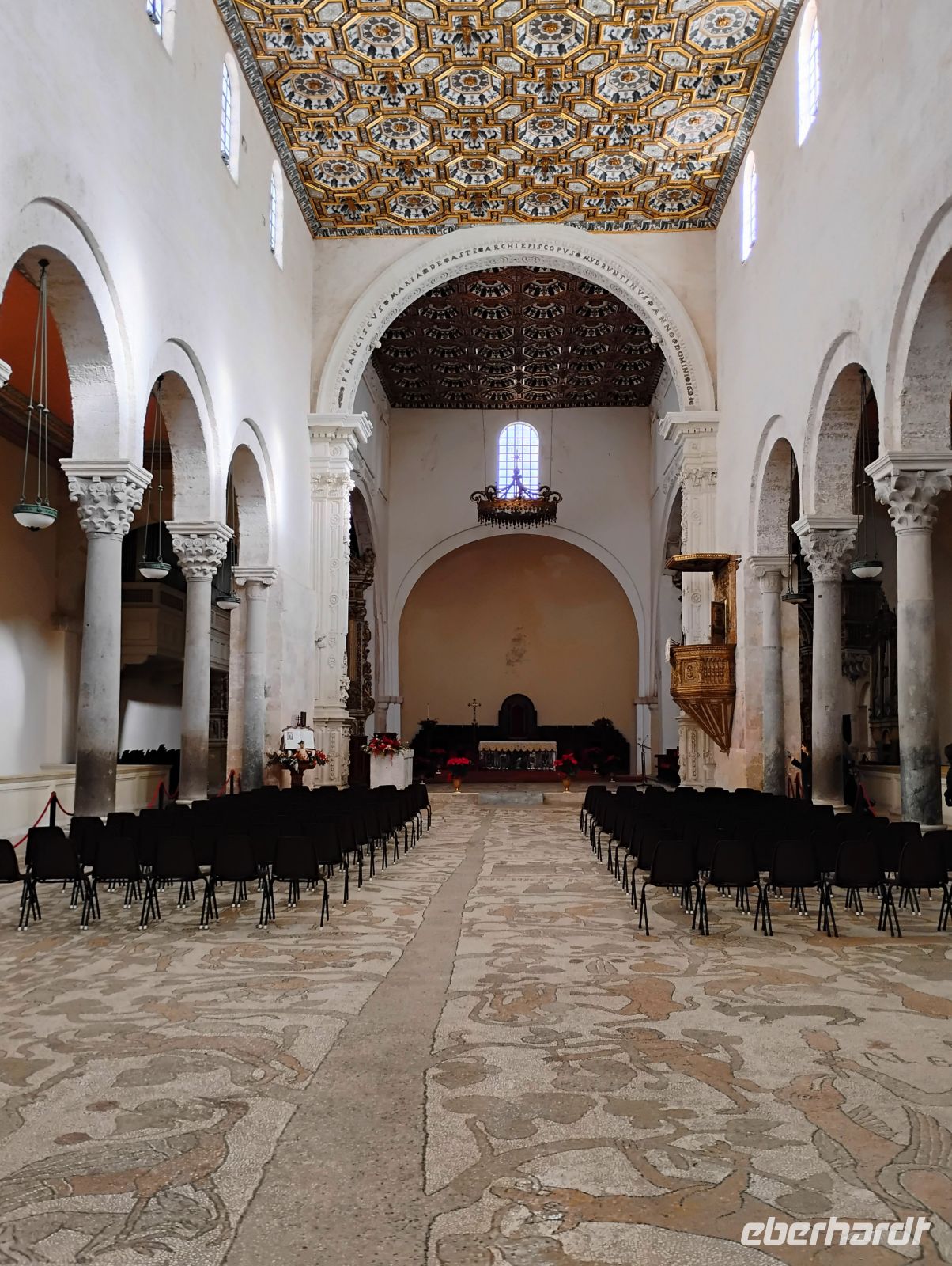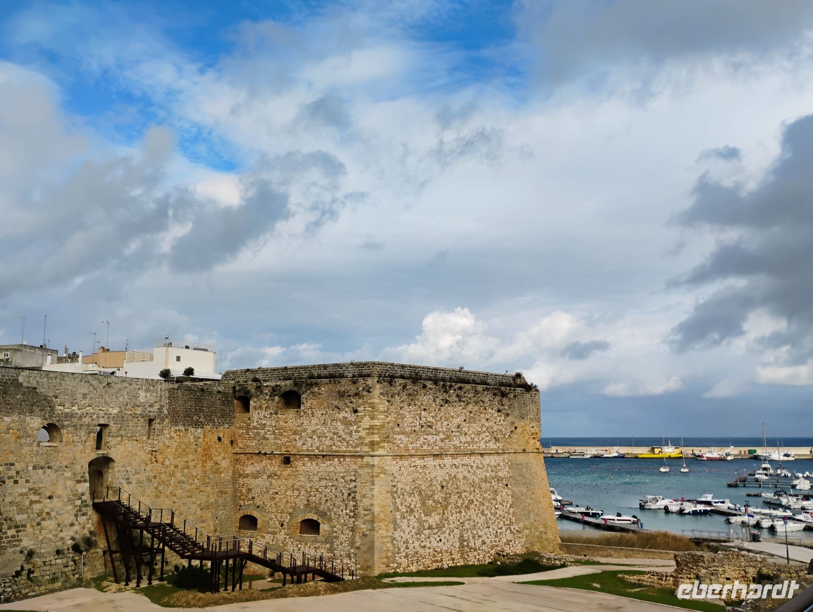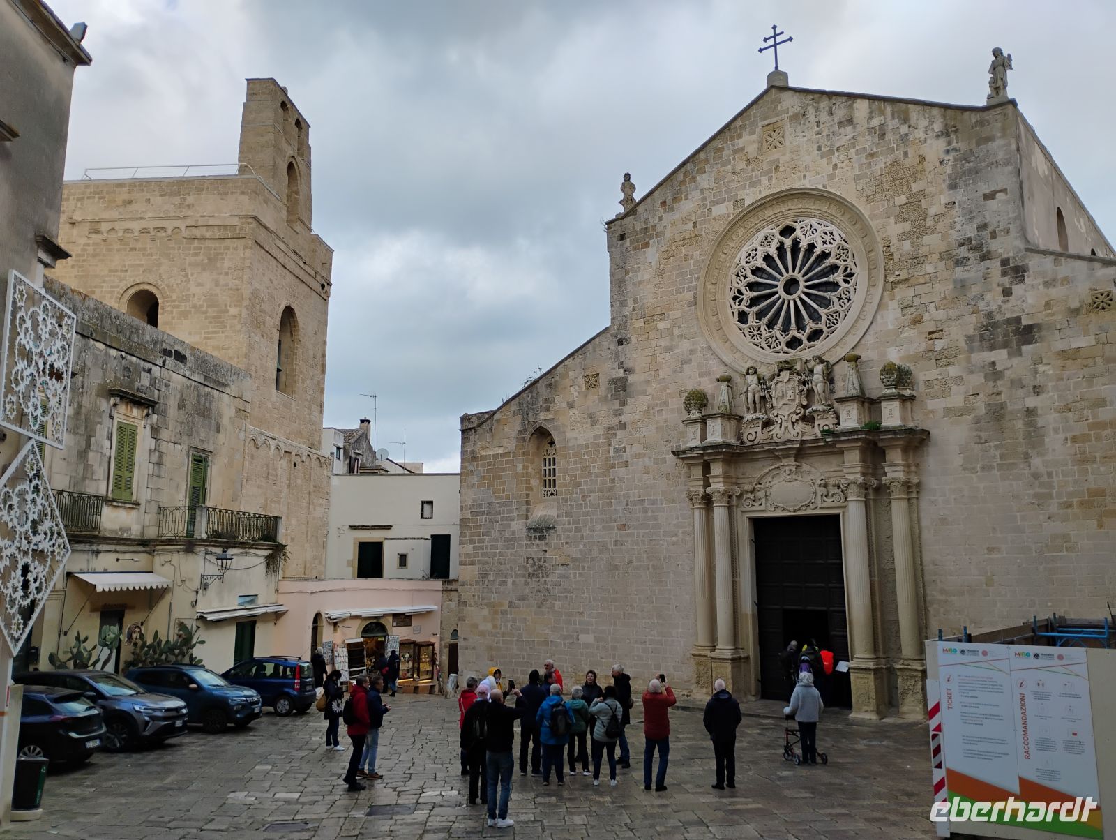 Zunächst erreichten wir Otranto. Beim geführten Rundgang durch die Altstadt stand die Kathedrale Santa Annunziata im Mittelpunkt. Besonders beeindruckend war der monumentale Mosaikboden aus dem 12. Jahrhundert, dessen Bildsprache Sascha anschaulich erklärte, von Motiven aus dem Alexanderroman über mythische Wesen bis hin zu religiösen Symbolen. Nach der Besichtigung der Krypta spazierten wir entlang der Stadtmauer und machten uns bewusst, dass wir uns hier am östlichsten Punkt Italiens befanden. Von hier sind es nur rund 75 Kilometer bis nach Albanien – bei klarer Sicht kann man das gegenüberliegende Ufer erkennen, heute blieb der Blick wegen des trüben Wetters jedoch verwehrt.