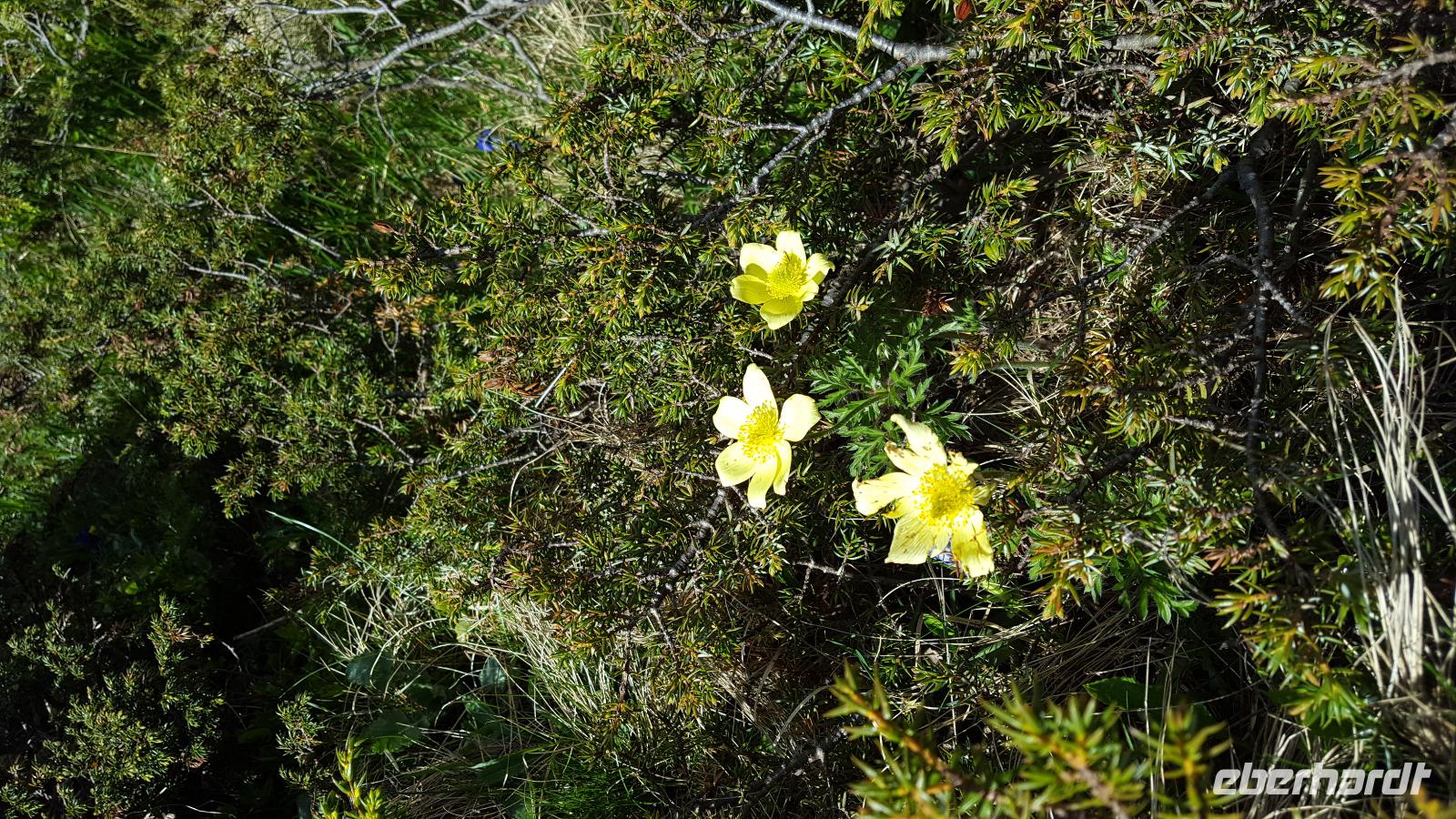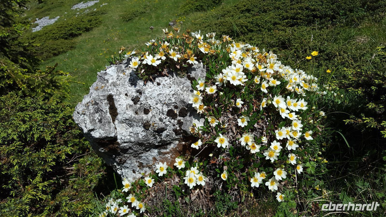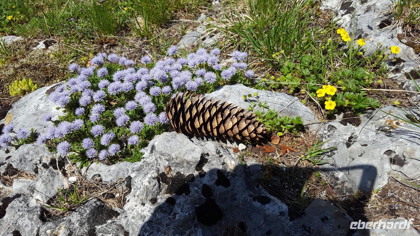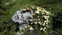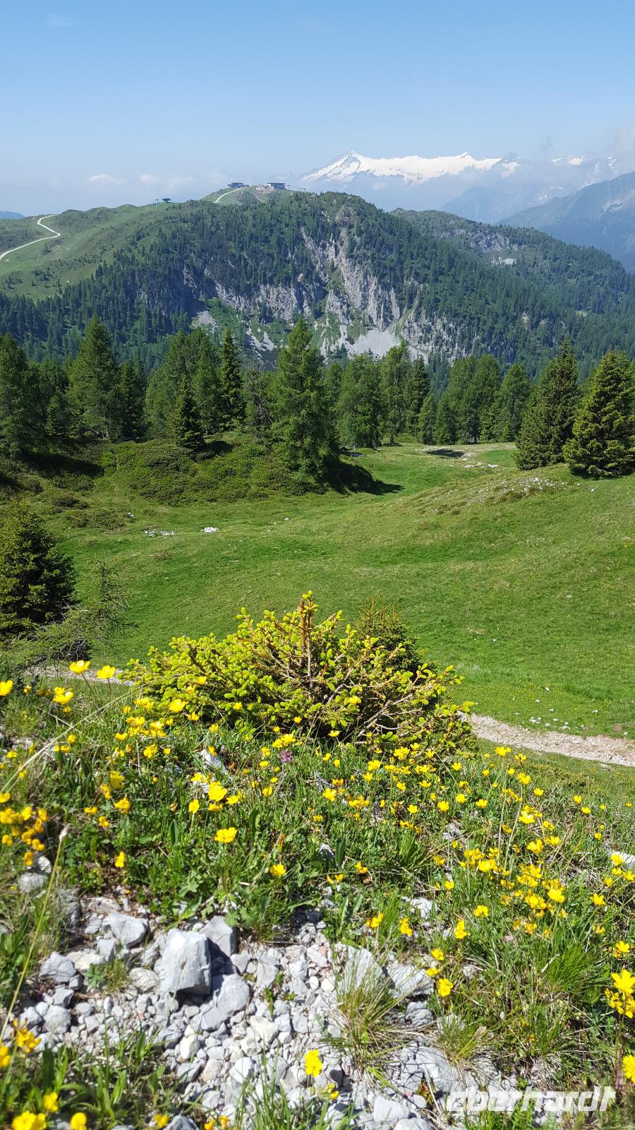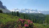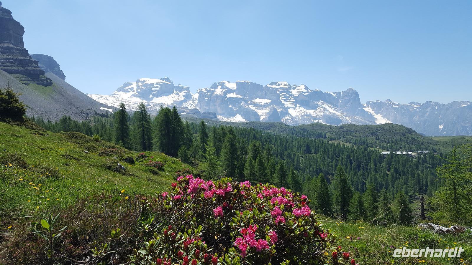 Geplant waren die Vallesinella-Wasserfälle, die jedoch durch Unwetter unpassierbar waren. Rino hatte sofort eine Alternative bereit und wir fuhren mit der Gondel Tc.Groste 1 bis auf 2.075 Höhenmeter. Nach einem Besuch im Rifugio „Boch" startete unsere Wanderung. Da die Alpenrose teilweise schon blühte, bildete es einen bezaubernden Kontrast zum strahlend bauen Himmel und den kräftigen Grüntönen der Alpenwiesen.