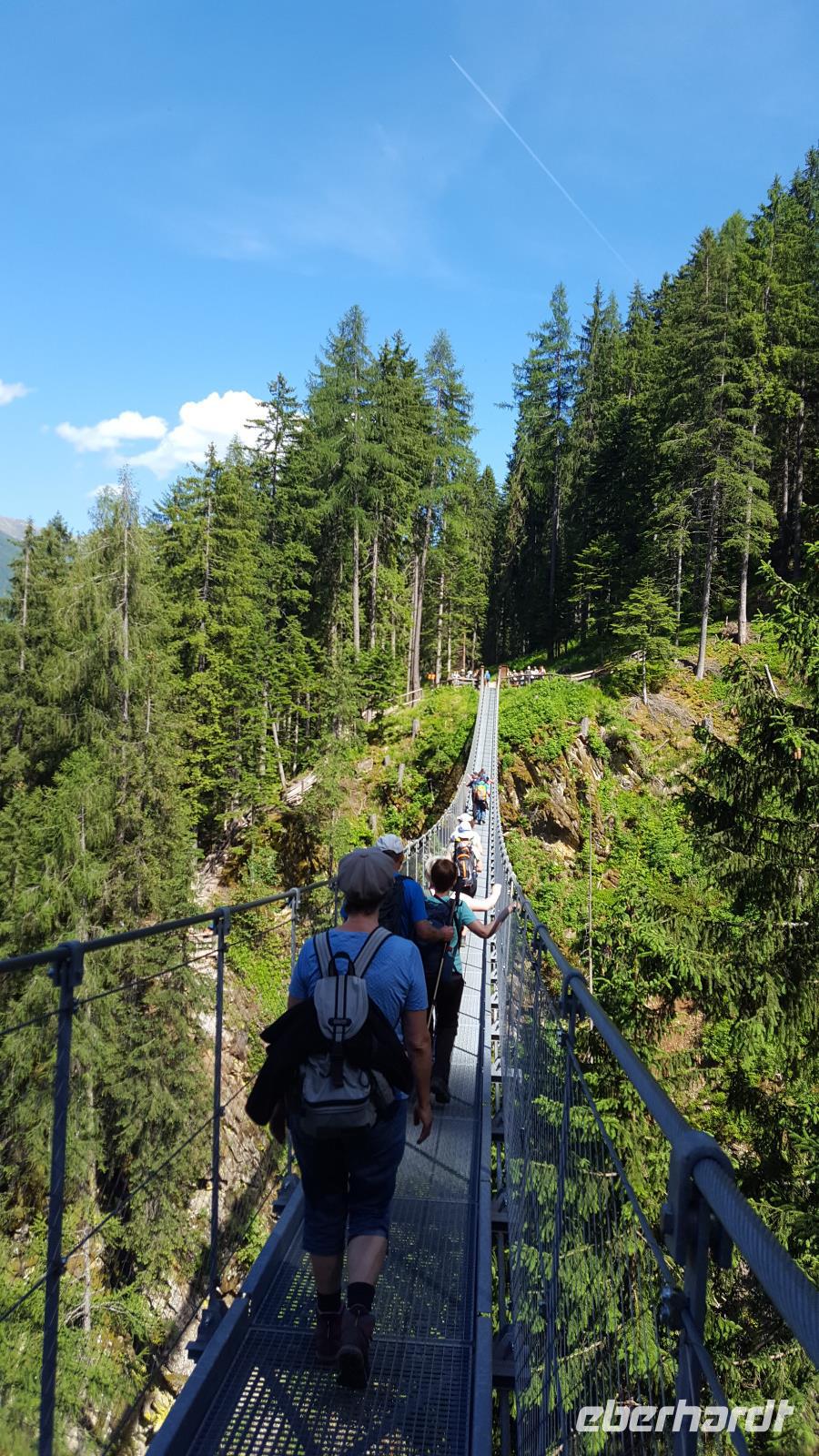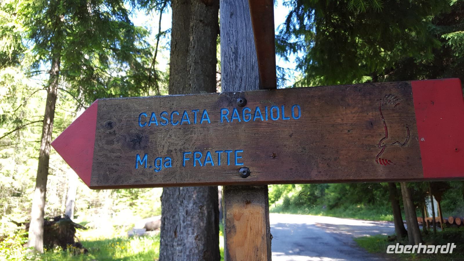 Die Rundwanderung zu den Saent Wasserfällen brachte uns eine der eindrucksvollsten Landschaft des nordwestlichen Trentinos näher. Immer entlang des Wildbaches wanderten wir auf angenehmen Weg bis zur Alm „Stablasolo" auf 1.539 Meter. Dort gab's einen kleinen Espresso zur Stärkung. Langsam wurde der Weg steiler und wir überquerten den Wildbach Rabbi auf einer charakteristischen Holzbrücke. Bester Fotostopp dieser Tour! Immer deutlicher konnten wir das Rauschen des Wasserfalls hören. Stetig schlängelte sich der Weg bergauf bis zur Schutzhütte „Doss dela Cros" 1.799 m.