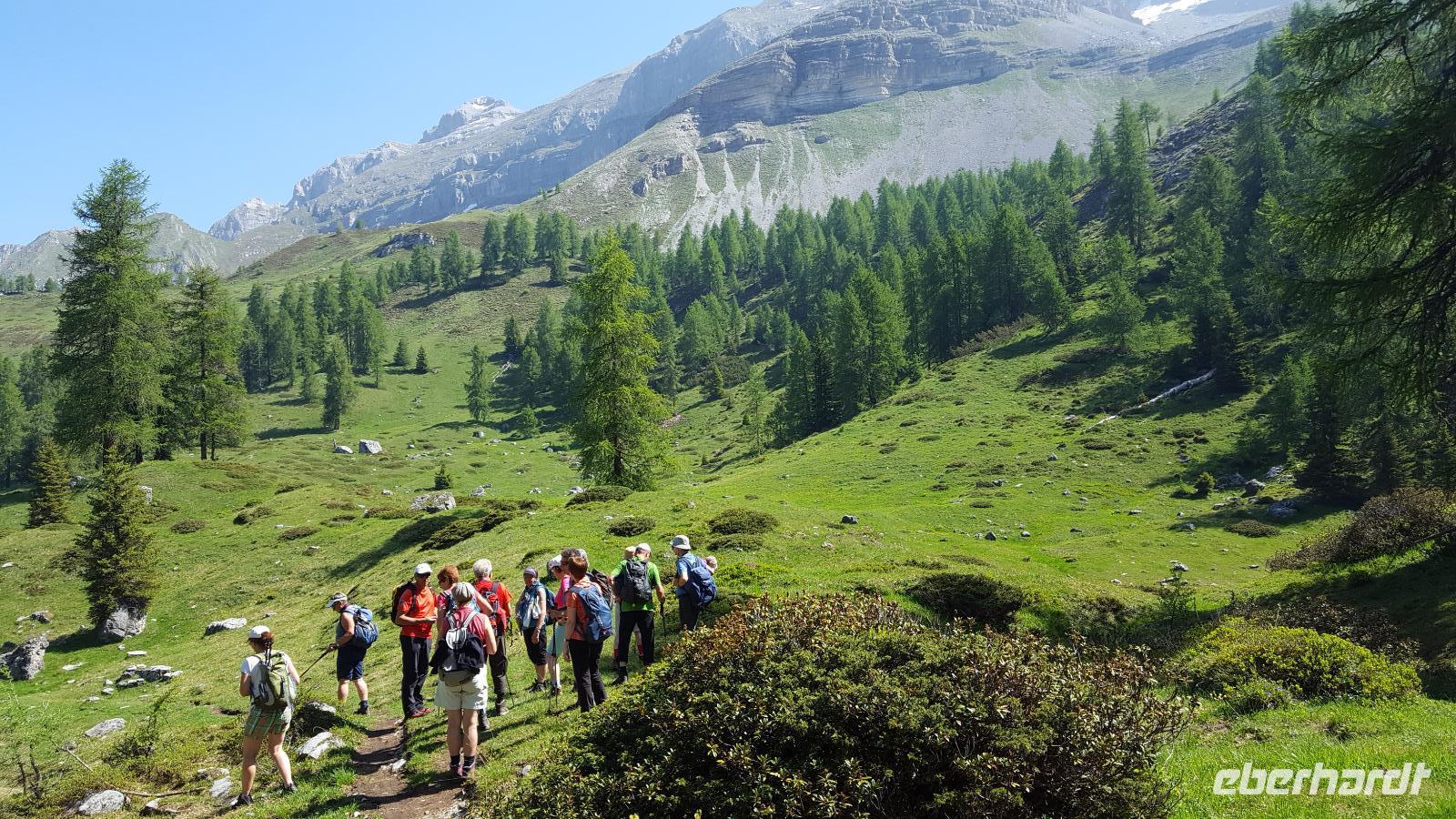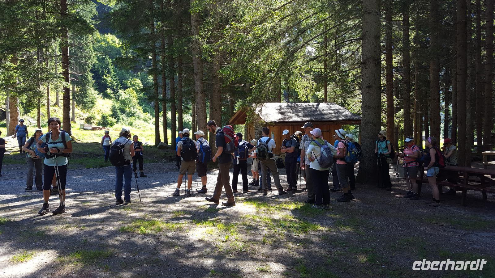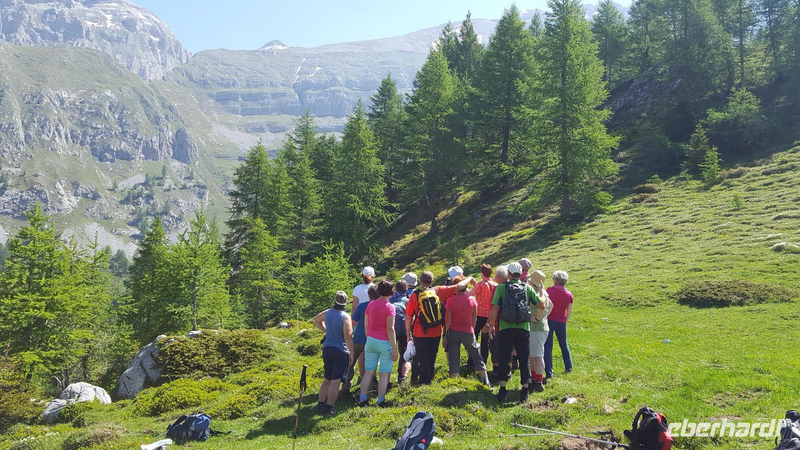 Vom Rifugio Orso Bruno auf 2.200 Meter ging es in Richtung Lago Alto. Somit war die höchste Stelle erreicht. Von dort an ging es über Wiesen und kleine Pfade bergab in Richtung Lago delle Malghette. Jetzt prägte ein schöner Nadelwald aus Fichten und alten Lärchen das Landschaftsbild, bis wir das Nordufer des Lago delle Malghette erreichten. Mittagspause war angesagt und mit fantastischem Blick auf den See schmeckte unser Picknick noch besser. Weiter ging es zur Alm Zeledria auf 1.767 Meter. Von dort war es nicht mehr weit bis zur Giocchi's Bar - Cappuccino Pause und unser Bus stand bereit.