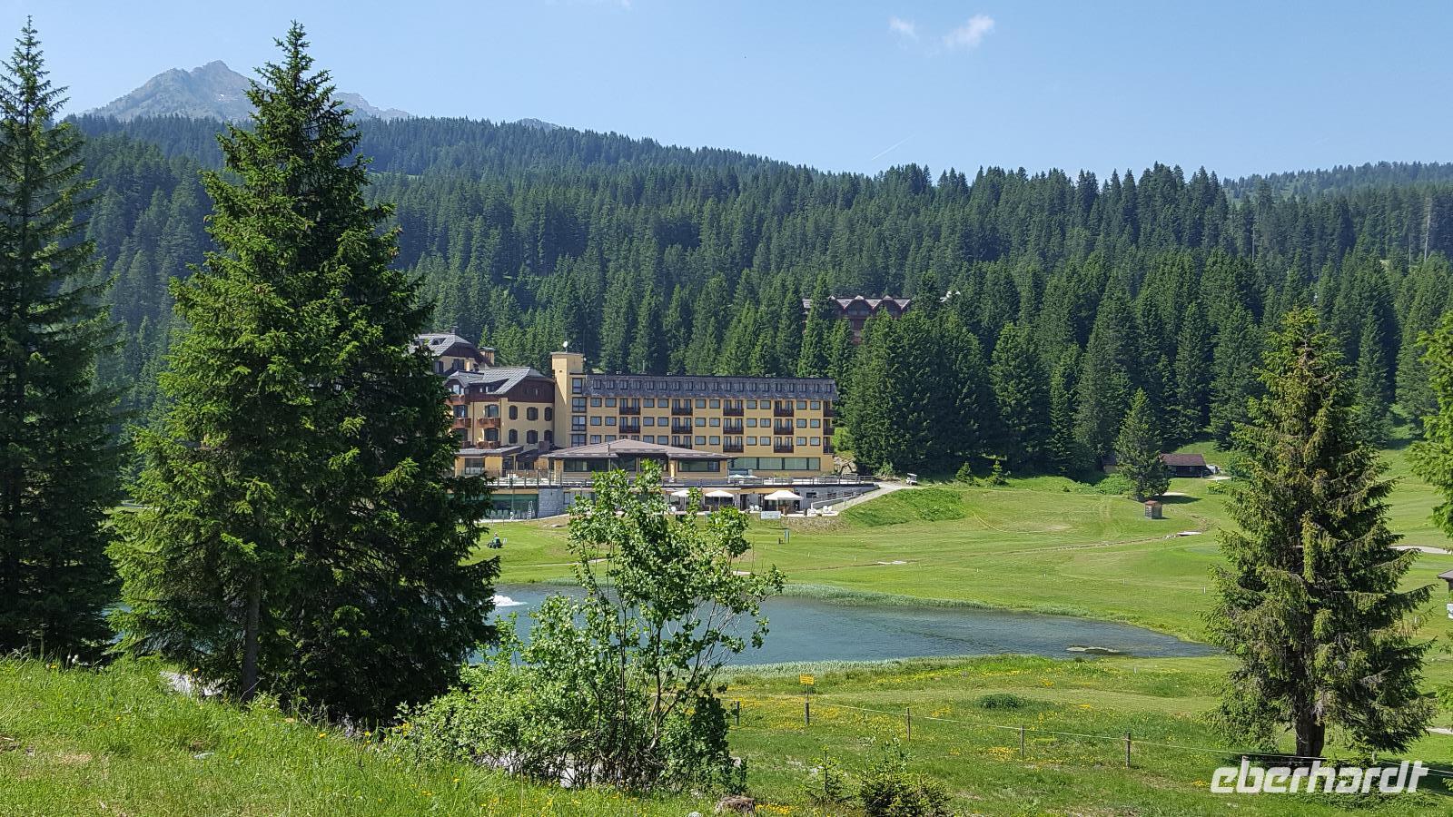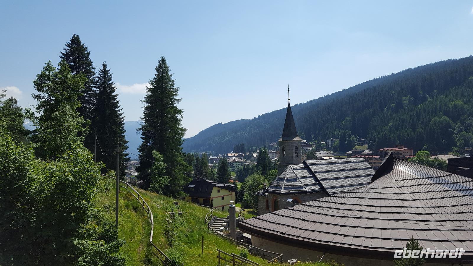 An der schönsten Stelle dieser Tour, am Kreuzungspunkt Dòs del sparavér auf 2.140 Höhenmeter, legten wir eine Pause ein. Direkt vor uns die majestätische Pietra Grande 2.936 m, in südlicher Richtung die Cima Brenta 3.155 m (Adamello Brenta), in westlicher Richtung die Cima Presanella 3.558m (Adamello Presanella) und in nördlicher Richtung die Ortler Gruppe mit dem Monte Cevedale 3.769 m. Am Rifugio „Boch" endete unser inspirierender Rundweg. Weiter ging es in Richtung „Spinale" zur Mittelstation. Auf breiten grünen Ski Pisten schlängelte sich unser Weg hinunter bis nach Madonna die Campiglio. Die wohlverdiente Cappuccino Pause ließ nicht länger auf sich warten. Bekannt wurde der Ort auch durch den Alpinen Skiweltcup. (3-Tre-Rennen).