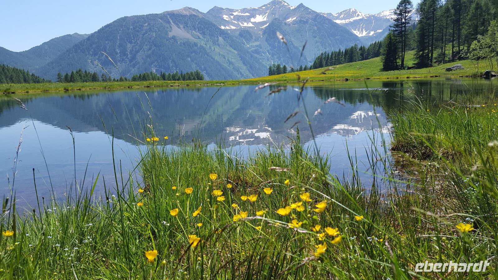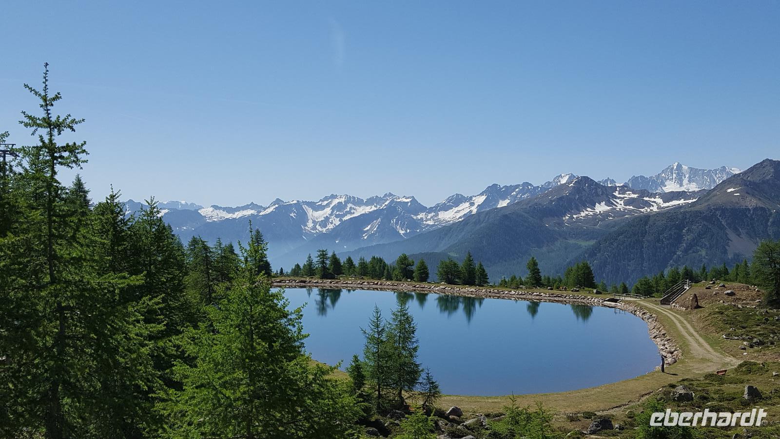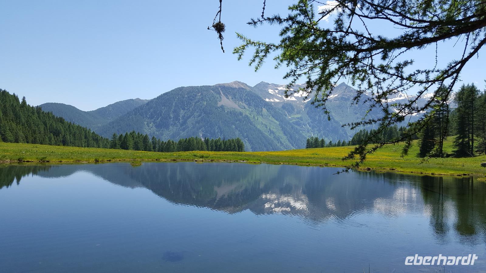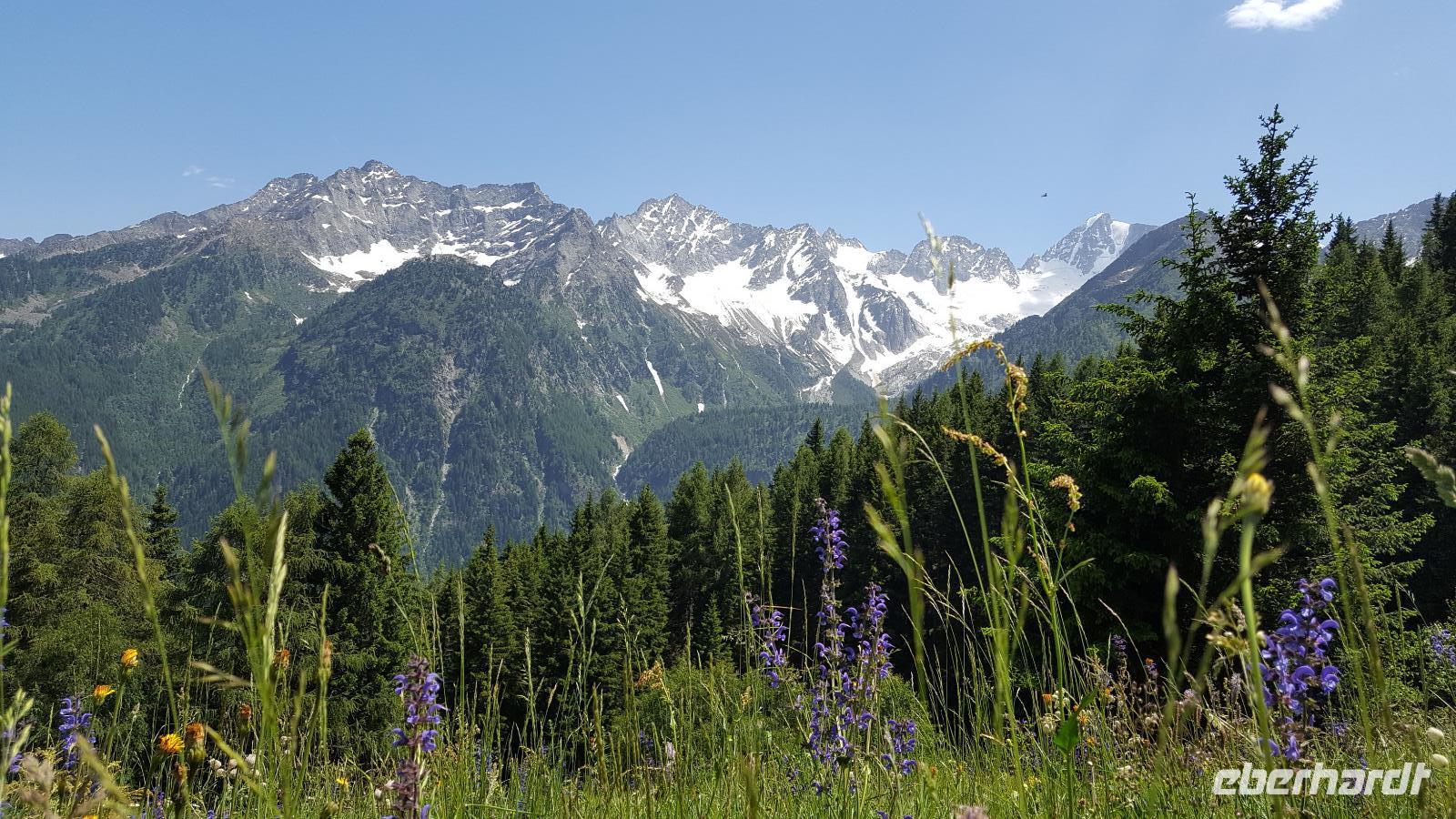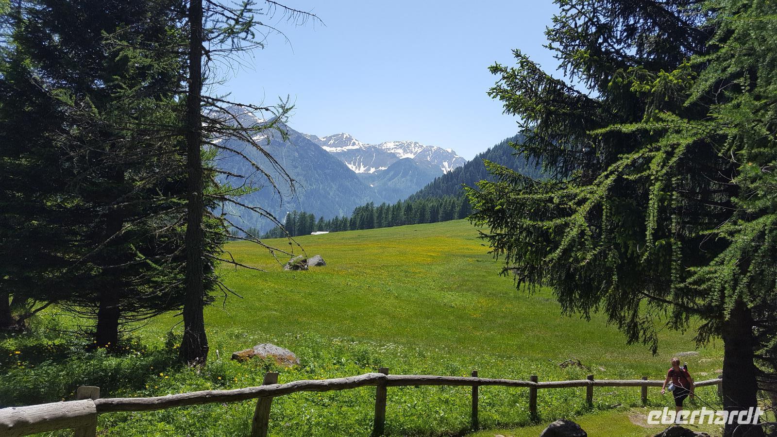 Der Weg war sehr schön, nicht steil und stets mit traumhaften Blicken auf die teils schneebedeckten Berge. Nach kurzem Abstieg erreichten wir den kleinen Bergsee Covel, der malerisch in das Szenario der Bergwelt eingebettet lag. Der Weg führte uns eine Runde um die Covel-Wiese und wir passierten eine charakteristisch geformte Felswand mit einigen Klettersteigen. Bald erreichten wir die Straße, die uns zurück zum Pejo Paese brachte.