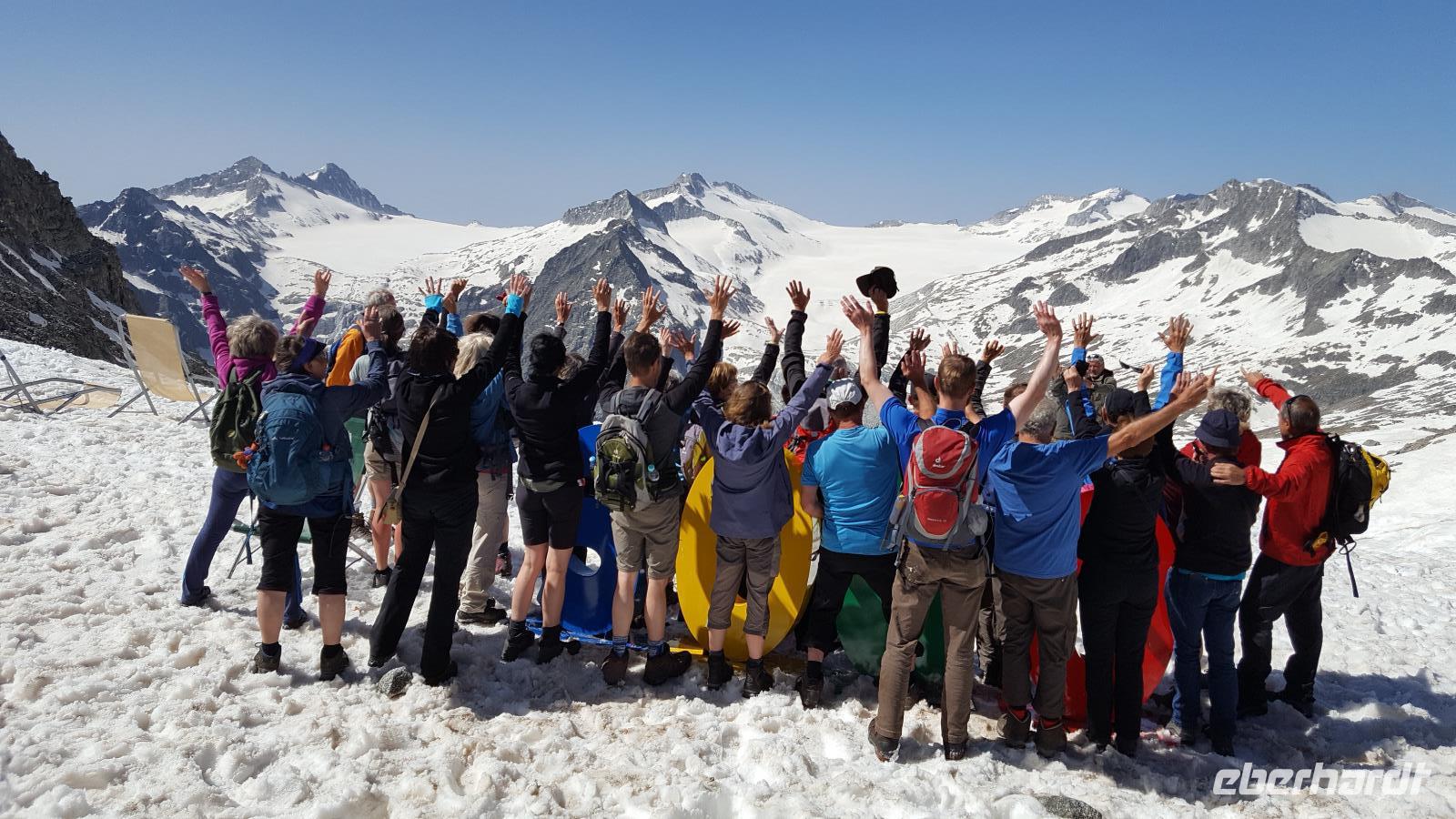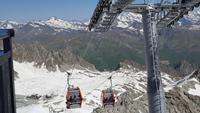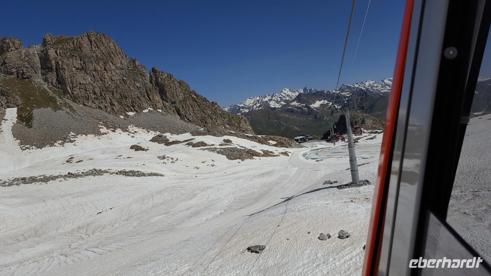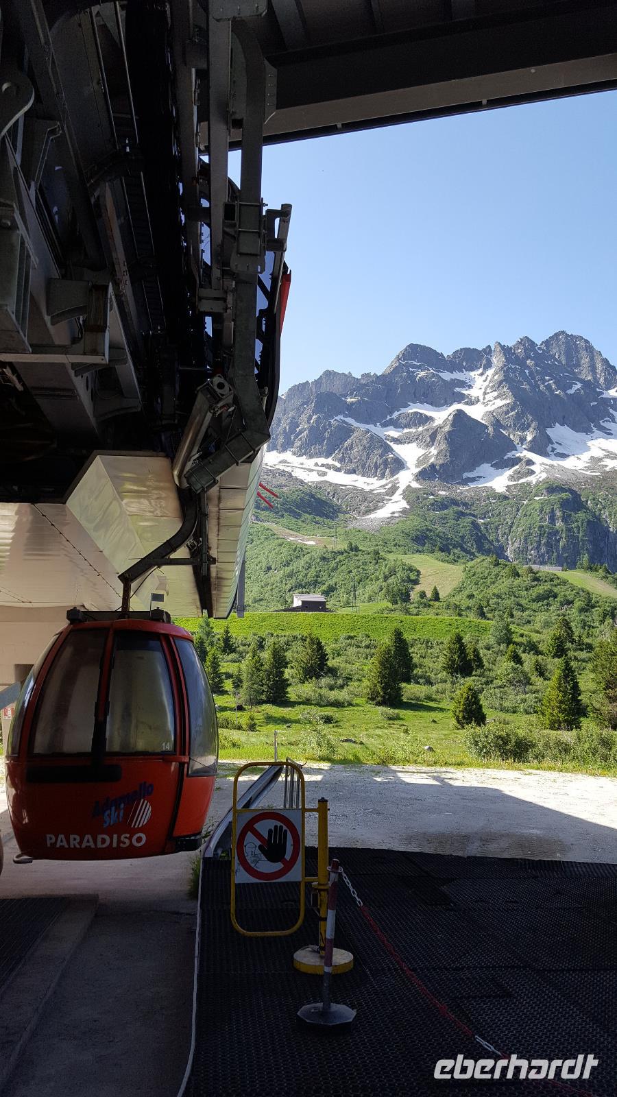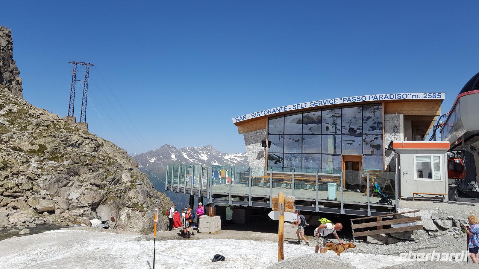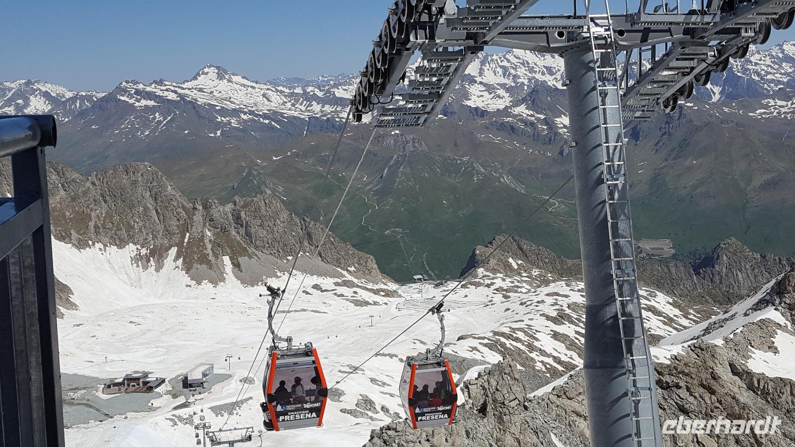 Vom Passo Tonale auf 1.883 m schwebten wir mit der Gondel Adamello Paradiso zur Hütte „Passo Paradiso" auf 2.585 Meter. Von der Mittelstation ging es weiter hinauf auf 3.000 Höhenmeter. Diese moderne Hütte ist erst 2 Jahre alt.
