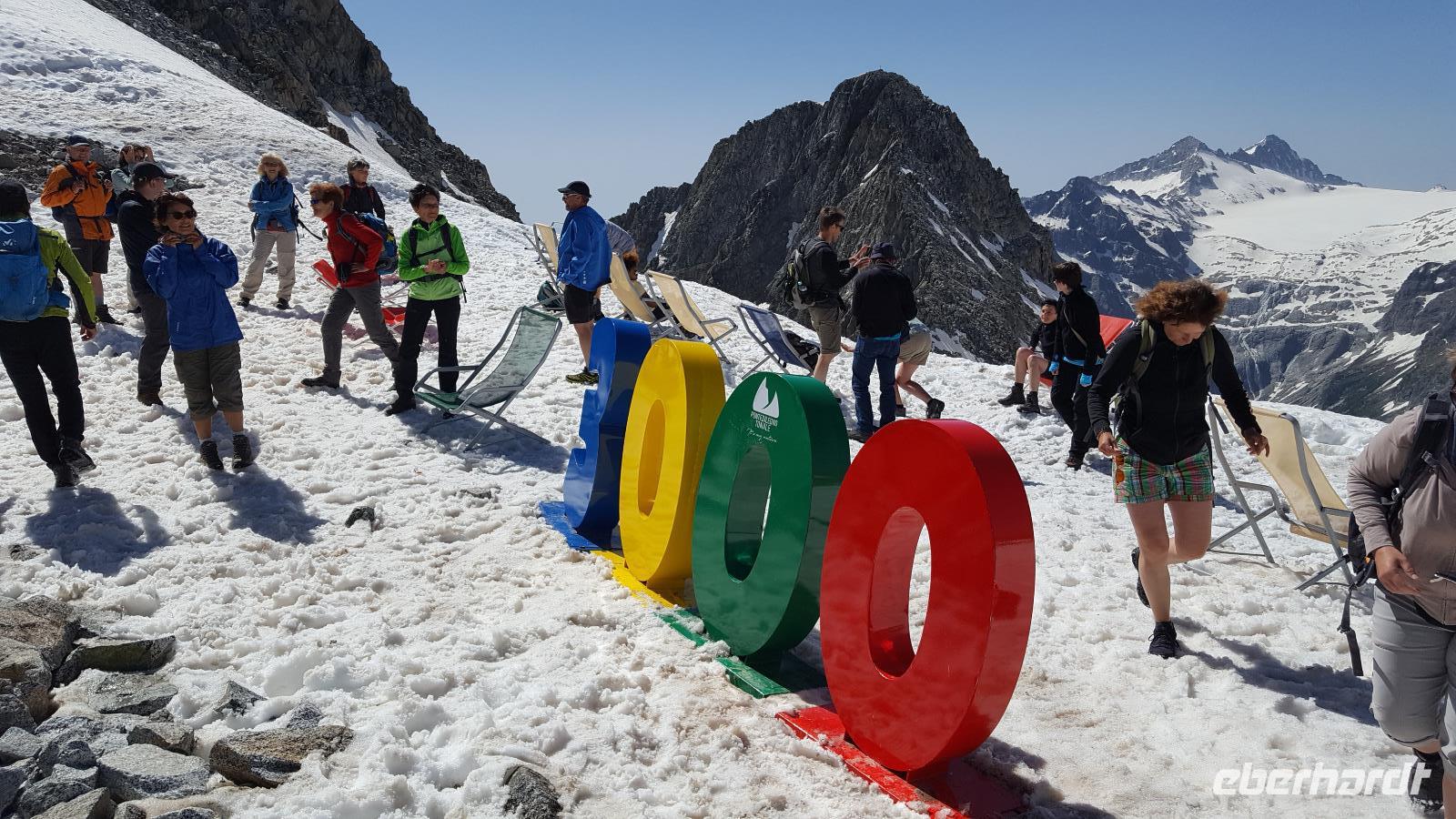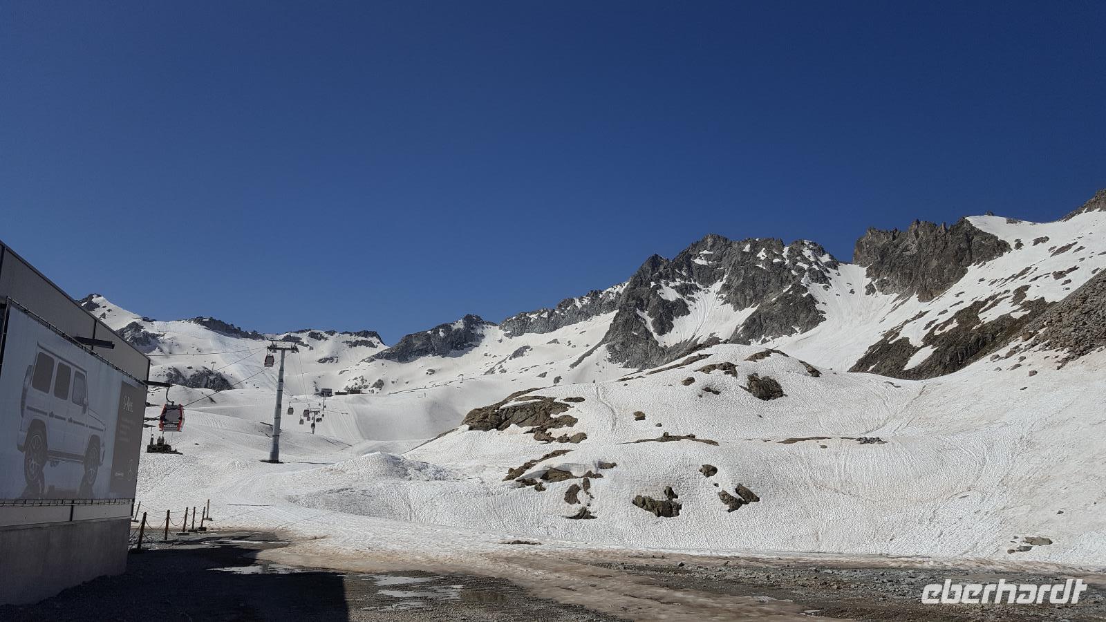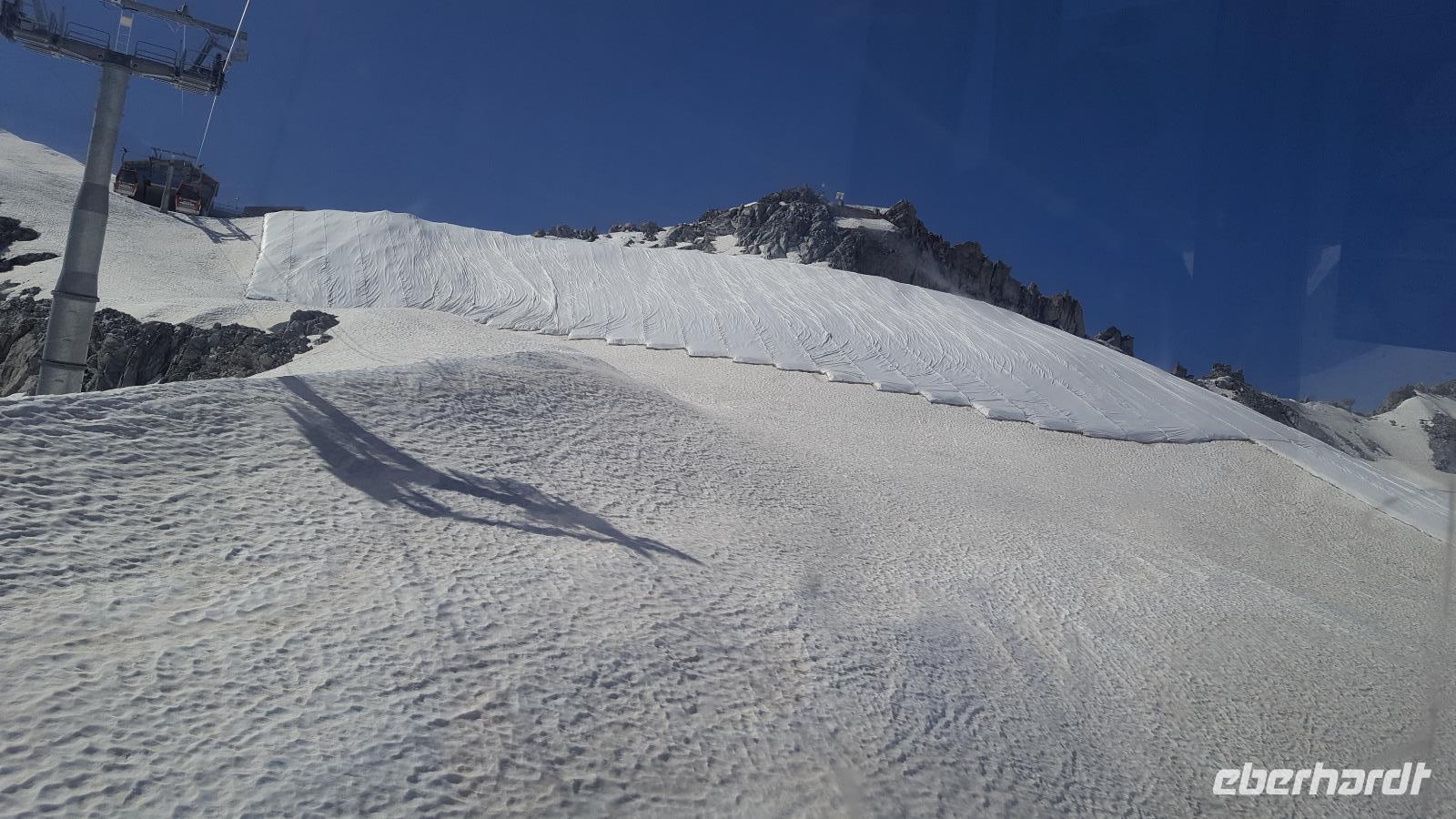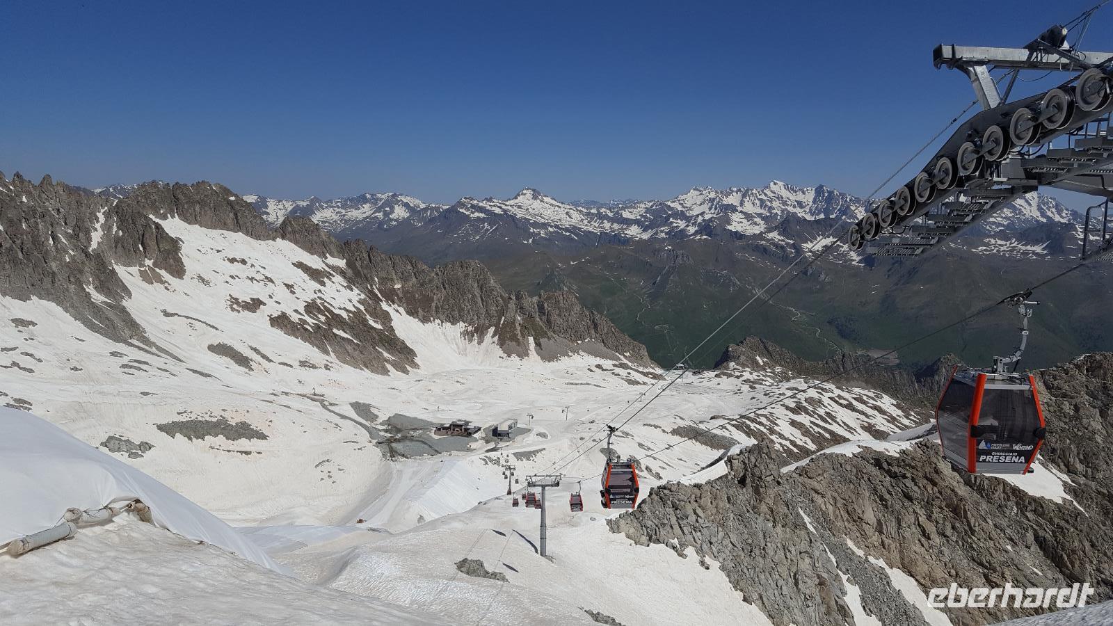 Die Aussicht war gigantisch: Blauer Himmel, kein Wind und gefühlte 100 Gipfel der Adamello Presanella Gebirgsgruppe waren deutlich zu erkennen. Die Kuppe und ein langer Gletscher wurde aufwendig mit weißen Plastik Planen vor der Sonne geschützt. (Klimaveränderung)