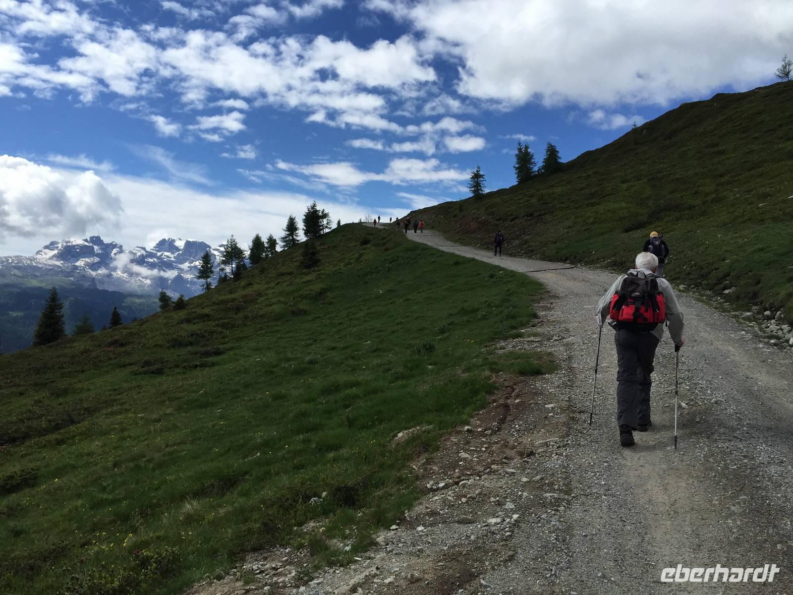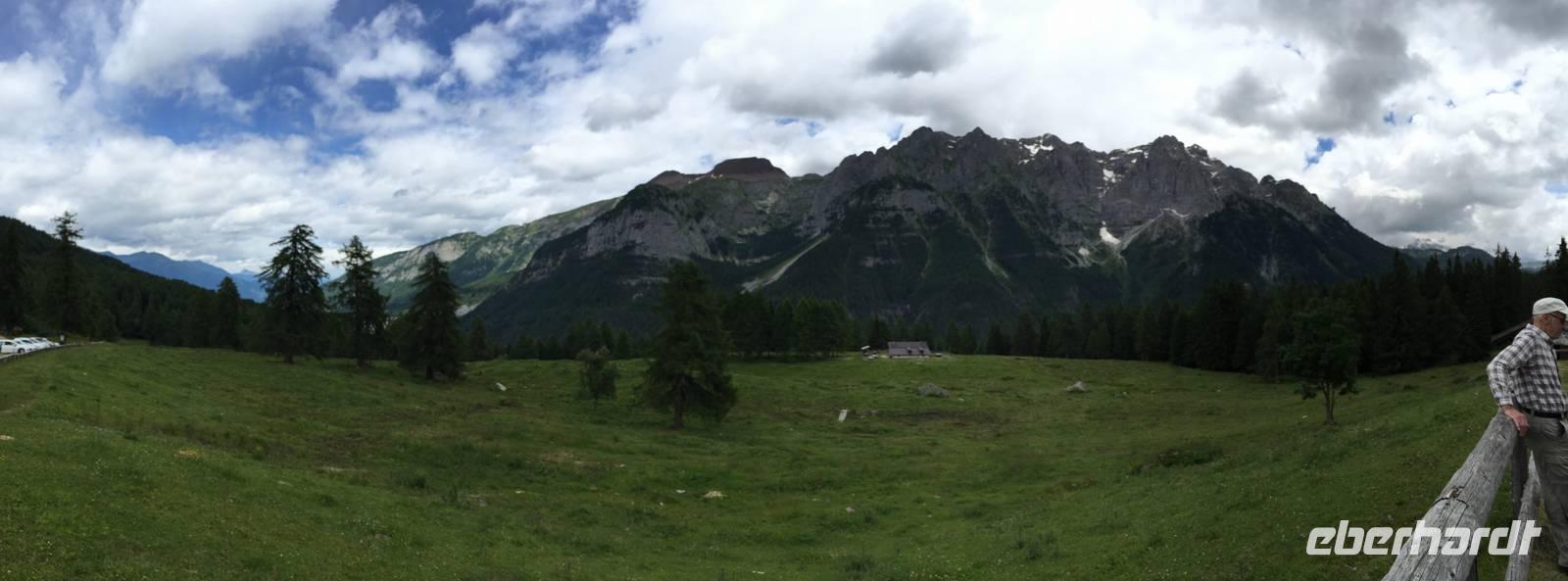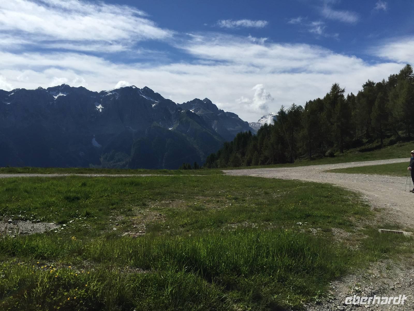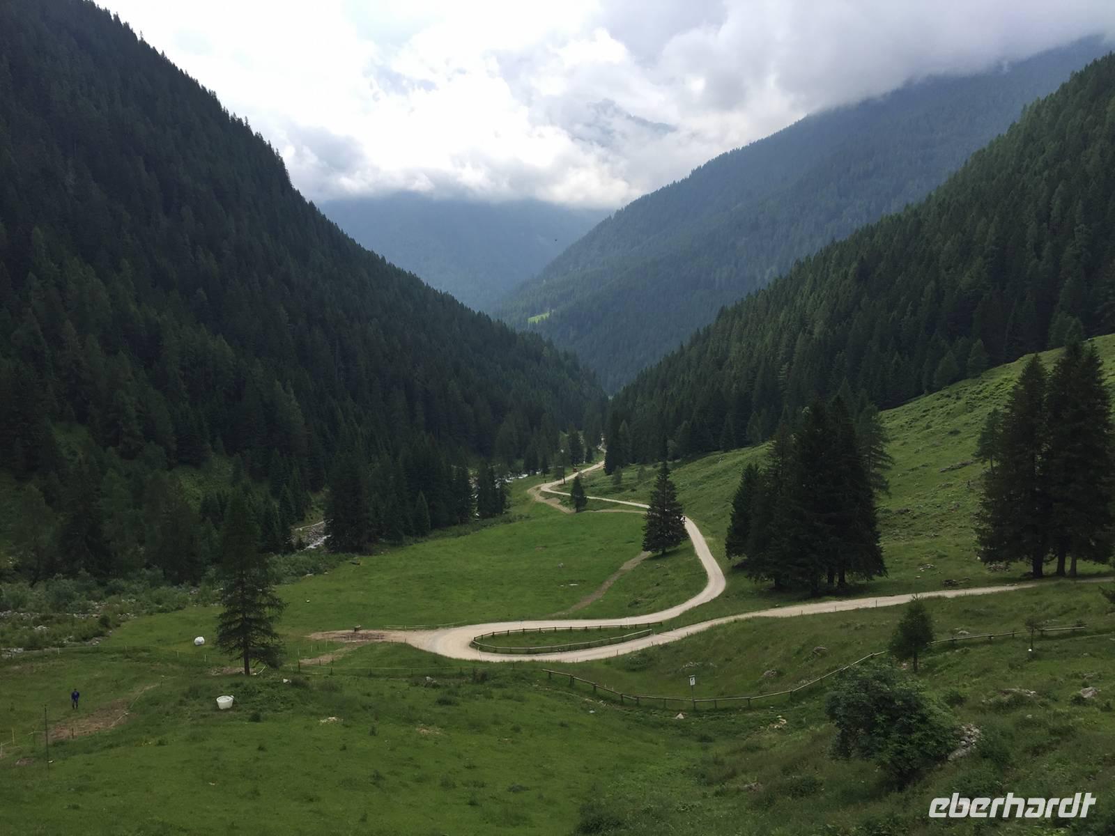 Gut erholt starteten wir unseren letzten Abschnitt in Richtung Passo Campo Carlo Magno (1.681 Meter). Dieser Gebirgspass wurde nach Karl dem Großen benannt, da er angeblich im Jahre 800 auf dem Weg zu seiner Krönung zum Kaiser des Heiligen Römischen Reiches in Rom über diesen Pass gezogen sein soll. Über einen angenehmen Waldweg erreichten wir eine weitere Alm, die wir für eine kurze Pause nutzen. Auf der Asphaltstraße ging es dann hinunter zu unserem Treffpunkt mit unserem Bus, der allerdings etwas auf sich warten ließ.