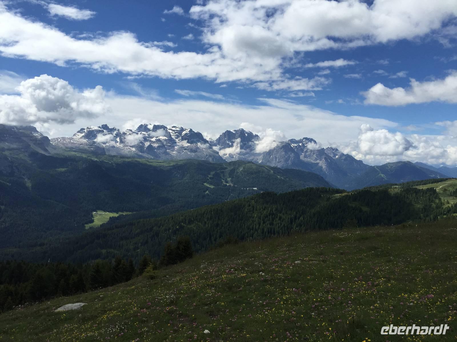 Endlich oben angekommen, wurden wir mit einer schönen, frühlingshaften Blumenwiese belohnt. An der Hütte Vallesinalla di Sopra (1.681 Meter) legten wir unsere Mittagspause ein und danach teilte sich unsere Gruppe auf. Die Gipfelstürmer wanderten mit Rino eine extra Runde bis zur Casinèi-Hütte (1.825 Meter) und die Genießer wanderten gemütlich mit mir zurück zur Hütte Vallesinella, wo wir bei Kaffee und Apfelstrudel auf unsere Gipfelstürmer warteten.
