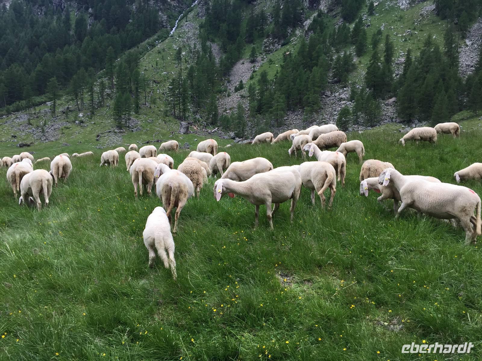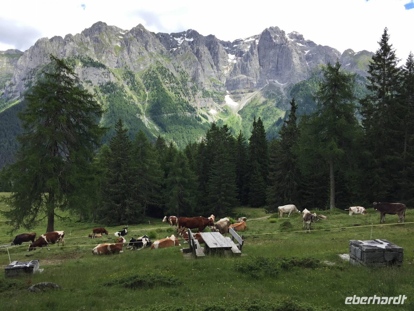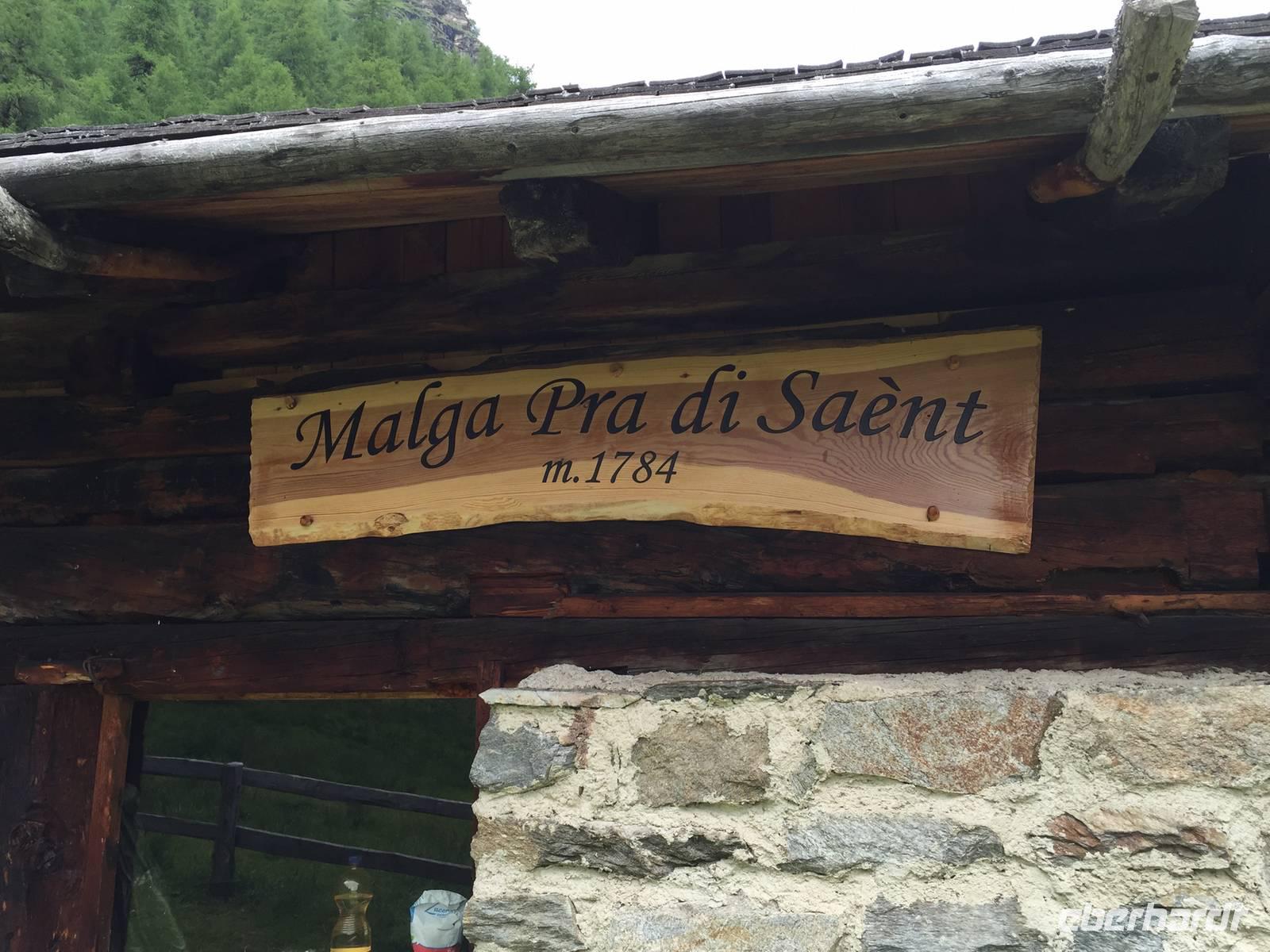 Für unsere heutige Wanderung stiegen wir zunächst in den Reisebus und kamen nach wenigen Minuten Busfahrt in das Rabbi-Tal, welches seinen Namen vom gleichnamigen Wildbach erhielt. Die Rundwanderung zu den Saent Wasserfällen brachte uns in eine der eindrucksvollsten Ecken des nordwestlichen Trentino, zum Fuße der schäumenden Wassersprünge des Wildbaches Rabbies. Immer entlang des Wildbaches wanderten wir auf einem angenehmen Weg bis hinauf zur Stablasolo-Alm auf 1.539 Metern. Hier hielten wir nur kurz für einen stärkenden Espresso. Auf einer charakteristischen Holzbrücke überquerten wir dann den Fluss Rabbi. Langsam wurde es steiler und aus dem schönen Saumpfad neben dem Wasserlauf wurde ein Wanderweg. Schon hier haben wir das Rauschen des mächtigen Wasserfalls zu hören bekommen. Wir stiegen immer weiter hinauf und kamen an verschiedene Aussichtspunkte, von denen wir die Absätze des Wasserfalls bewundern konnten. Da wir alle noch gut drauf waren und das Wetter super war, stiegen wir weiter hinauf und kamen schließlich auf eine weite Hochfläche. Idyllisch lag hier die Alm Pra di Saent auf 1.784 Metern, ein Bach plätscherte und eine große Schafherde zog herum. Zeit für eine Pause!