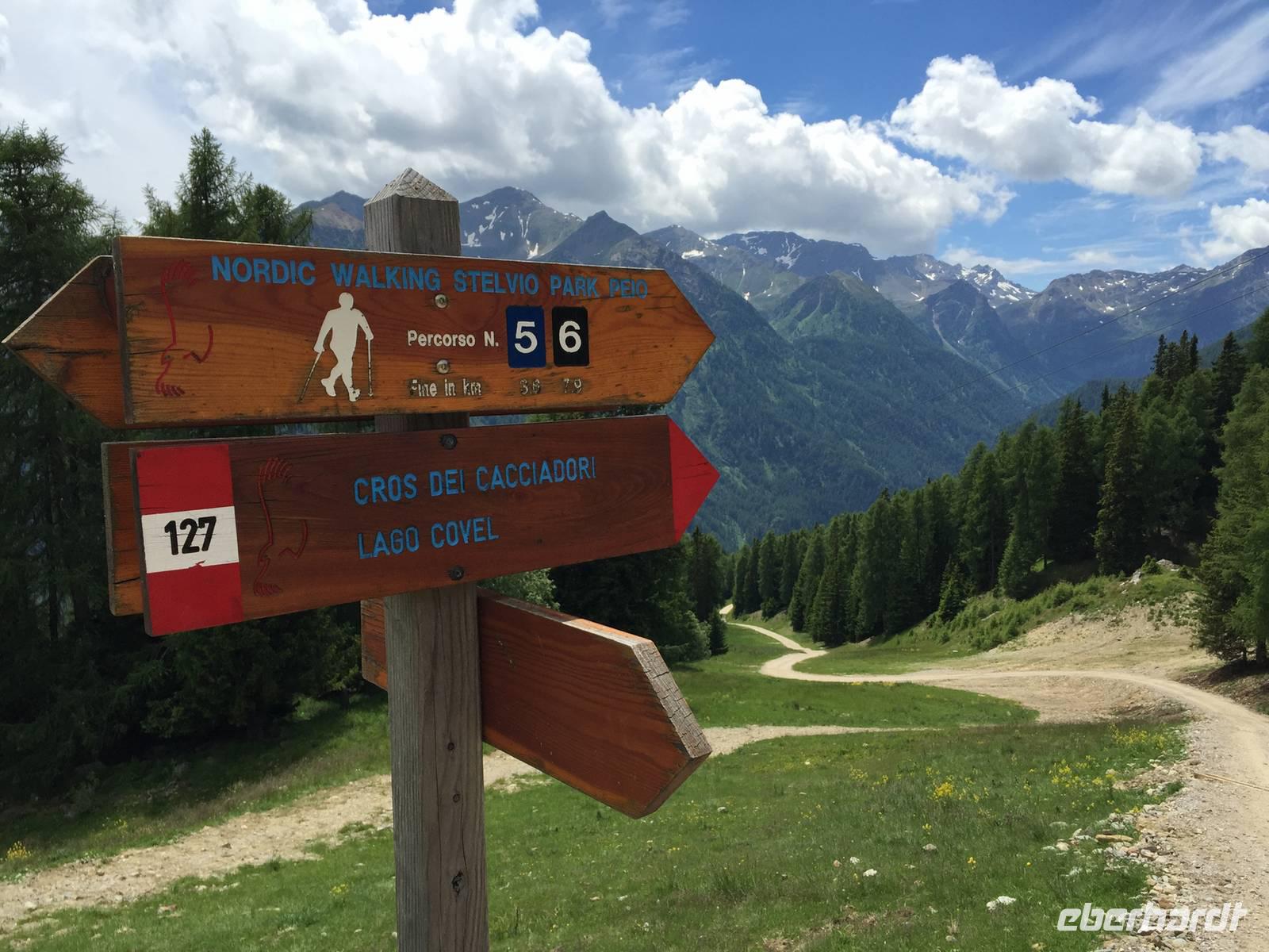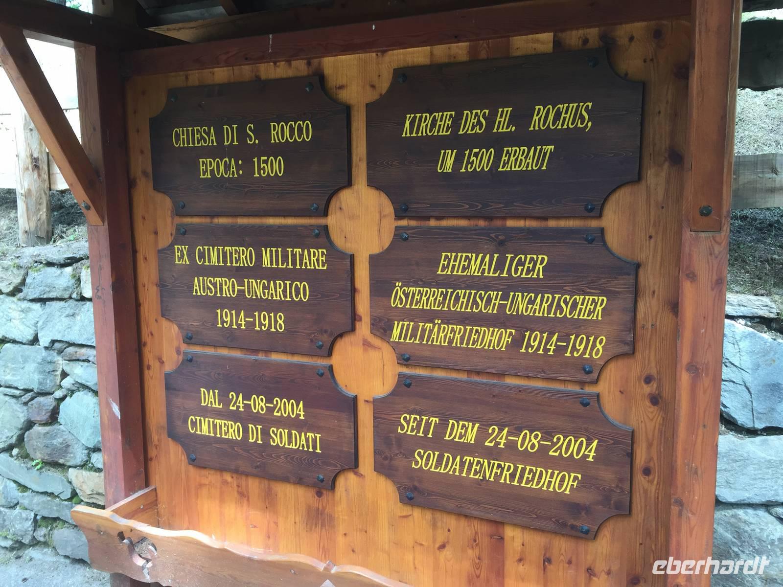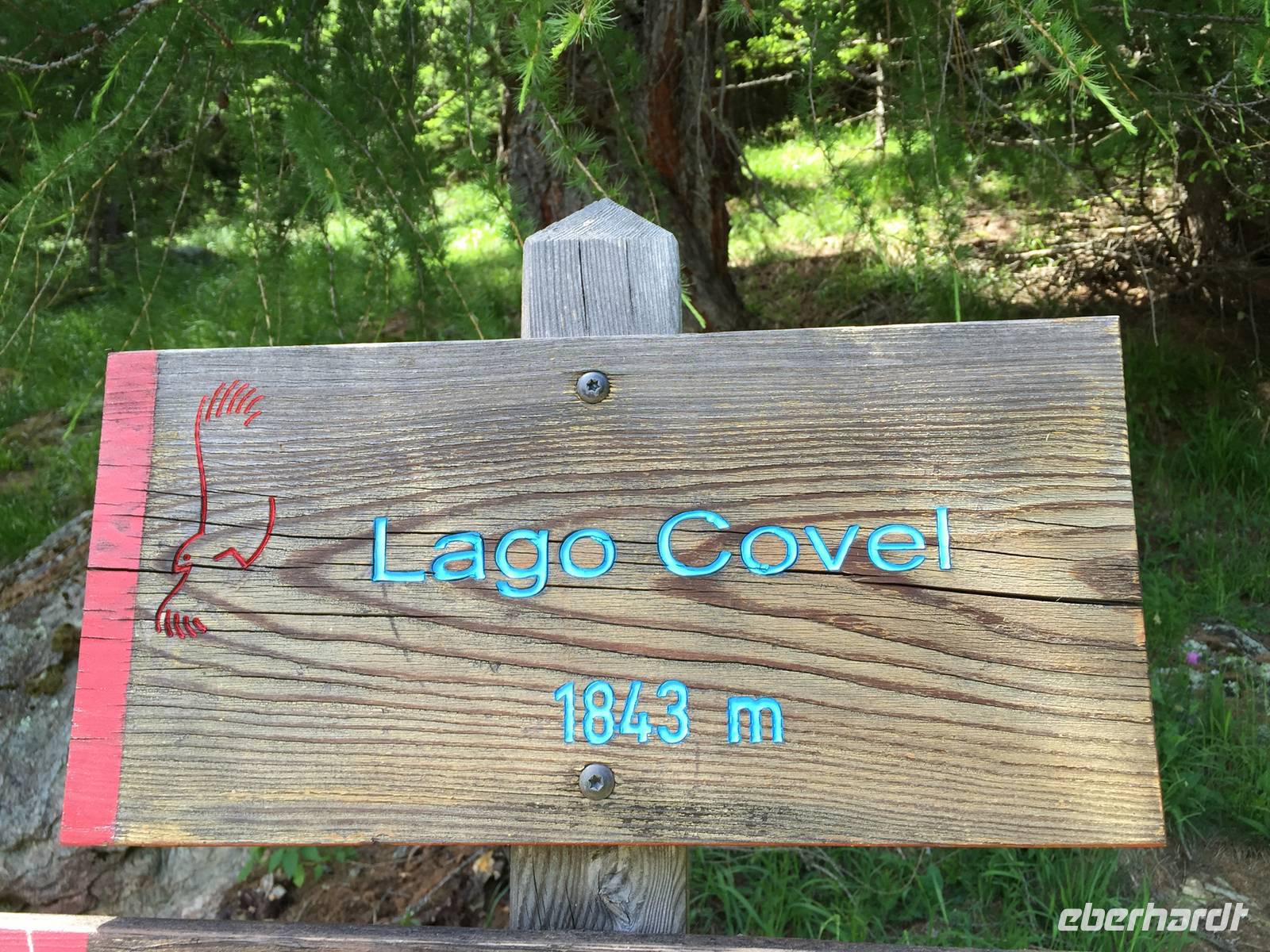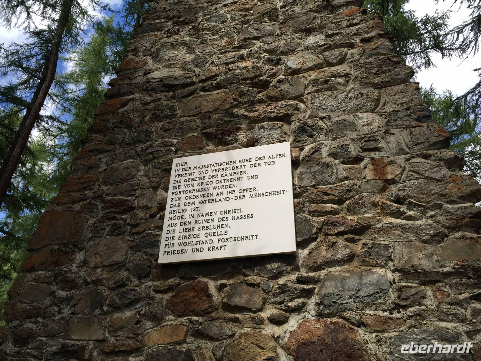 Nach einem kurzen steilen Abstieg erreichten wir den kleinen Covel-See, der malerisch in das Szenario der Bergwelt eingebettet liegt. Der Weg führte uns eine weite Runde um die große Covel-Wiese und wir passierten auch eine charakteristisch geformte Felswand mit einigen Klettersteigen. Nun erreichten wir die Straße, die uns zurück zum Dorf Peio brachte. Hier kamen wir noch an einem Militärfriedhof vorbei, wo neben Soldaten des ersten Weltkrieges auch die bekanntesten Bergführer von Pejo begraben wurden.
