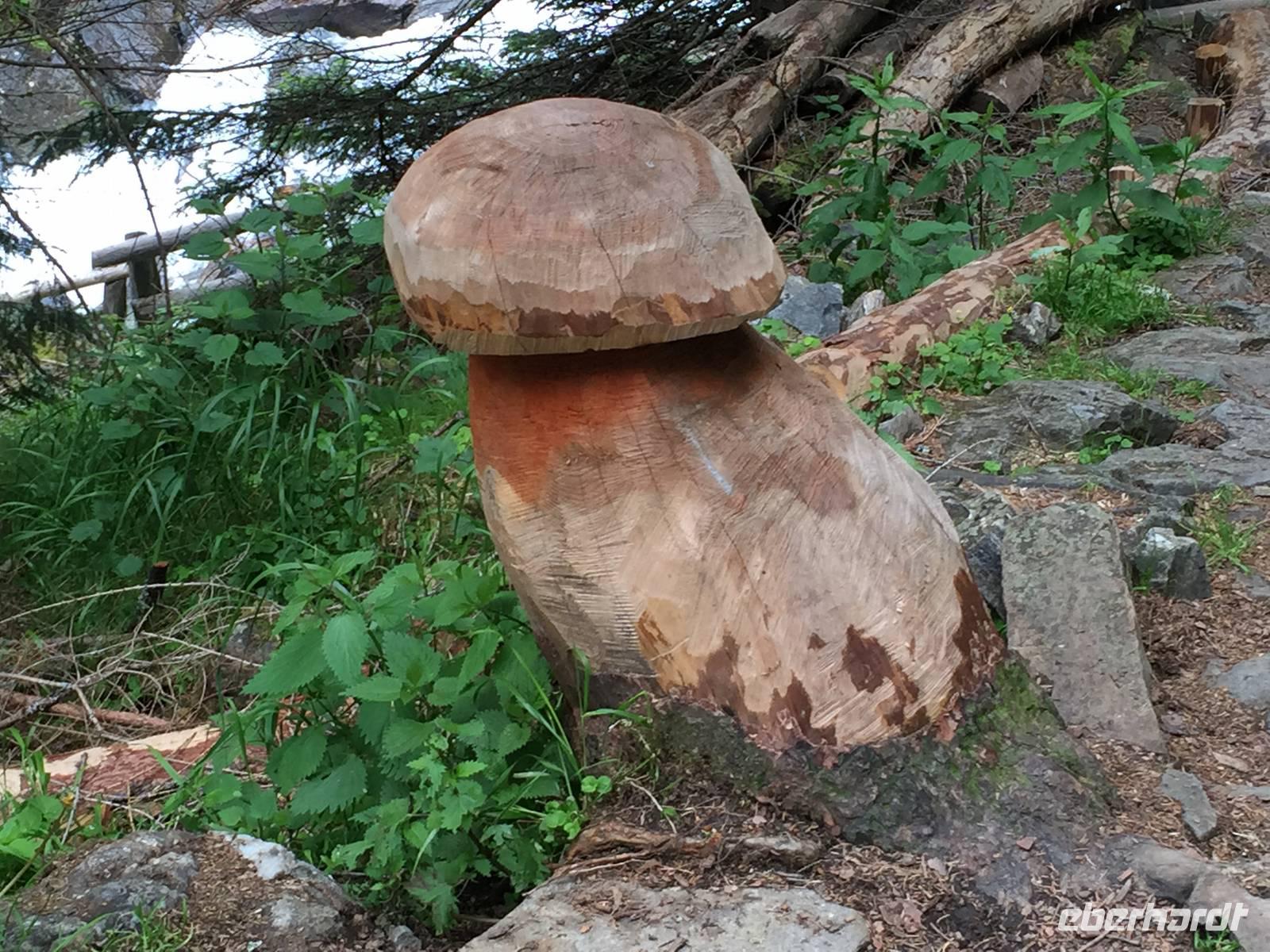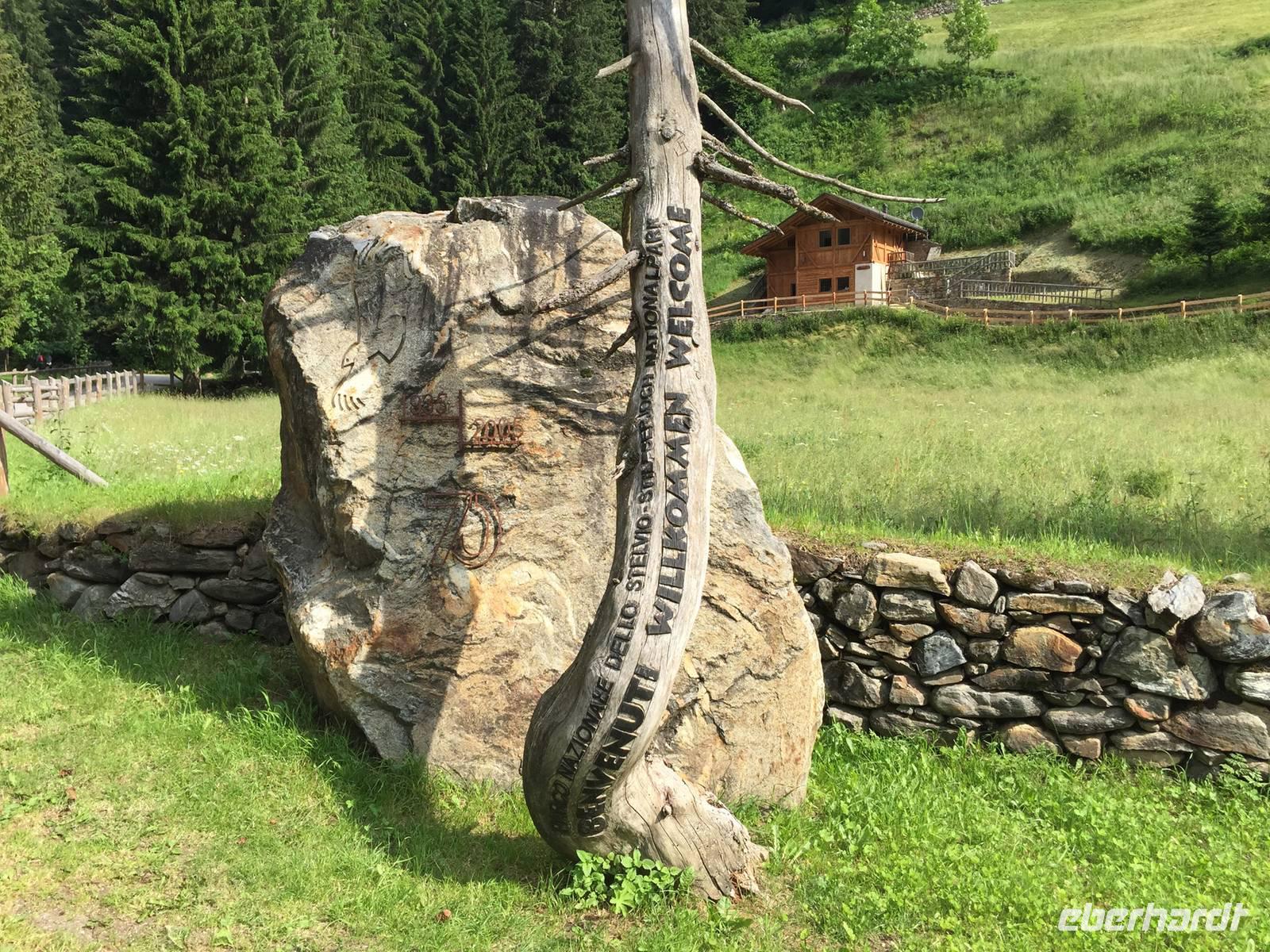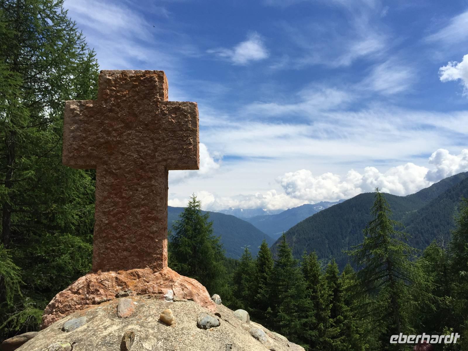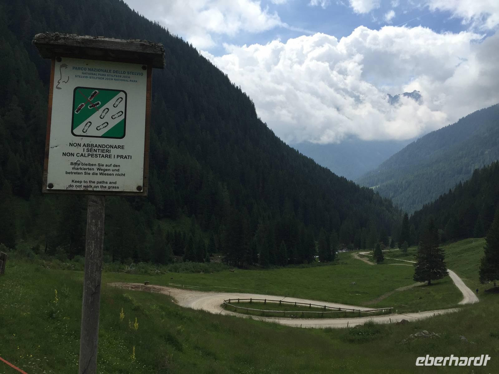 Nach einem kurzen steilen Abstieg erreichten wir den kleinen Covel-See, der malerisch in das Szenario der Bergwelt eingebettet liegt. Der Weg führte uns eine weite Runde um die große Covel-Wiese und wir passierten auch eine charakteristisch geformte Felswand mit einigen Klettersteigen. Nun erreichten wir die Straße, die uns zurück zum Dorf Peio brachte. Hier kamen wir noch an einem Militärfriedhof vorbei, wo neben Soldaten des ersten Weltkrieges auch die bekanntesten Bergführer von Pejo begraben wurden.