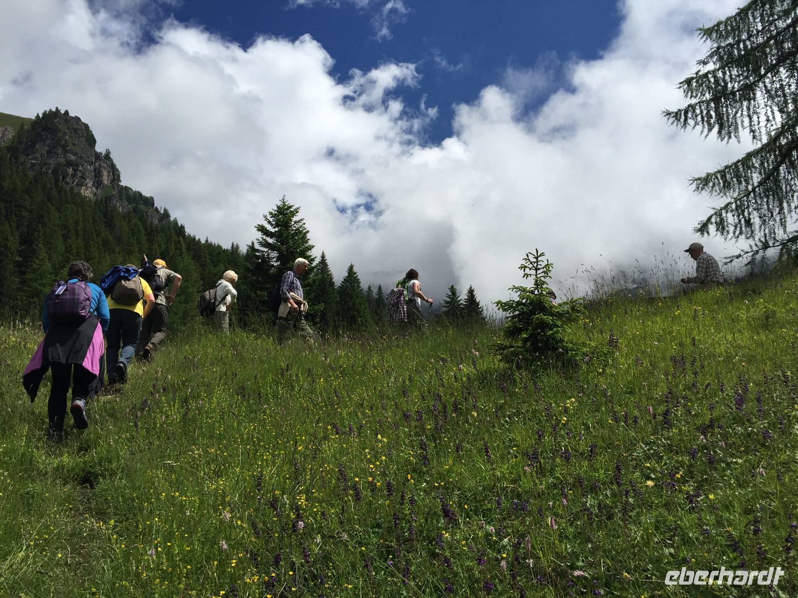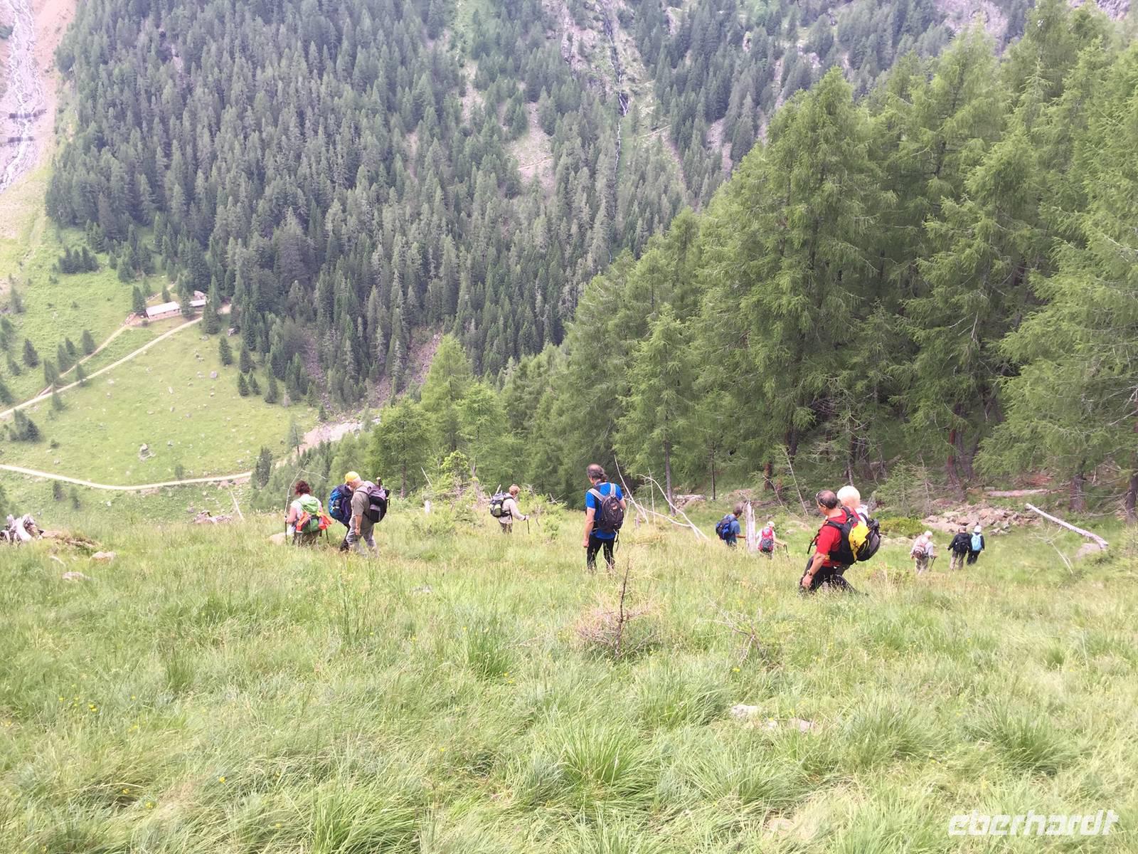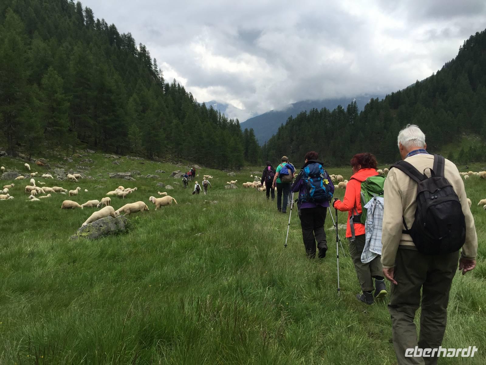 Doch der Großteil der Gruppe war nicht müde zu kriegen und so legten wir noch eine extra Runde ein und wanderten auf der "Treppe der monumentalen Lärchen" bis wir wieder an der Alm ankamen. Nach einer Verschnaufpause (der Weg war wirklich anspruchsvoll) wanderten wir gemütlich auf der Wiese, zwischen den Schafen hindurch in Richtung Ausgangspunkt unserer Wanderung. Teilweise hatten wir einen atemberaubenden Blick ins Rabbi-Tal und die umliegenden Bergmassive. Für den Abstieg hinunter zur Alm Stablasolo war Aufmerksamkeit geboten, es ging etwas steil hinab! Müde, aber glücklich und zufrieden erreichten wir die Hütte, wo es noch einen abschließenden Espresso, Cappuccino oder ein erfrischendes Radler als Belohnung gab.