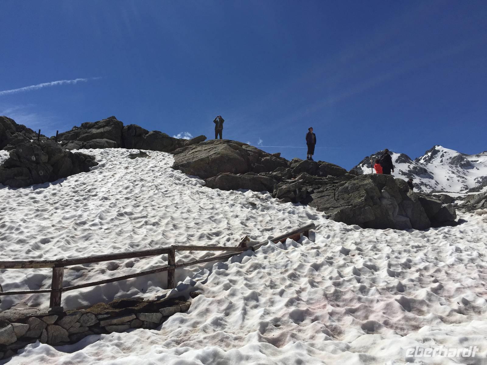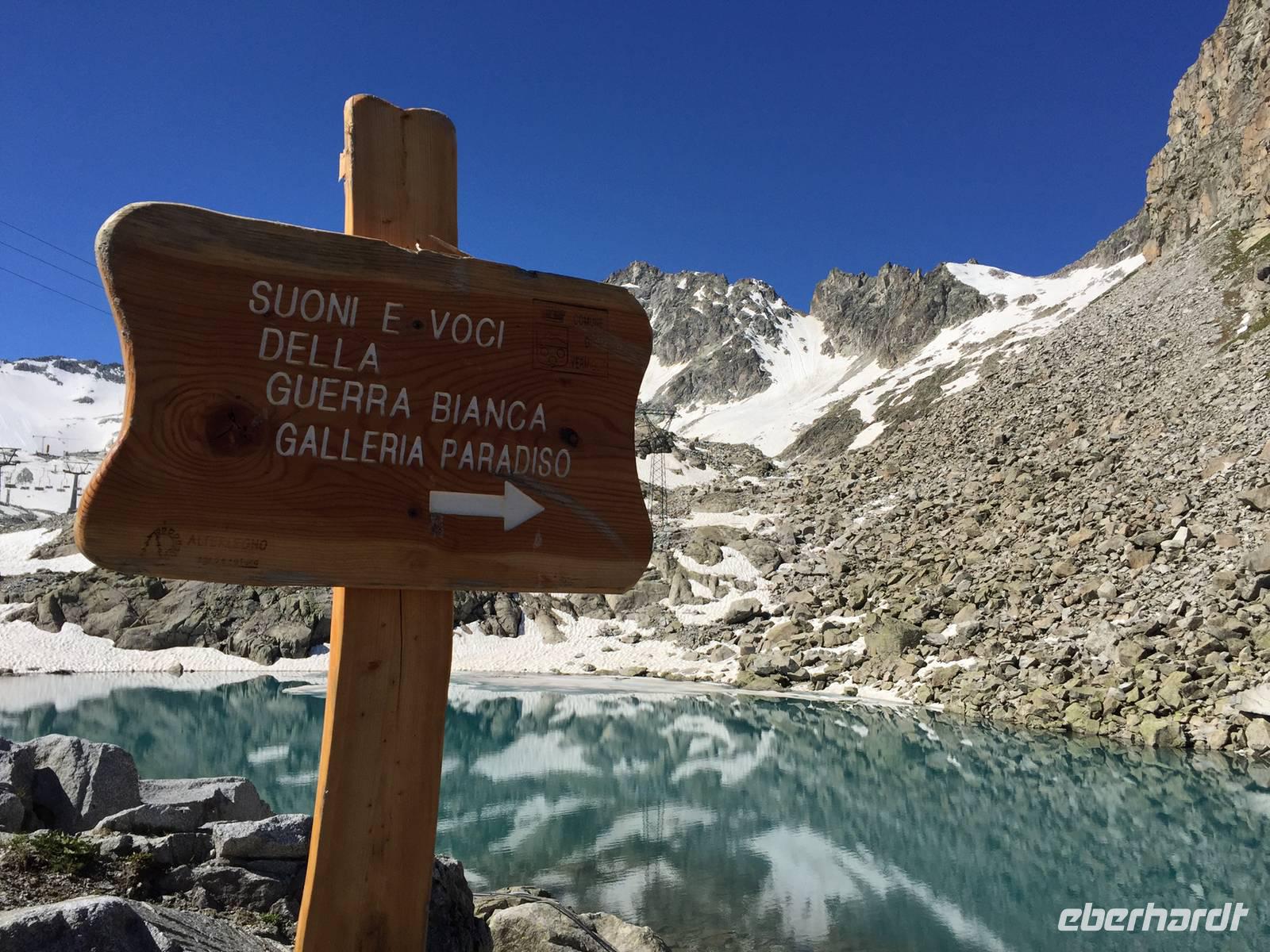 Wieder ein neuer Tag, wieder eine erlebnisreiche Wanderung. Heute haben wir drei Gastwanderer aus der anderen Wandergruppe dabei, die den letzten Tag etwas ruhiger angehen wollten. Mit dem Bus erreichten wir den Passo Tonale auf 1.883 Metern und somit die Grenze zur Region Lombardei. Vor unserer Wanderung schwebten wir mit der Seilbahn in Windeseile hinauf auf 2.599 Meter. Bei herrlichstem Sonnenschein glitzerte der Schnee richtig schön. Hier besichtigten wir das Militär-Denkmal und den Museumstollen, der die Härte der Soldaten im Ersten Weltkrieg anschaulich darstellte - es muss grausam gewesen sein!