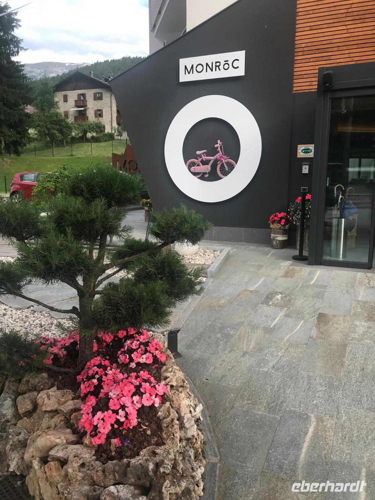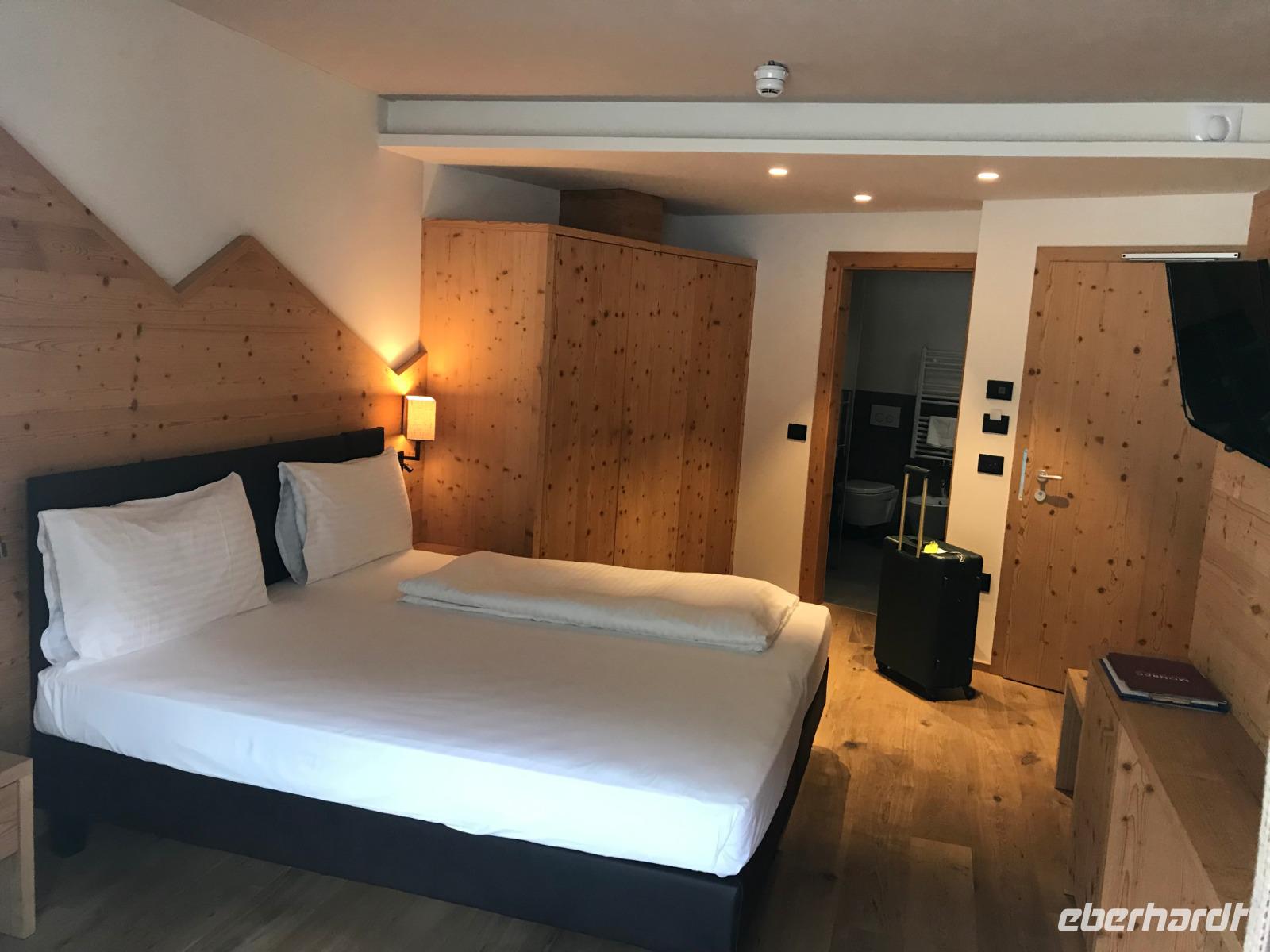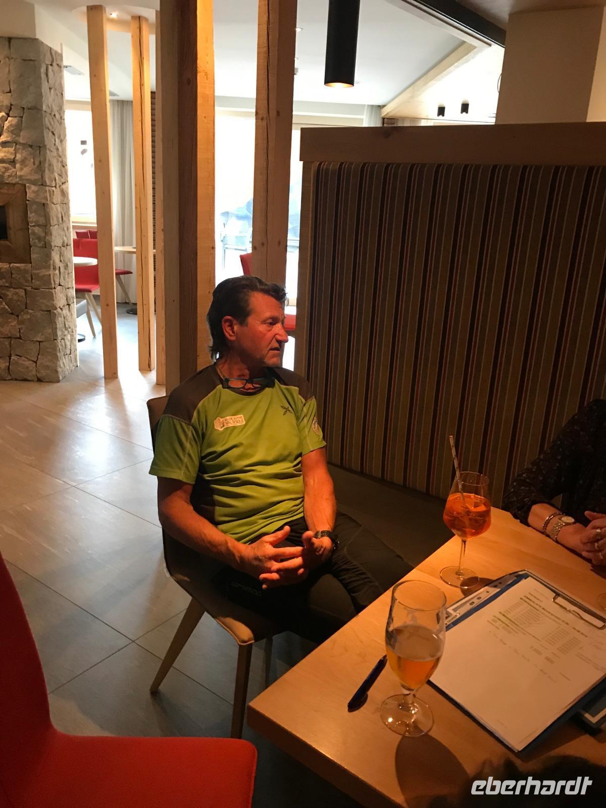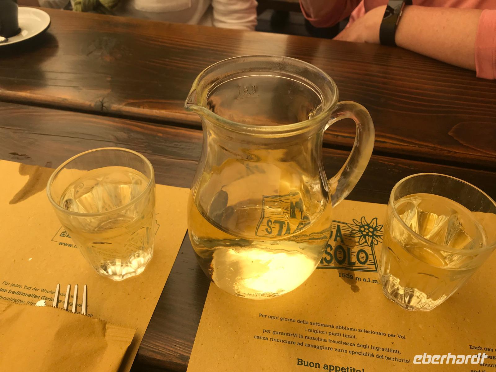 Die Fahrt von der Autobahn bis zum Hotel dauerte noch reichlich eine Stunde und so waren wir 18:35 Uhr glücklich in den zwei Viersternehäusern Tevini und Monroc angekommen. Es war alles perfekt vorbereitet, die Inbesitznahme der sehr schönen Zimmer ging reibungslos über die Bühne. Und so fanden wir uns kurz nach 19:00 Uhr in der Lobby und stimmten uns mit dem Begrüßungsdring gemeinsam mit dem Wanderführern Rino und Armando auf die Woche ein.