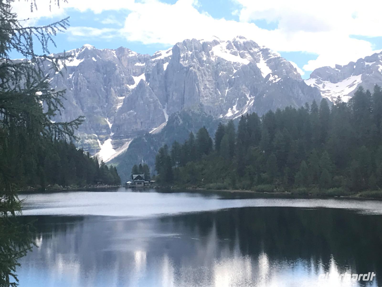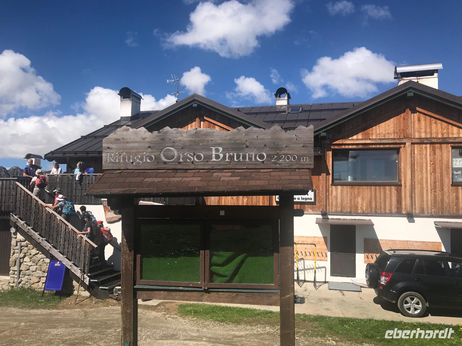 Die leistungsstärkere Gruppe läuft vorbei an einem Bergstausee und dem Rifugio Doss dei Cempri (2.315m) zurück zur Seilbahnstation. Dort finden wir uns zu einer gemeinsame Rast im Rifugio Scoiattalo wieder.