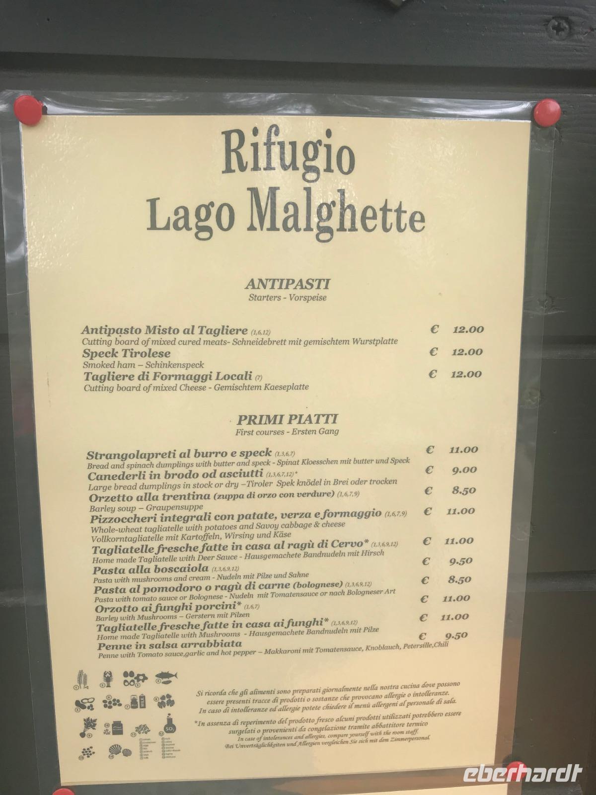 Die andere Gruppe nahm den direkteren, etwas kürzeren Weg. In der Hütte am See, dem Refugio Lago belle Malghette fanden wir wieder. Nach einer ausgiebigen Rast, Radler war das beliebteste Getränk, ging es weiter Richtung Tal.