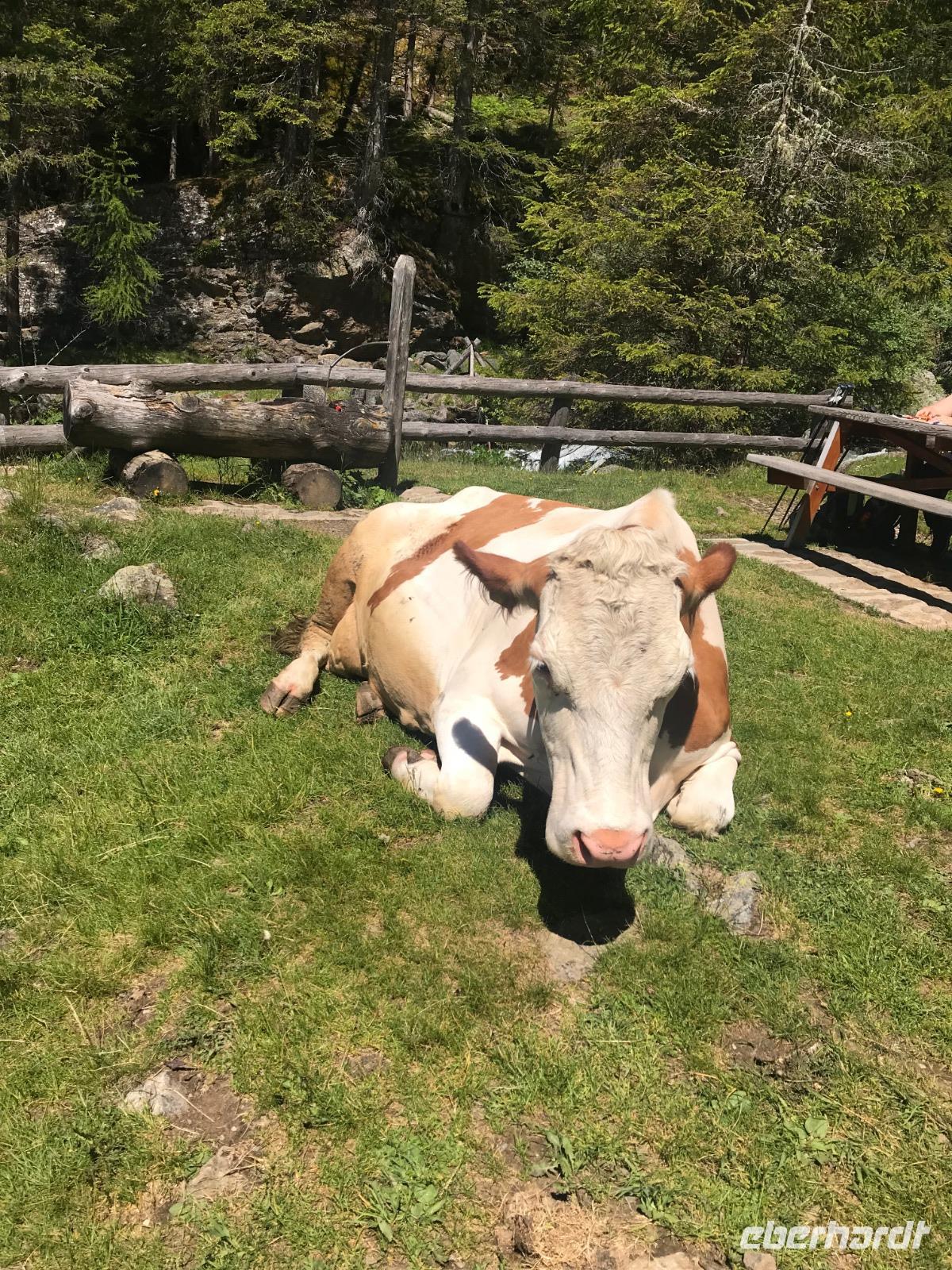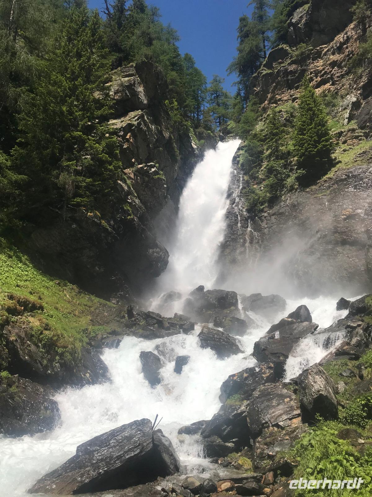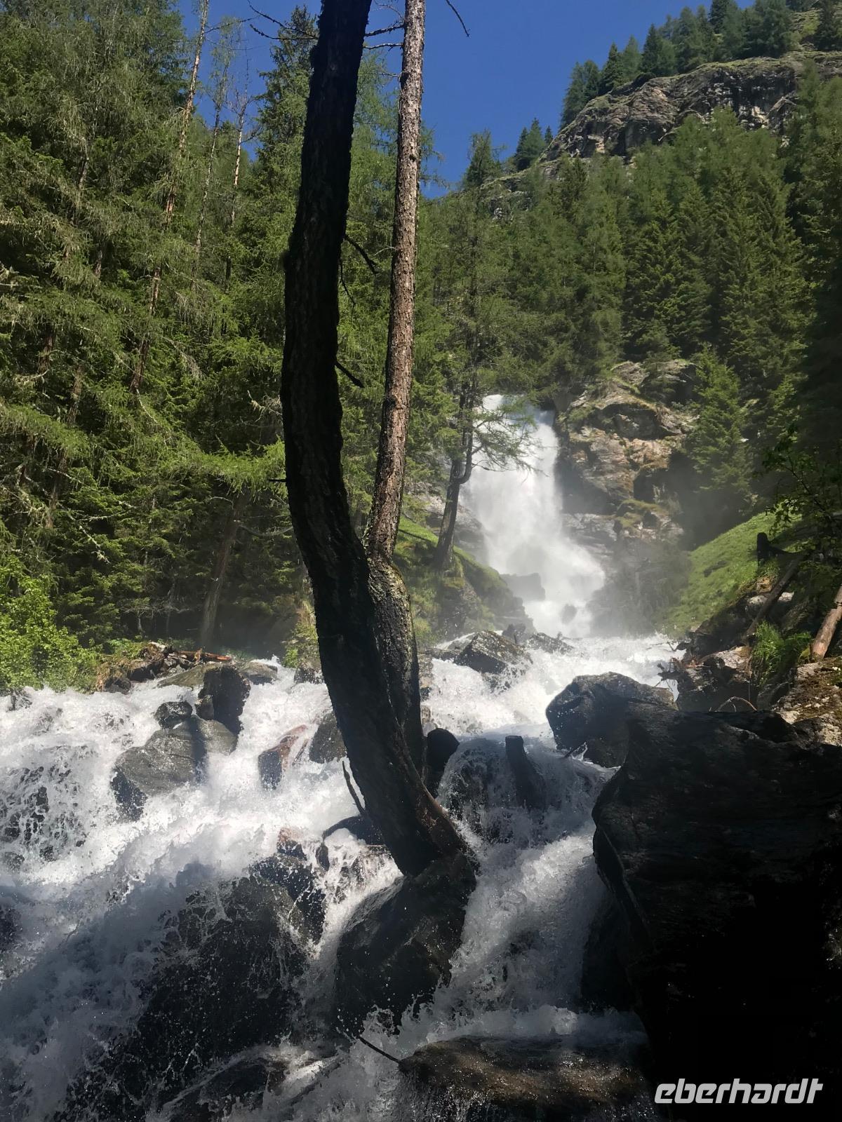Los ging es am Campingplatz und schnell schützte uns der Wald vor der unerbittlichen Sonne. Die Strablaso Alm mit seiner schönen Hütte ignorierten wir vorerst, es zog uns hinauf zu den Wasserfällen. Der Weg wurde schmaler, führte über diverse Holzbrücken und das Rauschen der Cascate di Sent wurde immer lauter. Dann erlebten wir, wie das Wasser ins Tal schoss. Zwei Wasserfälle gab es zu bewundern. Hinter dem letzten Wasserfall erklommen wir noch eine Anhöhe und hielten Mittagsrast. Gestärkt ging es noch kurz in eine benachbarte Talsenke, wo sich atemberaubende Bergansichten boten. Zurück gab es einen alternativen Weg. So war der Abstieg sehr ruhig und ohne Gegenverkehr. Jetzt kehrten wir in der Hütte Malga Stablasolo im Val di Rabbi auf 1539 m Höhe ein.