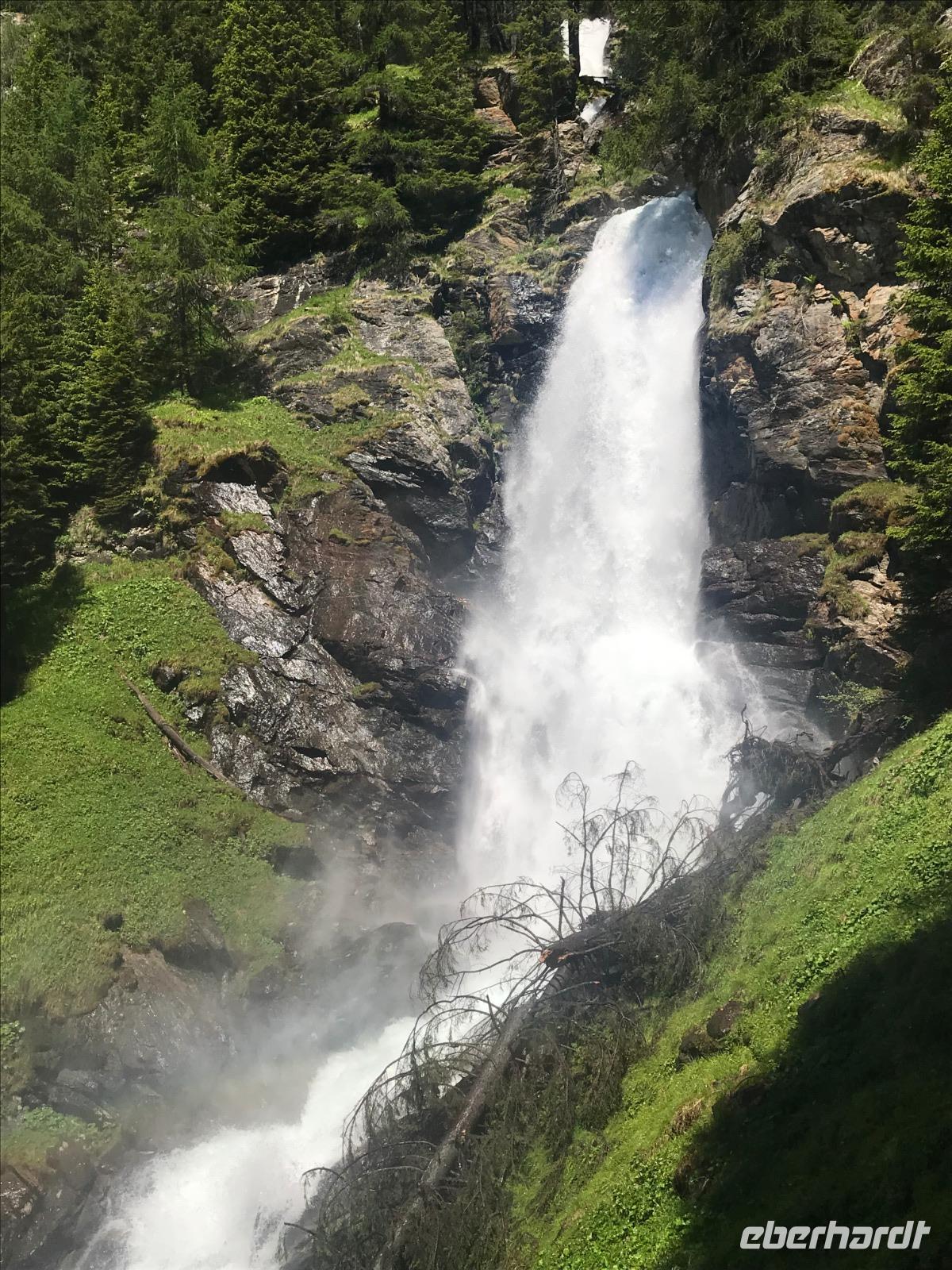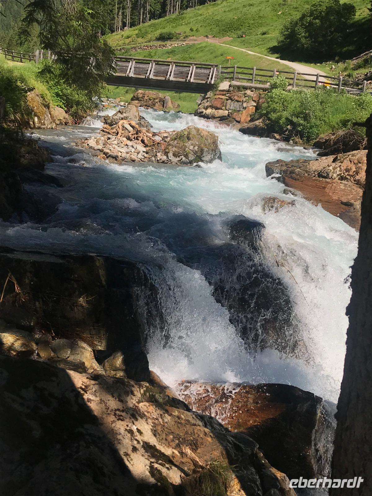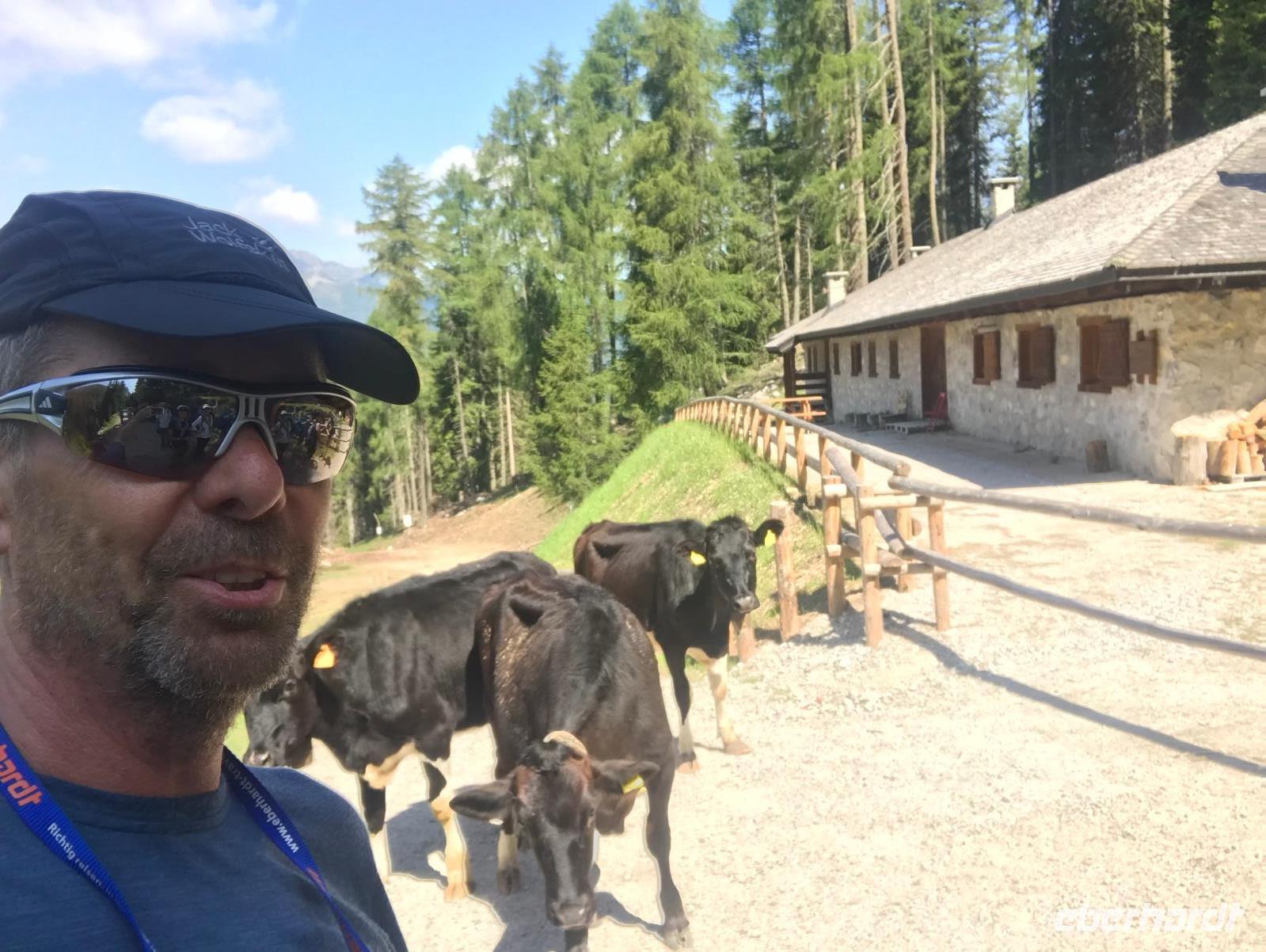 Los ging es am Campingplatz und schnell schützte uns der Wald vor der unerbittlichen Sonne. Die Strablaso Alm mit seiner schönen Hütte ignorierten wir vorerst, es zog uns hinauf zu den Wasserfällen. Der Weg wurde schmaler, führte über diverse Holzbrücken und das Rauschen der Cascate di Sent wurde immer lauter. Dann erlebten wir, wie das Wasser ins Tal schoss. Zwei Wasserfälle gab es zu bewundern. Hinter dem letzten Wasserfall erklommen wir noch eine Anhöhe und hielten Mittagsrast. Gestärkt ging es noch kurz in eine benachbarte Talsenke, wo sich atemberaubende Bergansichten boten. Zurück gab es einen alternativen Weg. So war der Abstieg sehr ruhig und ohne Gegenverkehr. Jetzt kehrten wir in der Hütte Malga Stablasolo im Val di Rabbi auf 1539 m Höhe ein.