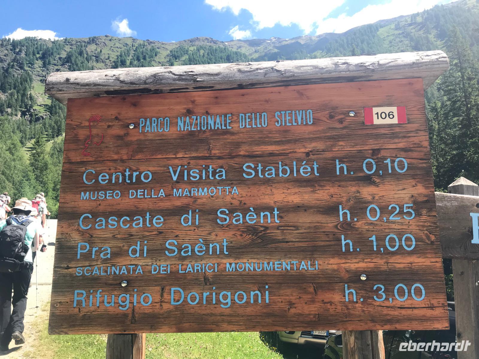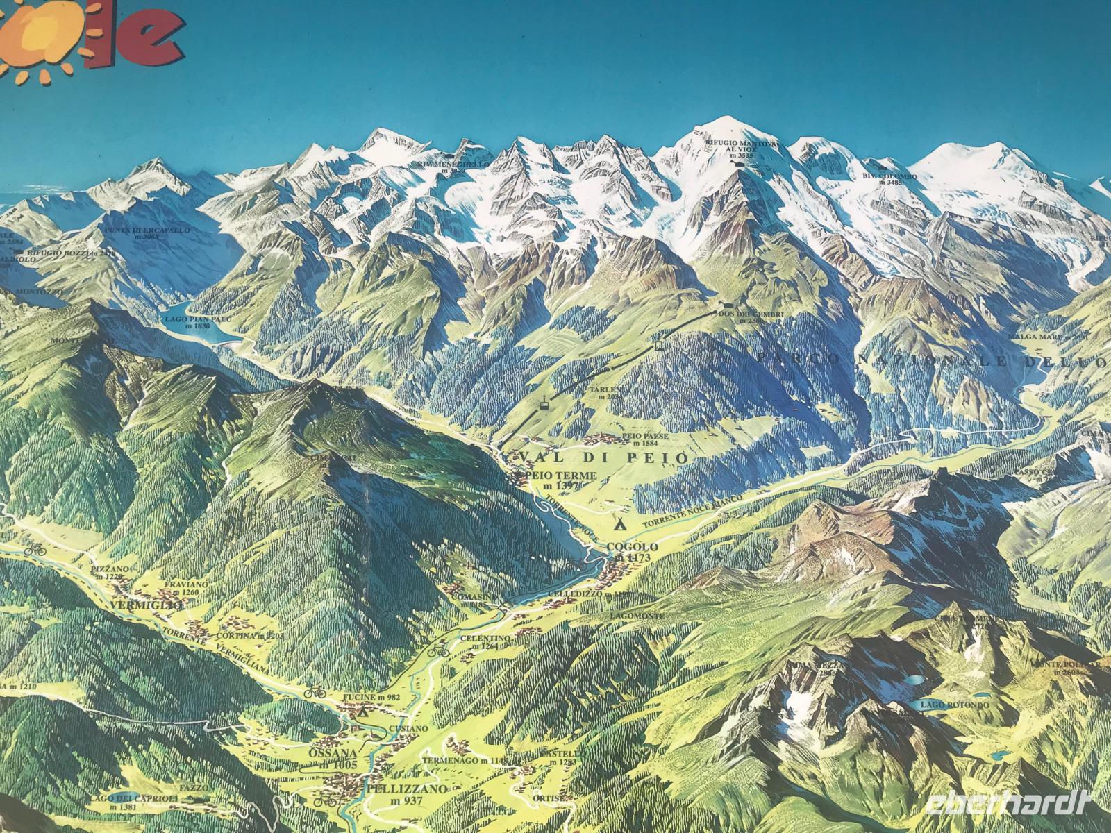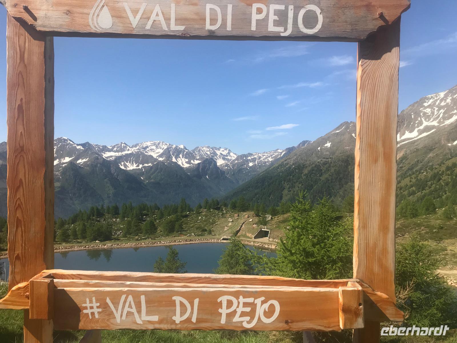 Kurz vor der Hauptstadt des Trentino Trient verließen wir bei Mezzocorona die Autostrada und bogen bei Mezzolombardo in das Val di Non ab, passierten den Stausee Santa Guistina und erreichten am frühen Abend das wunderschöne Tal der Sonne das Val di Sole. Eigentlich ist es auf Deutsch das Sulztal, aber umgangssprachlich hat man sich aus nachvollziehbaren Gründen auf die Sonne fixiert. Diese sollte uns die nächsten Tage auch komplett begleiten. Die Sonnenschutzcreme war neben den Wanderstöcken das begehrteste Produkt der Woche.