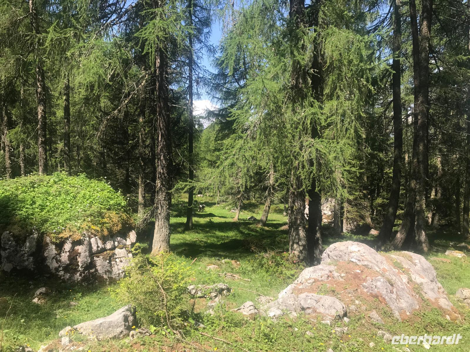 Nun konnte es losgehen. Ziel des ersten Tages war der wunderschöne Lago delle Malghette und zuerst führte es uns zum Rifugio Orso Bruno (2.200 m). Es war noch zu zeitig für eine Rast, aber für einen ausgiebigen Rundblick auf den nördlichen Teil der Brenta wurde gestoppt. Die leistungsstärkerer Gruppe machte nun einen Schlenker über den 2.170 m hoch gelegen Lago di Alto, wo eine ausgiebige Rast stattfand. Wir hatten uns auf Genusswandern eingestimmt und wollten uns von der italienischen Gelassenheit inspirieren lassen. Von dort an ging es zuerst über Wiesen und kleine Pfade und dann durch einen schönen Nadelwald bergab in Richtung Lago delle Malghette.