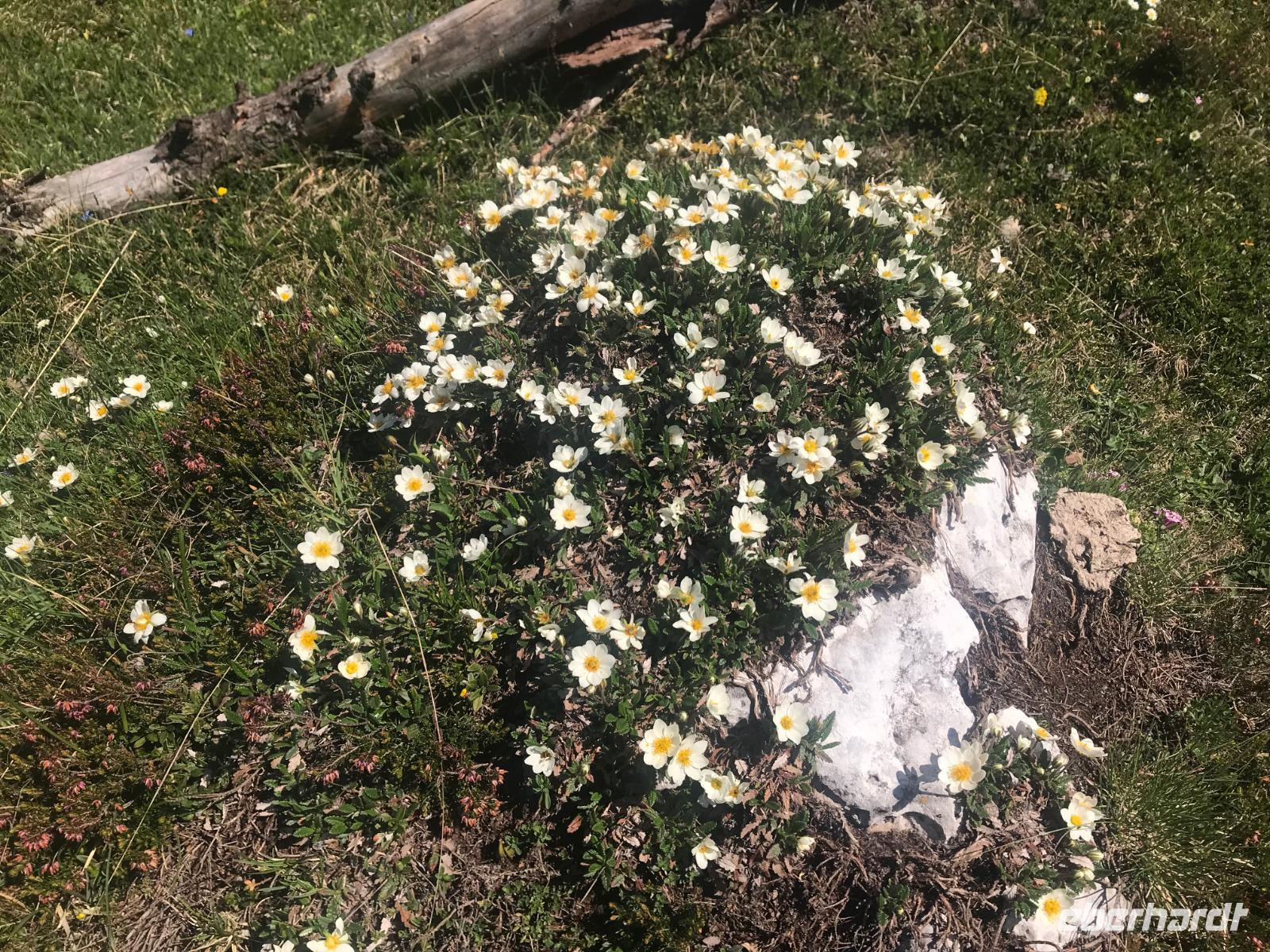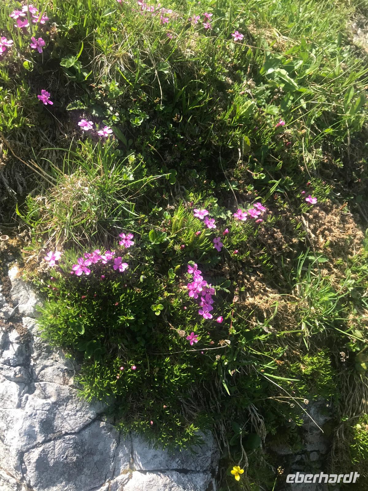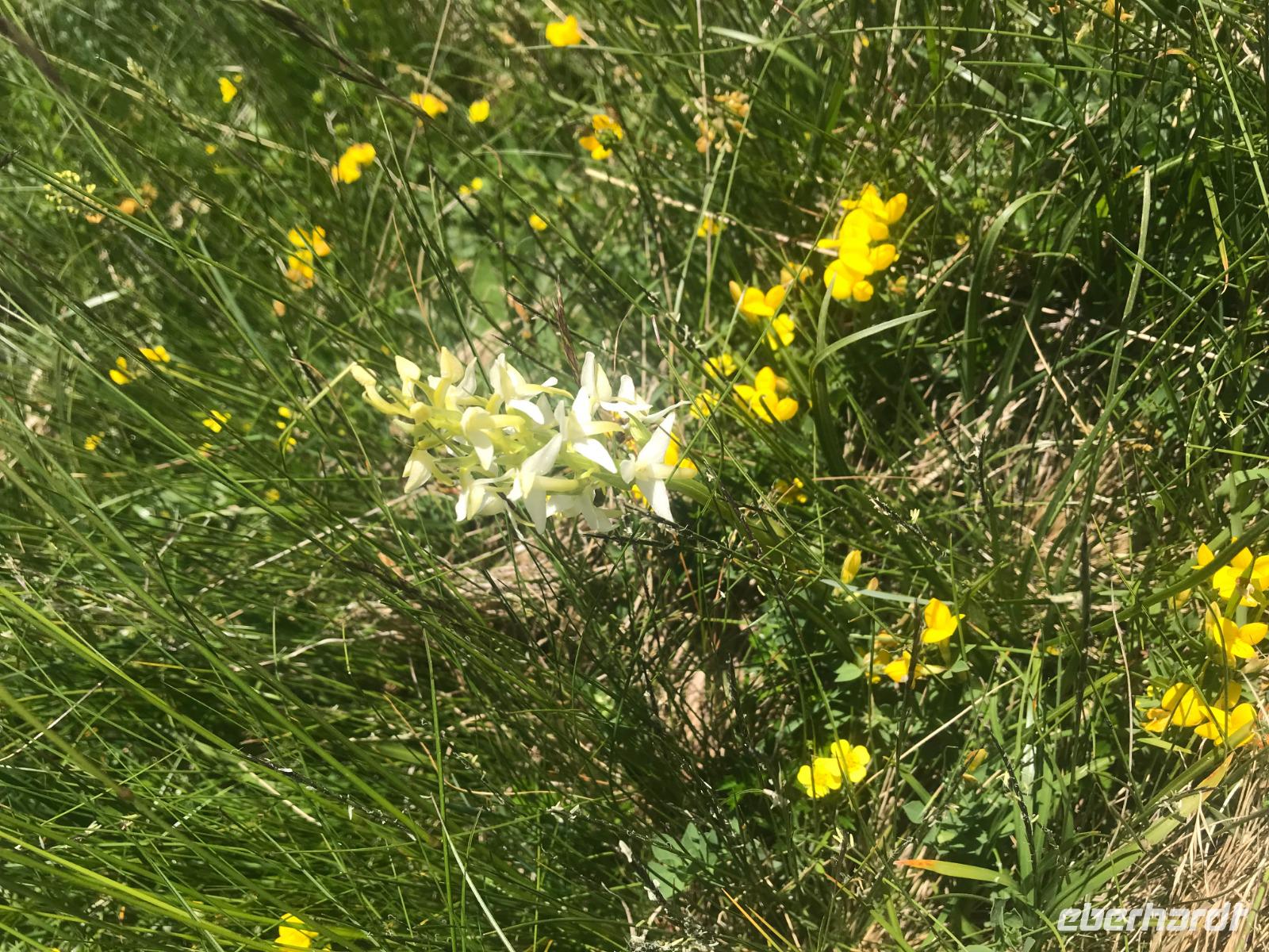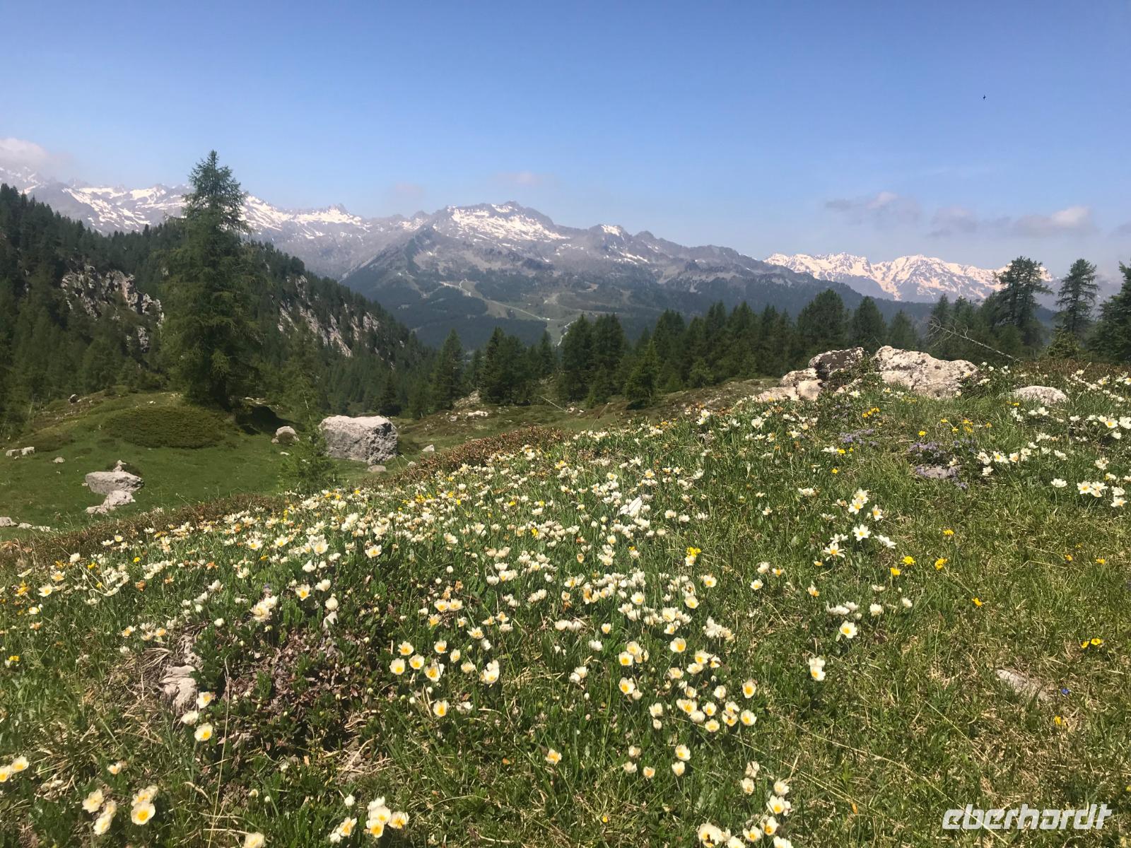 Die eine Gruppe fuhr bis zur Zwischenstation und drehte dort eine Runde zum Rifugio Boch. Die andere Gruppe stieg über Malga Vagliana (1.973m) und Dos del sparaver (2.140m) gleichfalls zur Hütte Rifugio Boch (2.085 m) auf. Der erste Teil der Wanderung führte uns immer südlich des Brentamassives (Pietra Grande) entlang. Das war sehr eindrucksvoll. Auch der Blick auf die Gegenseite (Cima Sella, Cima Brenta) war beeindruckend. Die Flora begeisterte uns schon die ersten Tage. Heute jedoch war eine unvorstellbare Vielfalt zu bestaunen. Es wurden heute wohl mehr Fotos von den Blumen, als von den Bergen gemacht.