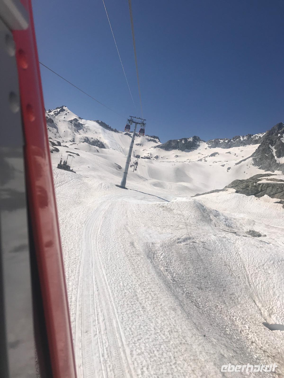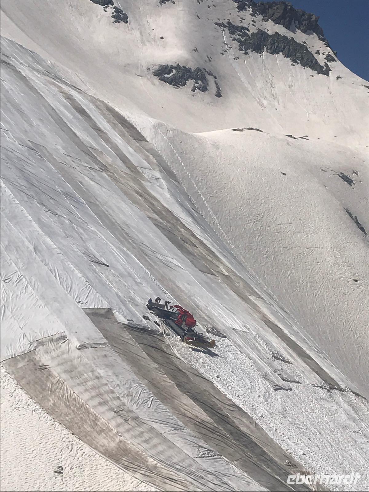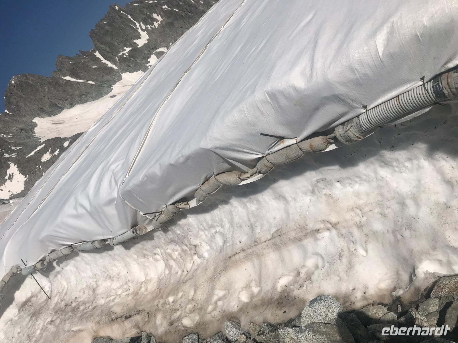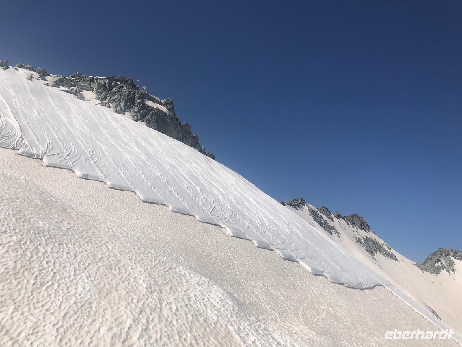 Interessant war zu beobachten, wie man versucht den Schnee vor der Sonne geschützt über den Sommer zu retten. Wir hatten das Glück dies nicht nur als Abdeckung registrieren zu können, sondern sahen auch die entsprechenden Arbeiten, die gerade ausgeführt wurden. In Steillage war das schon spannend.