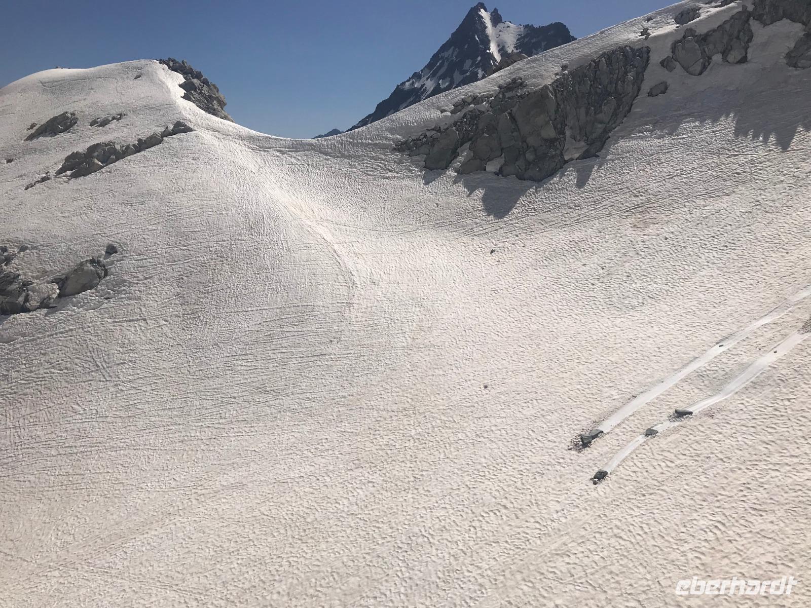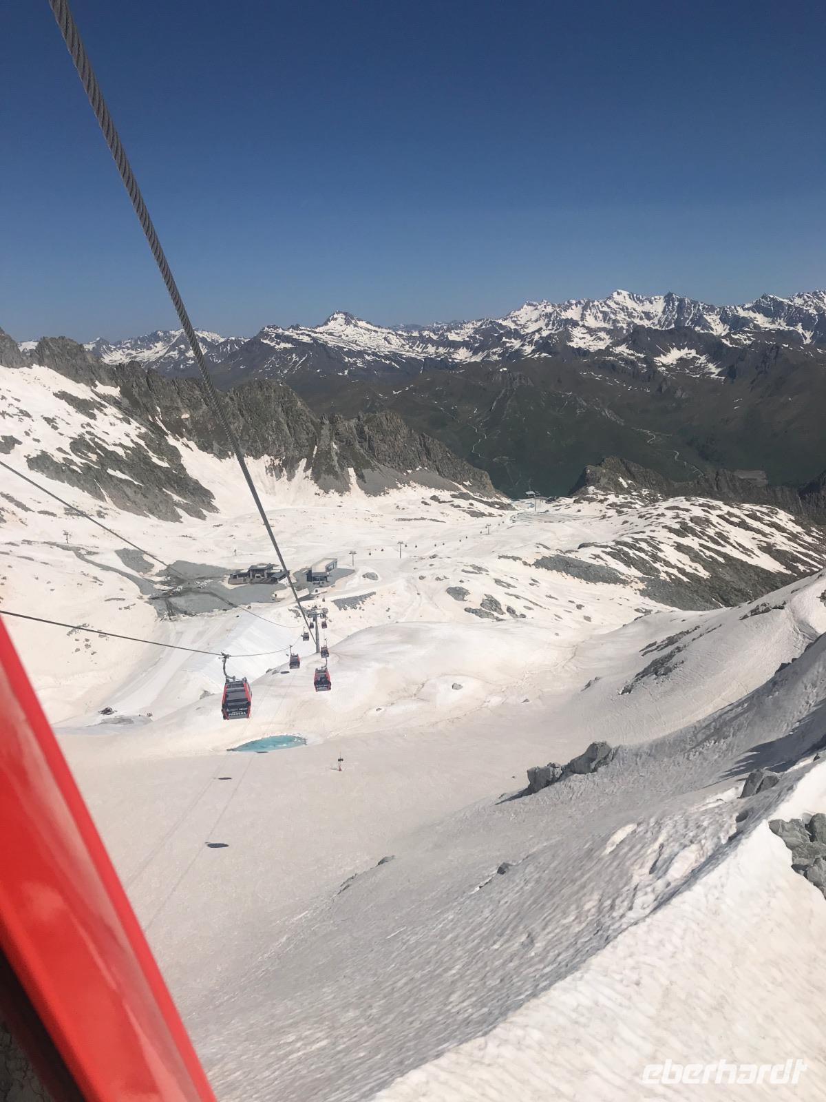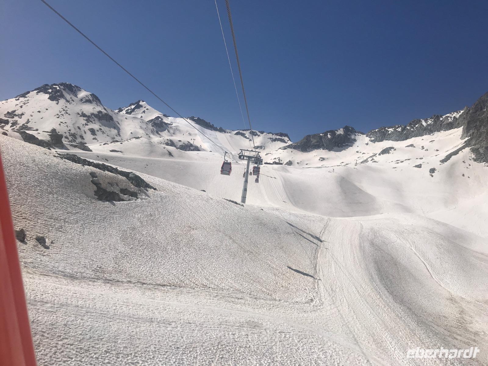 Interessant war zu beobachten, wie man versucht den Schnee vor der Sonne geschützt über den Sommer zu retten. Wir hatten das Glück dies nicht nur als Abdeckung registrieren zu können, sondern sahen auch die entsprechenden Arbeiten, die gerade ausgeführt wurden. In Steillage war das schon spannend.