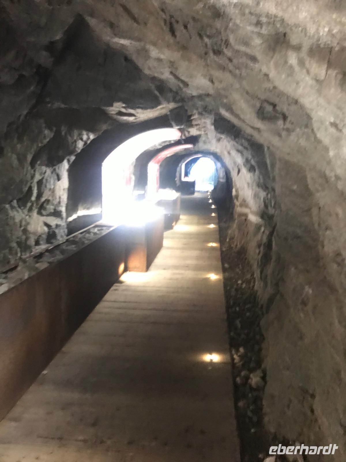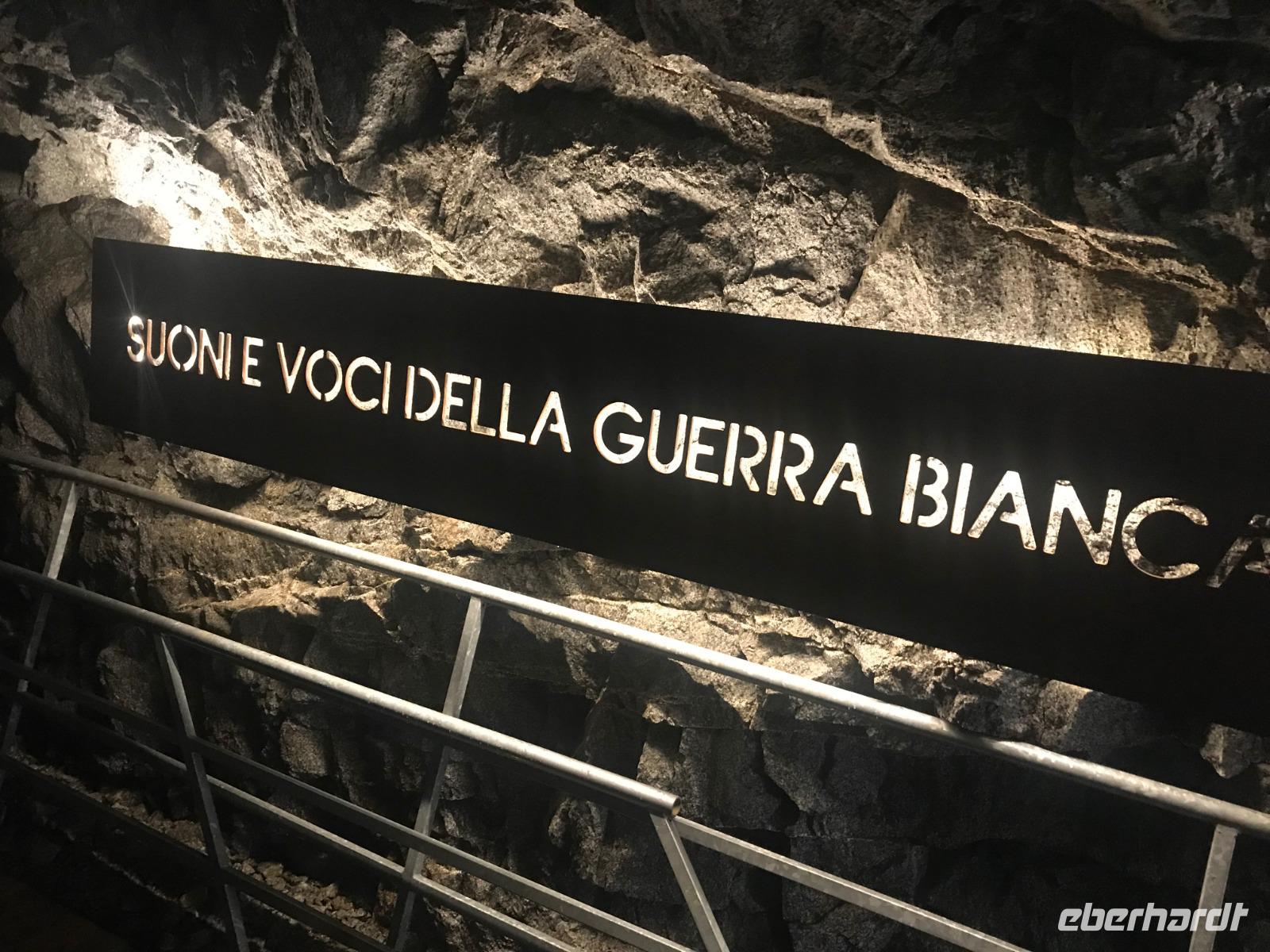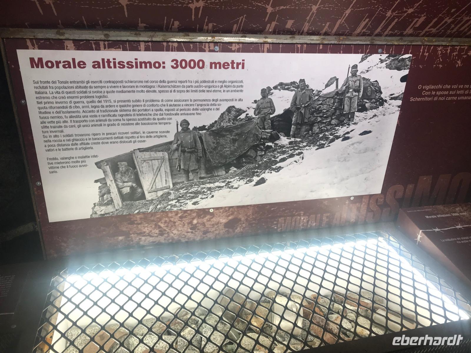 Auf der Talfahrt machten wir Station am Rif. Caoanna Presena. Wir besuchten die Ausstellung Suoni e voci delle Guerra Bianca (Klänge und Stimmen des weißen Krieges) zum ersten Weltkrieg in einem Bergstollen. Auch war an dieser Stelle Zeit für einen Cappuccino oder Espresso.