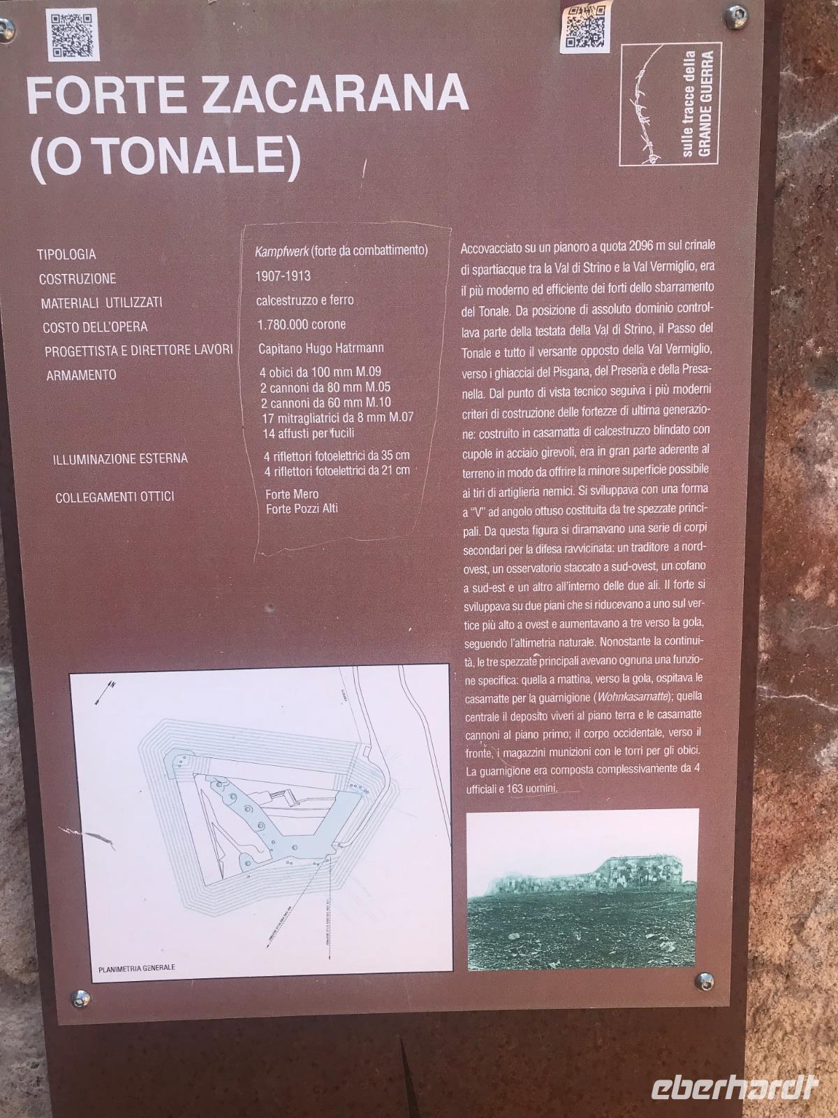 Die Kriegsbefestigung Fort Zaccarana (auch Saccarana) wurden zwischen 1910 und 1913 gebaut. Das Ziel der Österreicher war es die alte Straße und den Pass Tonale unter Kontrolle zu halten oder zu blockieren. Das Gebäude wurde aus Stahlbeton errichtet und mit einer Erdschicht bedeckt um Auswirkungen von eventuellen Explosionen zu dämpfen. Erst im Jahre 2010 wurden die Ruinen freigelegt und von der Vegetation befreit und somit erkennbar gemacht. Mit uns waren viele Schüler auf Geschichtsexkursion unterwegs.
