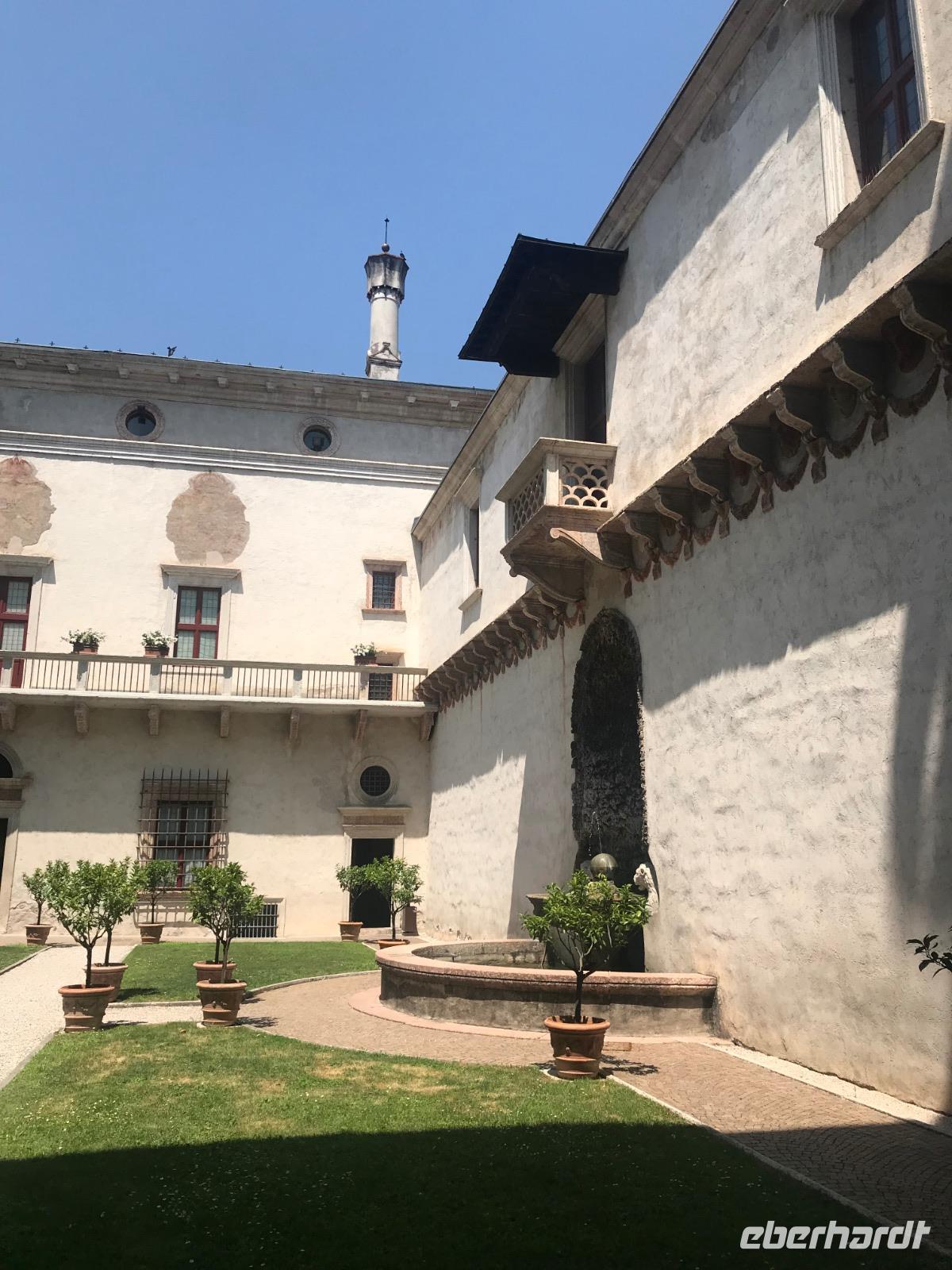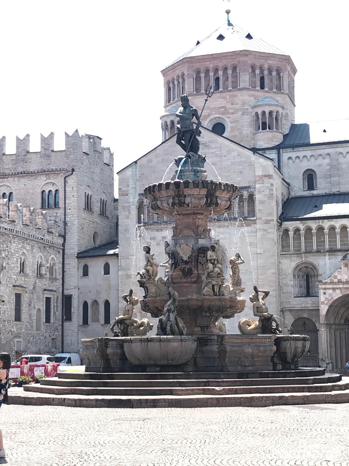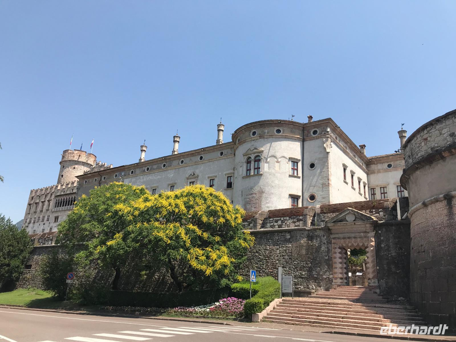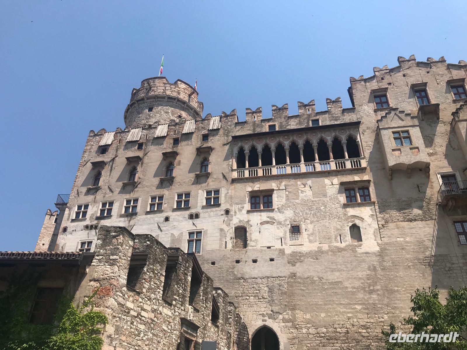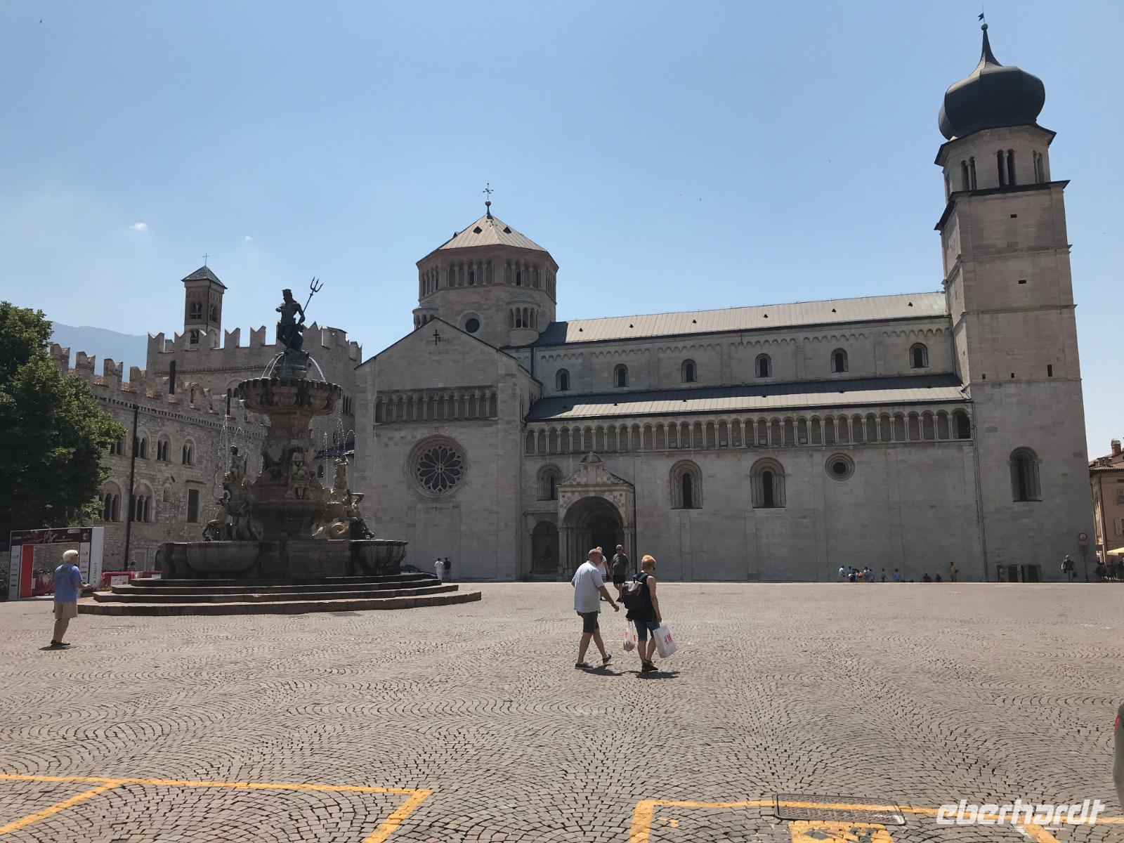 Frisch gestärkt ging es mit dem Zug 9:27 Uhr ab Daolasa (in unmittelbarer Nähe der Hotels) nach Trient. Wunderbare Fahrt in gut klimatisiertem Zug. Die Fahrt war kurzweilig und bot viele sehr abwechslungsreiche Ausblicke, z.B. auf den Lago di Santa Giustina, dem größten See der Region bei Cles. Dieser wurde zwischen 1943 und 1951 angelegt, reguliert die Noce, die Staumauer ist 152 m hoch und war seinerzeit die höchste Staumauer Europas. Kurz vor halb Zwölf erreichten wir die Hauptstadt des autonomen Gebietes Trentino. Anna, eine ehemalige Lehrerin aus Rovereto nahm uns am Bahnsteig in Empfang und führte uns 2 ¼ h durch die Stadt und das Castello. Trient ist nach Grenoble und Innsbruck mit 118.000 Einwohnern die drittgrößte Stadt der Alpen und in etwa so groß wie Jena oder Cottbus. Viele Palazzi und Kirchen konnten wir bewundern und wir erfuhren viel über Land, Leute und Architektur. Besonders in Erinnerung werden uns der Dom und das Castello del Buonconsiglio bleiben, von dem aus wir einen wunderbaren Blick auf die Stadt hatten.
