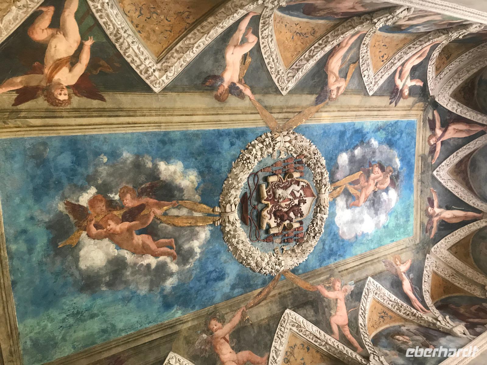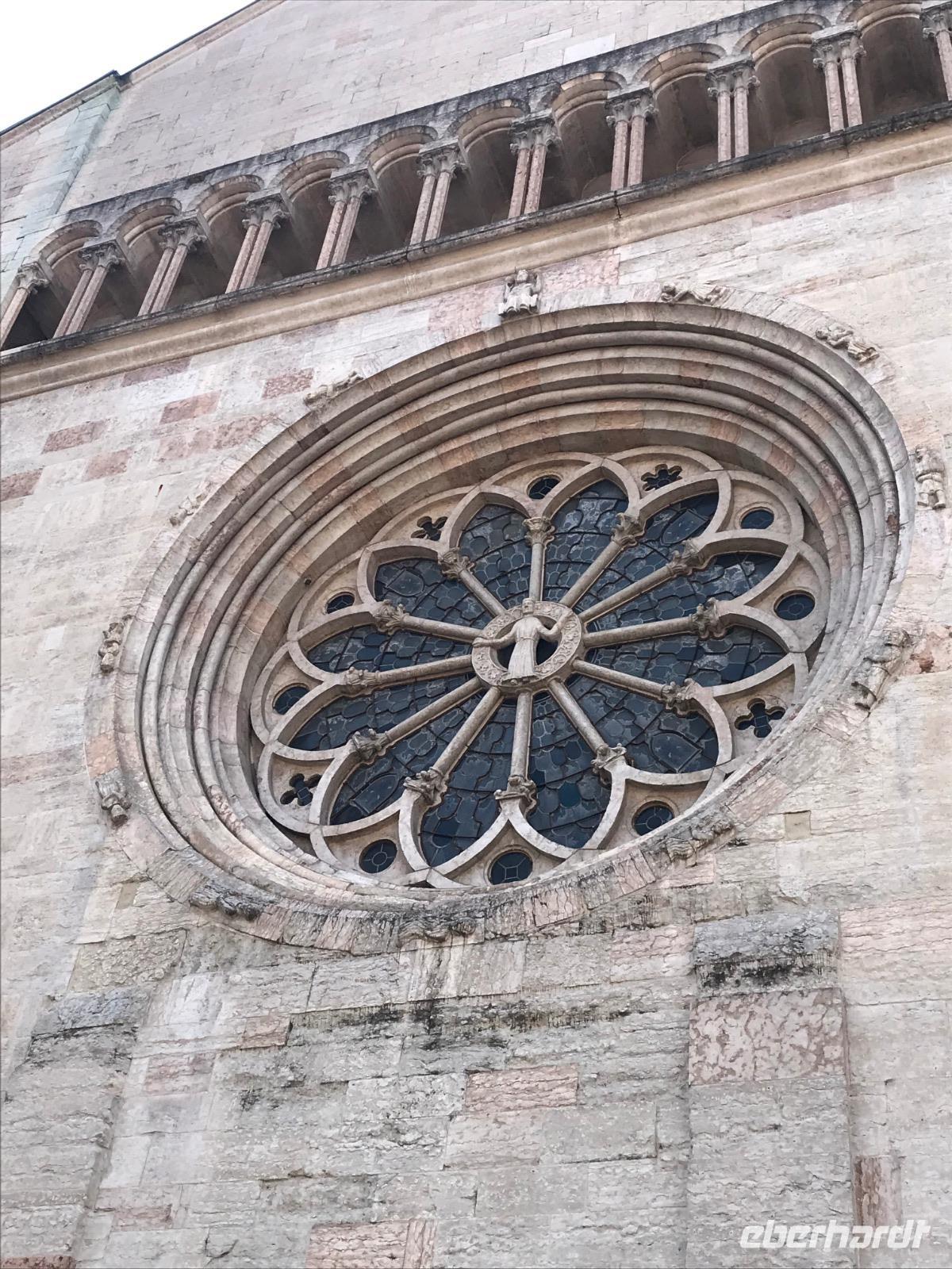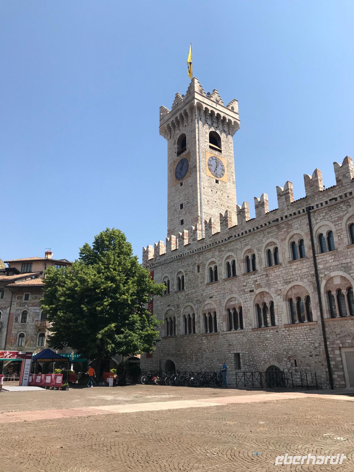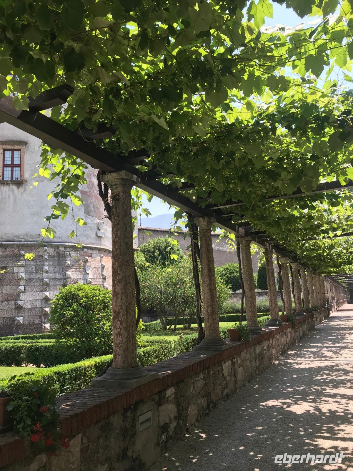 Frisch gestärkt ging es mit dem Zug 9:27 Uhr ab Daolasa (in unmittelbarer Nähe der Hotels) nach Trient. Wunderbare Fahrt in gut klimatisiertem Zug. Die Fahrt war kurzweilig und bot viele sehr abwechslungsreiche Ausblicke, z.B. auf den Lago di Santa Giustina, dem größten See der Region bei Cles. Dieser wurde zwischen 1943 und 1951 angelegt, reguliert die Noce, die Staumauer ist 152 m hoch und war seinerzeit die höchste Staumauer Europas. Kurz vor halb Zwölf erreichten wir die Hauptstadt des autonomen Gebietes Trentino. Anna, eine ehemalige Lehrerin aus Rovereto nahm uns am Bahnsteig in Empfang und führte uns 2 ¼ h durch die Stadt und das Castello. Trient ist nach Grenoble und Innsbruck mit 118.000 Einwohnern die drittgrößte Stadt der Alpen und in etwa so groß wie Jena oder Cottbus. Viele Palazzi und Kirchen konnten wir bewundern und wir erfuhren viel über Land, Leute und Architektur. Besonders in Erinnerung werden uns der Dom und das Castello del Buonconsiglio bleiben, von dem aus wir einen wunderbaren Blick auf die Stadt hatten.