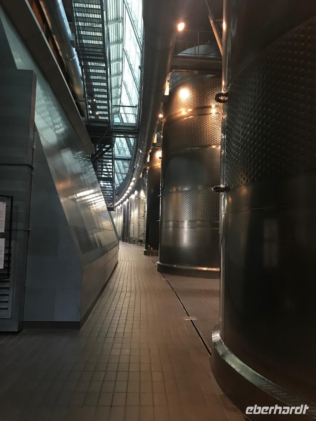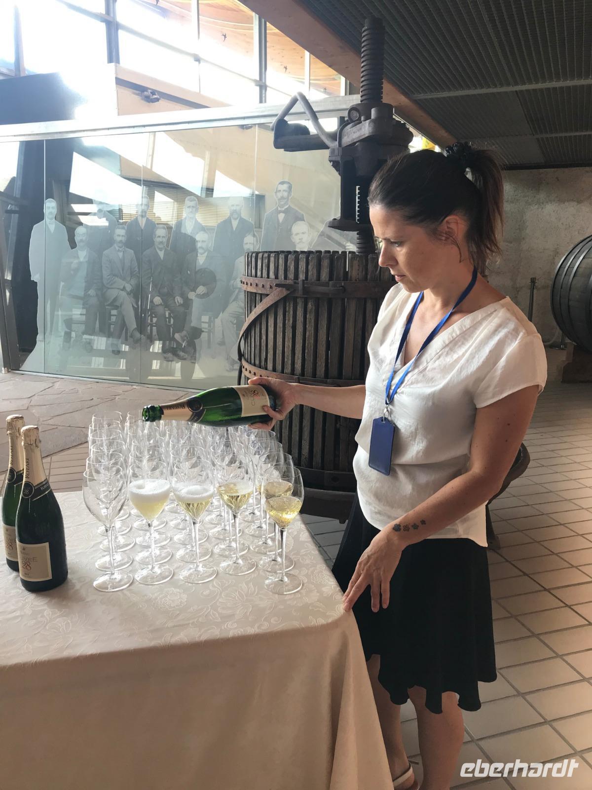 5 Sektsorten, 6 Weiß- und 5 Rotweine werden hier gekeltert. Beeindruckend waren die Abfüllanlagen (die Größte schafft 12.000 Flaschen in der Stunde!) und die Anlage, die die Sektflaschen beim Reifeprozeß automatisch dreht.