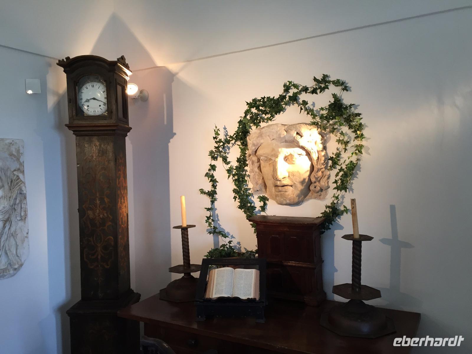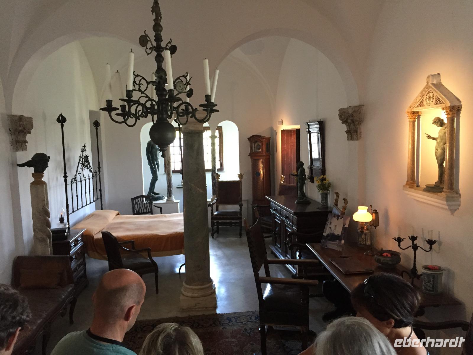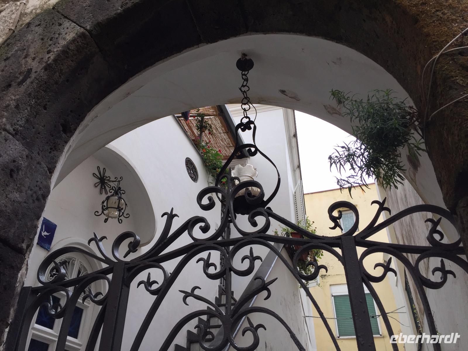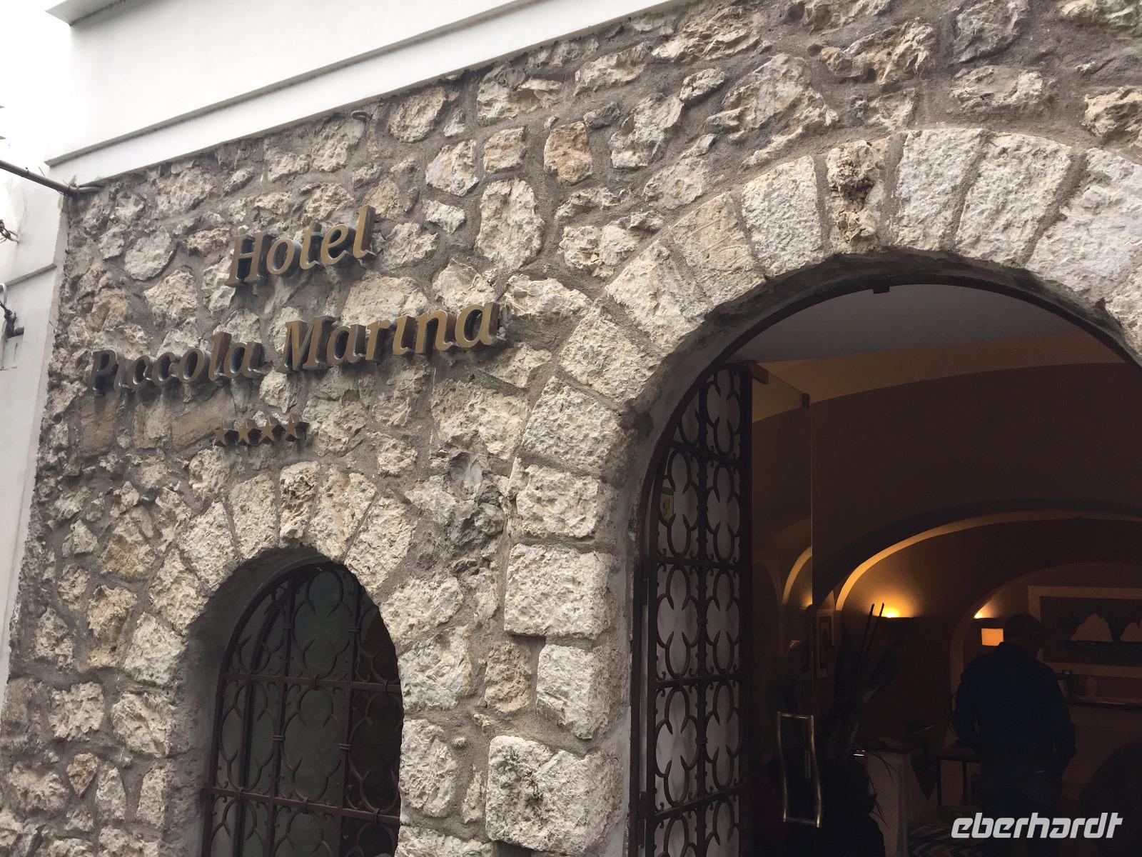 Unser Gepäck wird uns abgenommen und zum Hotel gebracht. So können wir mit der Standseilbahn (Funivia) hinauf nach Capri-Stadt fahren und einen ersten orientierenden Spaziergang unternehmen. Vom zentralen Treffpunkt, der Piazzetta schlendern wir über die Hauptstraße Via Roma in ca. 10 Minuten zum 4-Sterne-Boutique-Hotel „della Piccola Marina", ganz unscheinbar in einer kleinen Seitengasse auf dem Weg zur gleichnamigen Marina. Herzlich werden wir empfangen und beziehen unsere Zimmer. Wir gönnen uns ein wenig Ruhe und treffen uns zum ersten gemeinsamen Abendessen in einem Restaurant in der Nähe des Hotels. Bei gutem Wein, einer Pizza, Pasta oder fangfrischem Fisch stimmen wir uns auf eine erlebnisreiche Reise ein - den ausgeflippten Restaurantchef werden wir wohl nicht mehr vergessen.