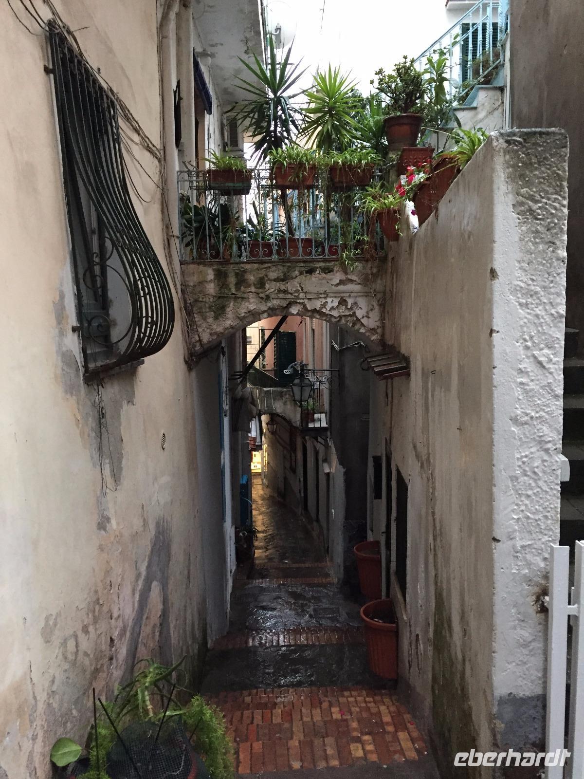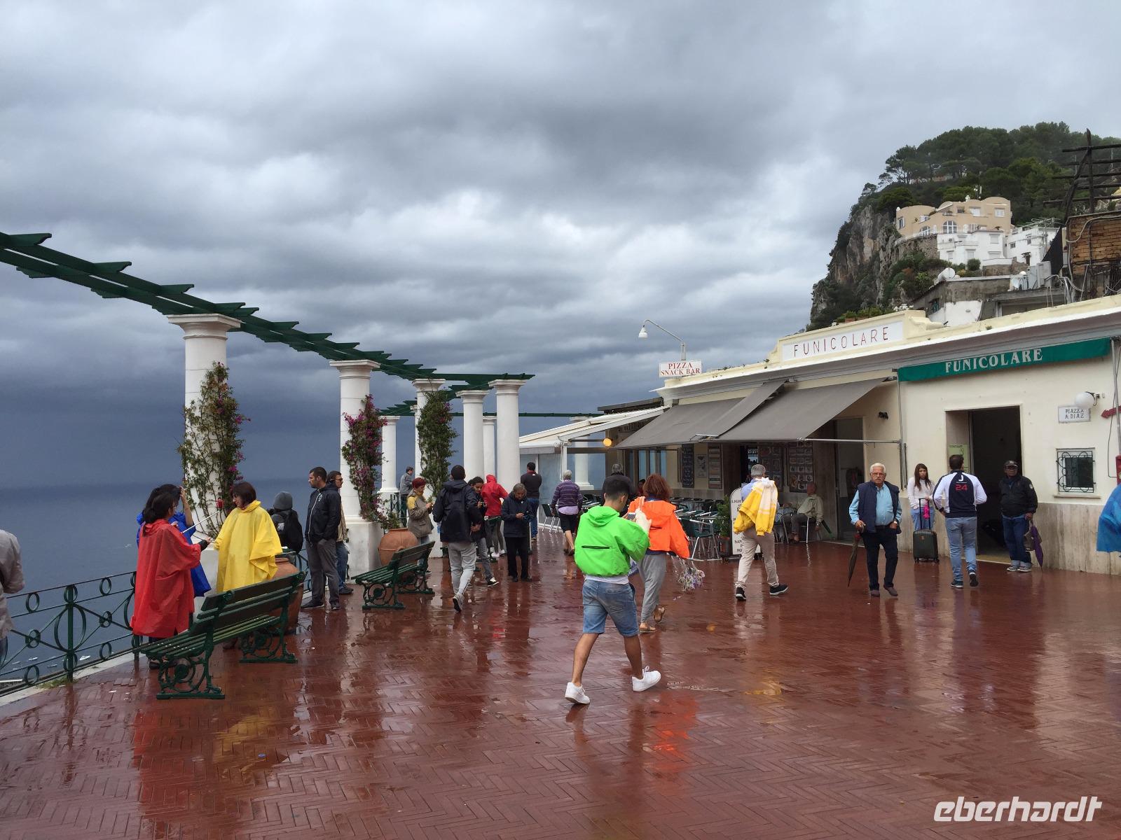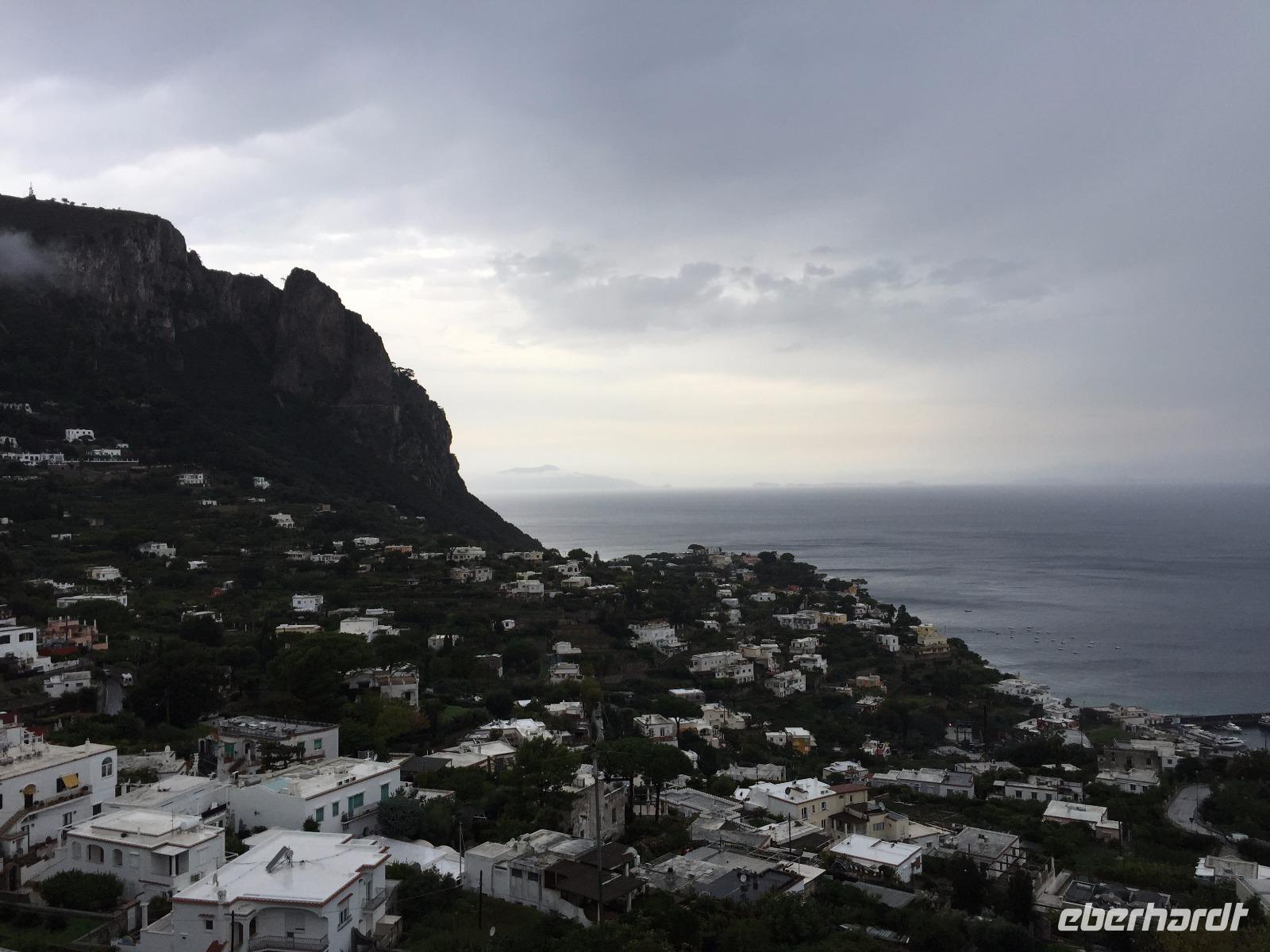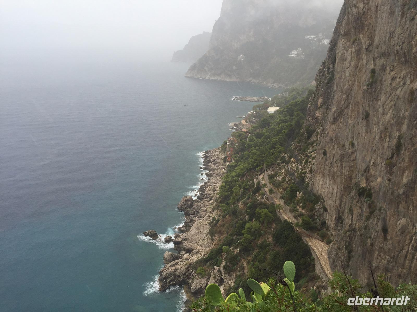 Da der Regen leider nicht nachlassen will und wir uns schon nicht mehr wohl fühlen in unseren durchnässten Schuhen, beenden wir die Führung hier und ziehen die Freizeit der kommenden Tage einfach vor. Wir haben ja immerhin noch 2 volle Tage auf der Insel vor uns und müssen nicht heute Abend wieder zurück aufs Festland (wie 90% der Capri-Besucher).