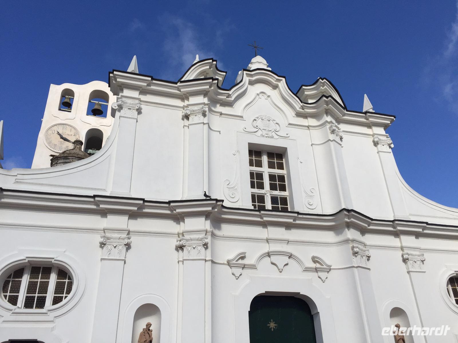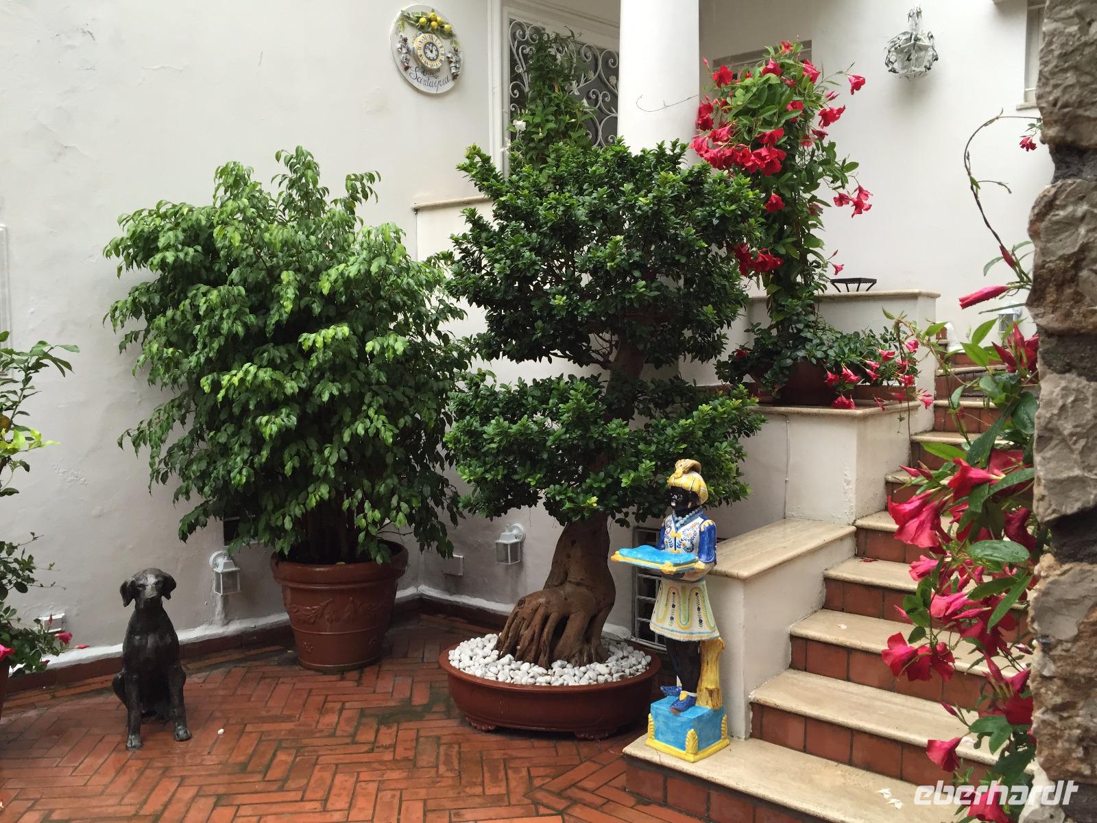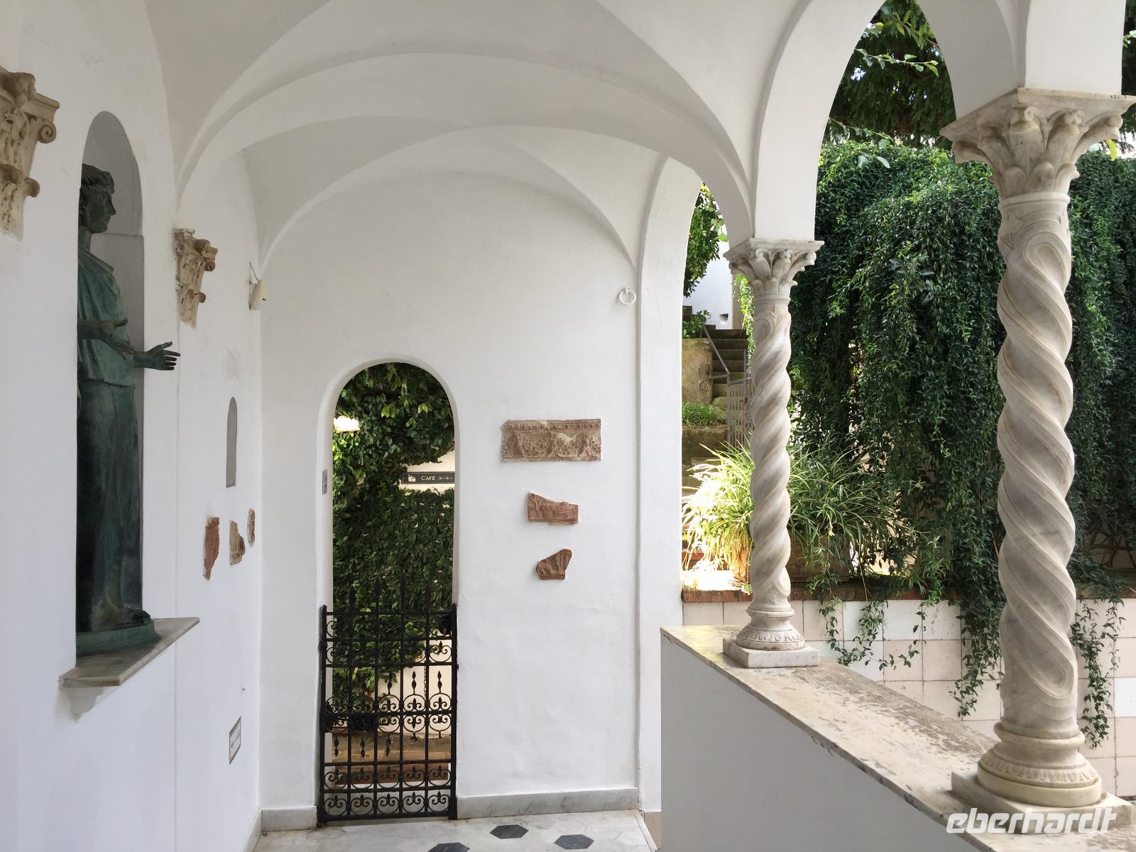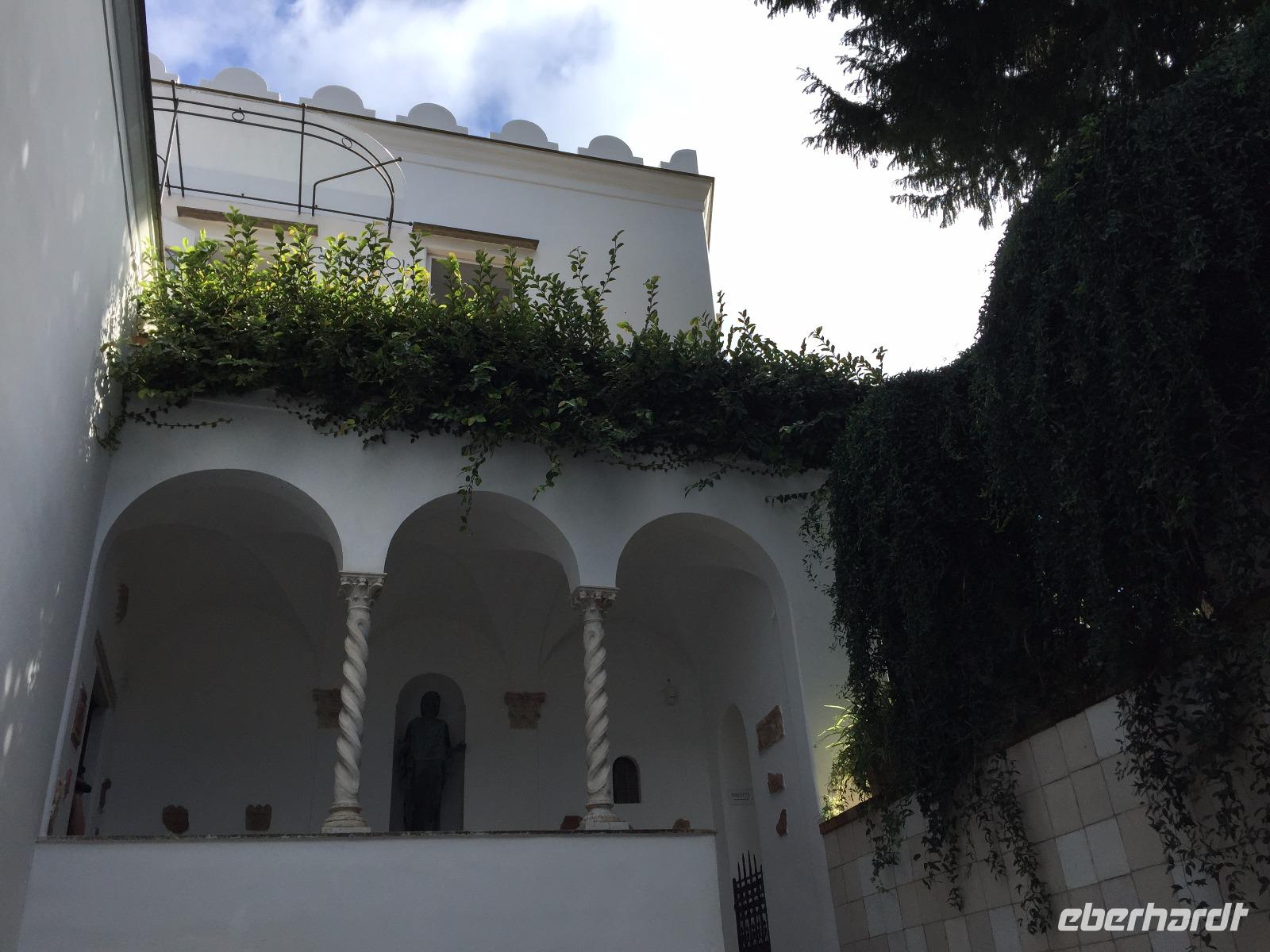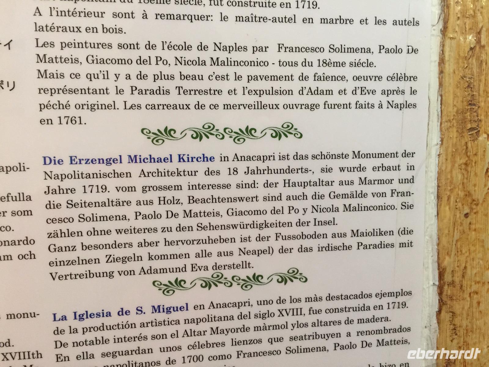 Endlich! Kein Regen und die Sonnenstrahlen stimmen uns auf einen schönen Tag in Anacapri ein. Annamaria treffen wir am kleinen Busbahnhof. Mit einem kleinen, orangen Inselbus fahren wir in wenigen Minuten über die Serpentinenstraße, die auch „Mamma-Mia-Straße" genannt wird, hinauf nach Anacapri. Zunächst machen wir einen gemütlichen Spaziergang durch Anacapri, welches noch etwas verschlafen wirkt. Anacapri ist das Pendant zu Capri-Stadt, hoch oben auf dem Plateau auf 275 Metern. Wir spazieren vorbei am Casa Rossa (rotes Haus), welches zwischen 1876 und 1898 von dem amerikanischen Oberst J.C. MacKowen erbaut wurde und den Aragonesischen Turm umschließt. Leider ist es heute geschlossen und wir können die Gemäldesammlung im Inneren nicht sehen. Unser nächster Besichtigungspunkt ist die Kirche von San Michele. Sie ist ein bedeutender Kunstschatz der Insel Capri und eine der beeindruckendsten Kirchen in Kampanien. Sie liegt an einem hübschen kleinen Platz zwischen den ruhigeren Straßen von Anacapri, weit entfernt vom geschäftigen Treiben auf der Piazzetta von Capri. Von außen ganz unscheinbar, beherbergt sie einen wahren Schatz - der wunderbare, mit handgemalten Keramikfliesen bedeckte Boden im Kirchenschiff. Jeden Zentimeter von ihm bedeckt eine große Szene, die die Vertreibung von Adam und Eva aus dem Paradies darstellt. Die dramatische Szene spielt sich in einer üppigen Kulisse aus Bäumen, Pflanzen und allen möglichen Tieren ab. Dieser bestens erhaltene Boden stammt aus dem Jahr 1761 und wurde von Leonardo Chiaiese, einem der besten Keramikkünstler in Neapel des 18. Jahrhunderts, erschaffen. Wir schlendern weiter in den Gassen von Anacapri und kommen in das Viertel Le Boffe, dem ältesten Teil des Ortes. Nach einer Begegnung mit einem frechen Papagei erreichen wir die schneeweiße Kirche der Heiligen Sofia, wo wir eine kleine Pause einlegen.