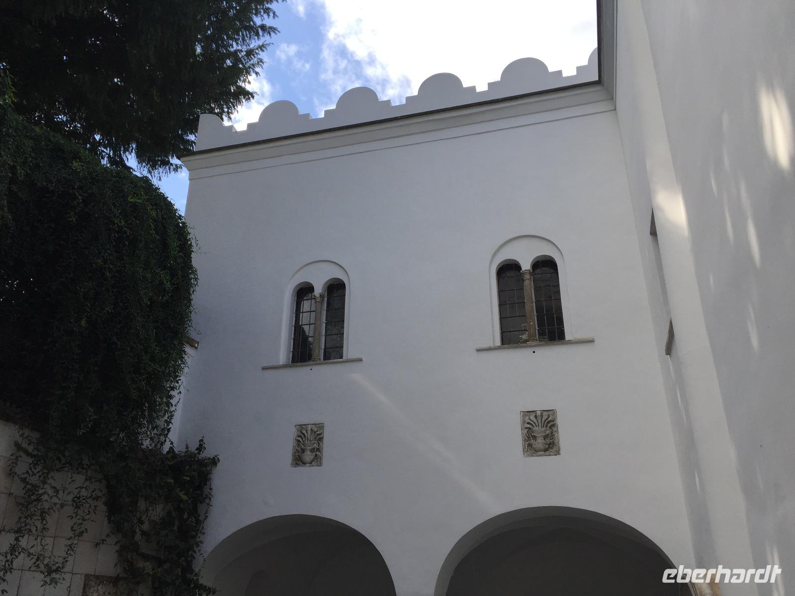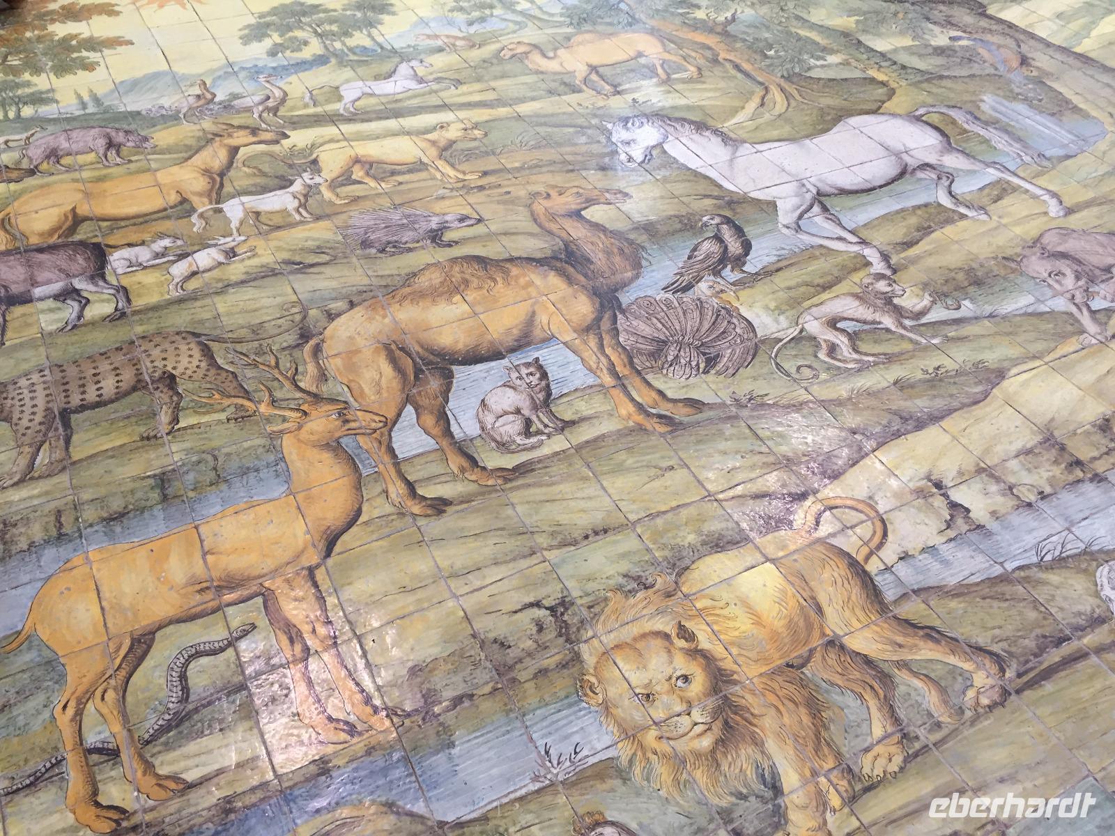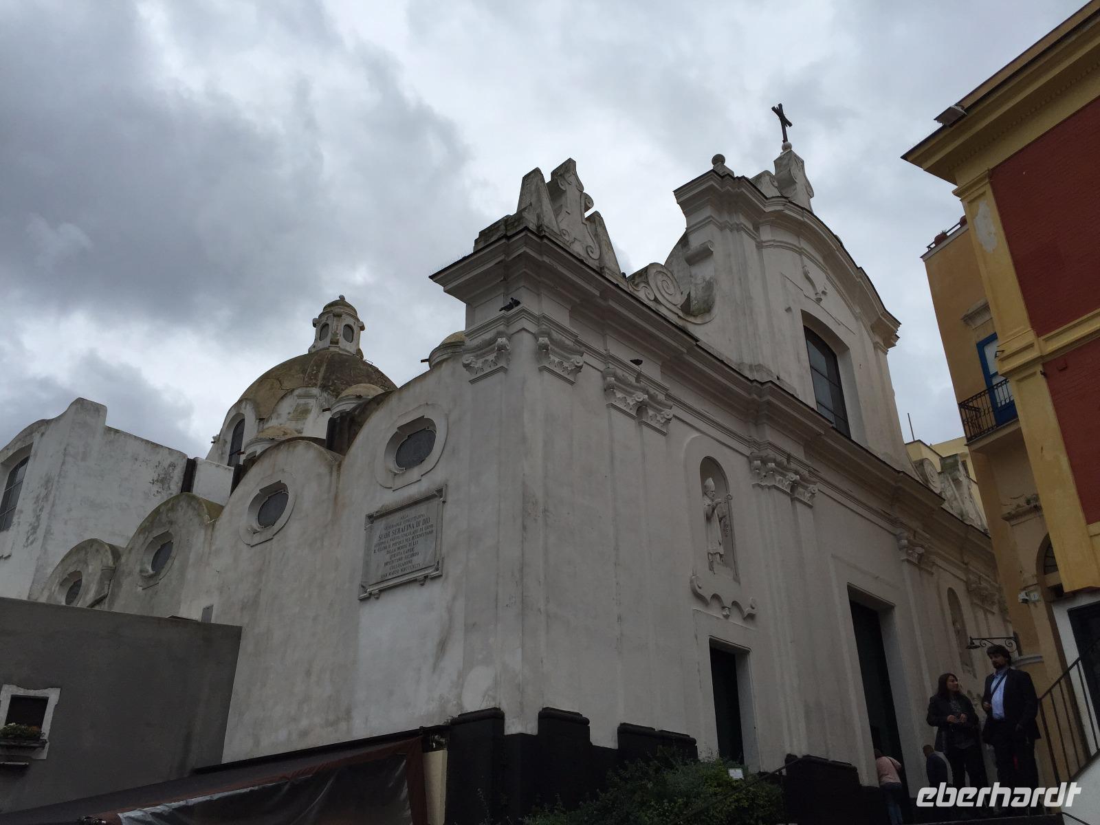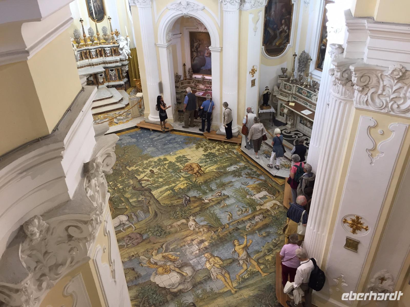 Endlich! Kein Regen und die Sonnenstrahlen stimmen uns auf einen schönen Tag in Anacapri ein. Annamaria treffen wir am kleinen Busbahnhof. Mit einem kleinen, orangen Inselbus fahren wir in wenigen Minuten über die Serpentinenstraße, die auch „Mamma-Mia-Straße" genannt wird, hinauf nach Anacapri. Zunächst machen wir einen gemütlichen Spaziergang durch Anacapri, welches noch etwas verschlafen wirkt. Anacapri ist das Pendant zu Capri-Stadt, hoch oben auf dem Plateau auf 275 Metern. Wir spazieren vorbei am Casa Rossa (rotes Haus), welches zwischen 1876 und 1898 von dem amerikanischen Oberst J.C. MacKowen erbaut wurde und den Aragonesischen Turm umschließt. Leider ist es heute geschlossen und wir können die Gemäldesammlung im Inneren nicht sehen. Unser nächster Besichtigungspunkt ist die Kirche von San Michele. Sie ist ein bedeutender Kunstschatz der Insel Capri und eine der beeindruckendsten Kirchen in Kampanien. Sie liegt an einem hübschen kleinen Platz zwischen den ruhigeren Straßen von Anacapri, weit entfernt vom geschäftigen Treiben auf der Piazzetta von Capri. Von außen ganz unscheinbar, beherbergt sie einen wahren Schatz - der wunderbare, mit handgemalten Keramikfliesen bedeckte Boden im Kirchenschiff. Jeden Zentimeter von ihm bedeckt eine große Szene, die die Vertreibung von Adam und Eva aus dem Paradies darstellt. Die dramatische Szene spielt sich in einer üppigen Kulisse aus Bäumen, Pflanzen und allen möglichen Tieren ab. Dieser bestens erhaltene Boden stammt aus dem Jahr 1761 und wurde von Leonardo Chiaiese, einem der besten Keramikkünstler in Neapel des 18. Jahrhunderts, erschaffen. Wir schlendern weiter in den Gassen von Anacapri und kommen in das Viertel Le Boffe, dem ältesten Teil des Ortes. Nach einer Begegnung mit einem frechen Papagei erreichen wir die schneeweiße Kirche der Heiligen Sofia, wo wir eine kleine Pause einlegen.