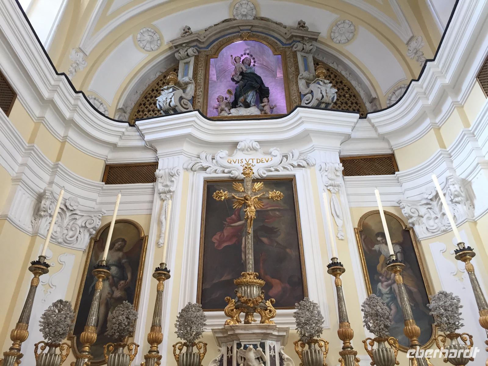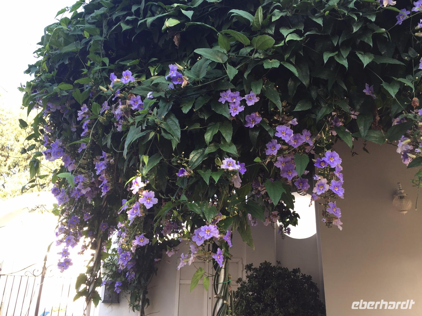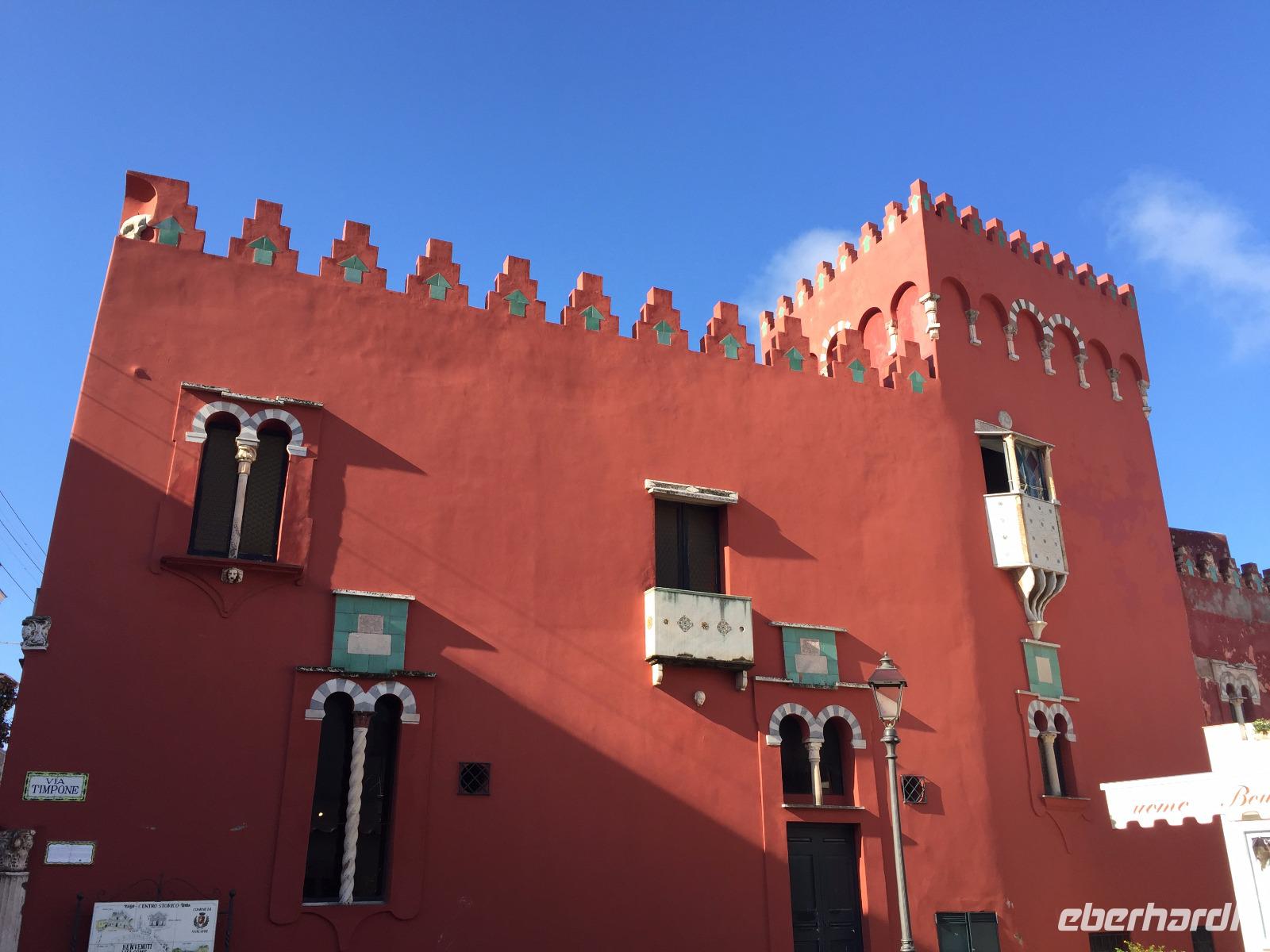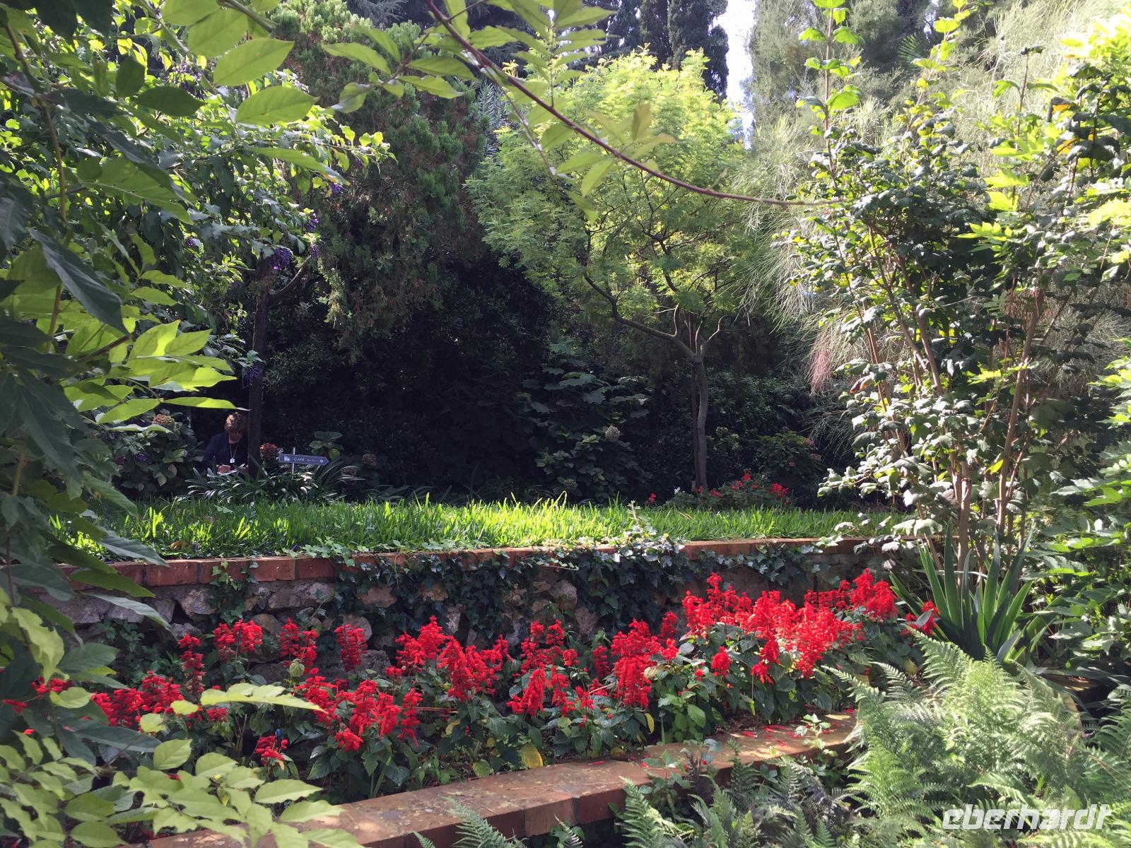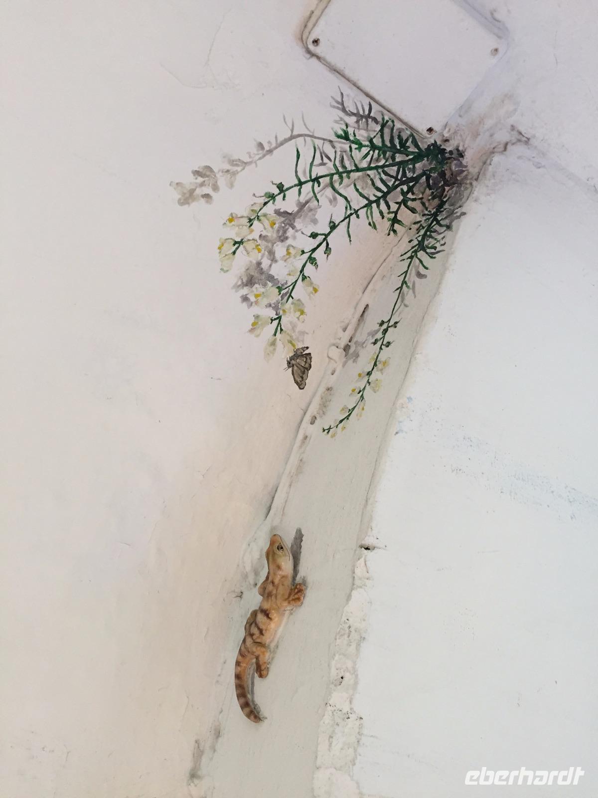 Endlich! Kein Regen und die Sonnenstrahlen stimmen uns auf einen schönen Tag in Anacapri ein. Annamaria treffen wir am kleinen Busbahnhof. Mit einem kleinen, orangen Inselbus fahren wir in wenigen Minuten über die Serpentinenstraße, die auch „Mamma-Mia-Straße" genannt wird, hinauf nach Anacapri. Zunächst machen wir einen gemütlichen Spaziergang durch Anacapri, welches noch etwas verschlafen wirkt. Anacapri ist das Pendant zu Capri-Stadt, hoch oben auf dem Plateau auf 275 Metern. Wir spazieren vorbei am Casa Rossa (rotes Haus), welches zwischen 1876 und 1898 von dem amerikanischen Oberst J.C. MacKowen erbaut wurde und den Aragonesischen Turm umschließt. Leider ist es heute geschlossen und wir können die Gemäldesammlung im Inneren nicht sehen. Unser nächster Besichtigungspunkt ist die Kirche von San Michele. Sie ist ein bedeutender Kunstschatz der Insel Capri und eine der beeindruckendsten Kirchen in Kampanien. Sie liegt an einem hübschen kleinen Platz zwischen den ruhigeren Straßen von Anacapri, weit entfernt vom geschäftigen Treiben auf der Piazzetta von Capri. Von außen ganz unscheinbar, beherbergt sie einen wahren Schatz - der wunderbare, mit handgemalten Keramikfliesen bedeckte Boden im Kirchenschiff. Jeden Zentimeter von ihm bedeckt eine große Szene, die die Vertreibung von Adam und Eva aus dem Paradies darstellt. Die dramatische Szene spielt sich in einer üppigen Kulisse aus Bäumen, Pflanzen und allen möglichen Tieren ab. Dieser bestens erhaltene Boden stammt aus dem Jahr 1761 und wurde von Leonardo Chiaiese, einem der besten Keramikkünstler in Neapel des 18. Jahrhunderts, erschaffen. Wir schlendern weiter in den Gassen von Anacapri und kommen in das Viertel Le Boffe, dem ältesten Teil des Ortes. Nach einer Begegnung mit einem frechen Papagei erreichen wir die schneeweiße Kirche der Heiligen Sofia, wo wir eine kleine Pause einlegen.